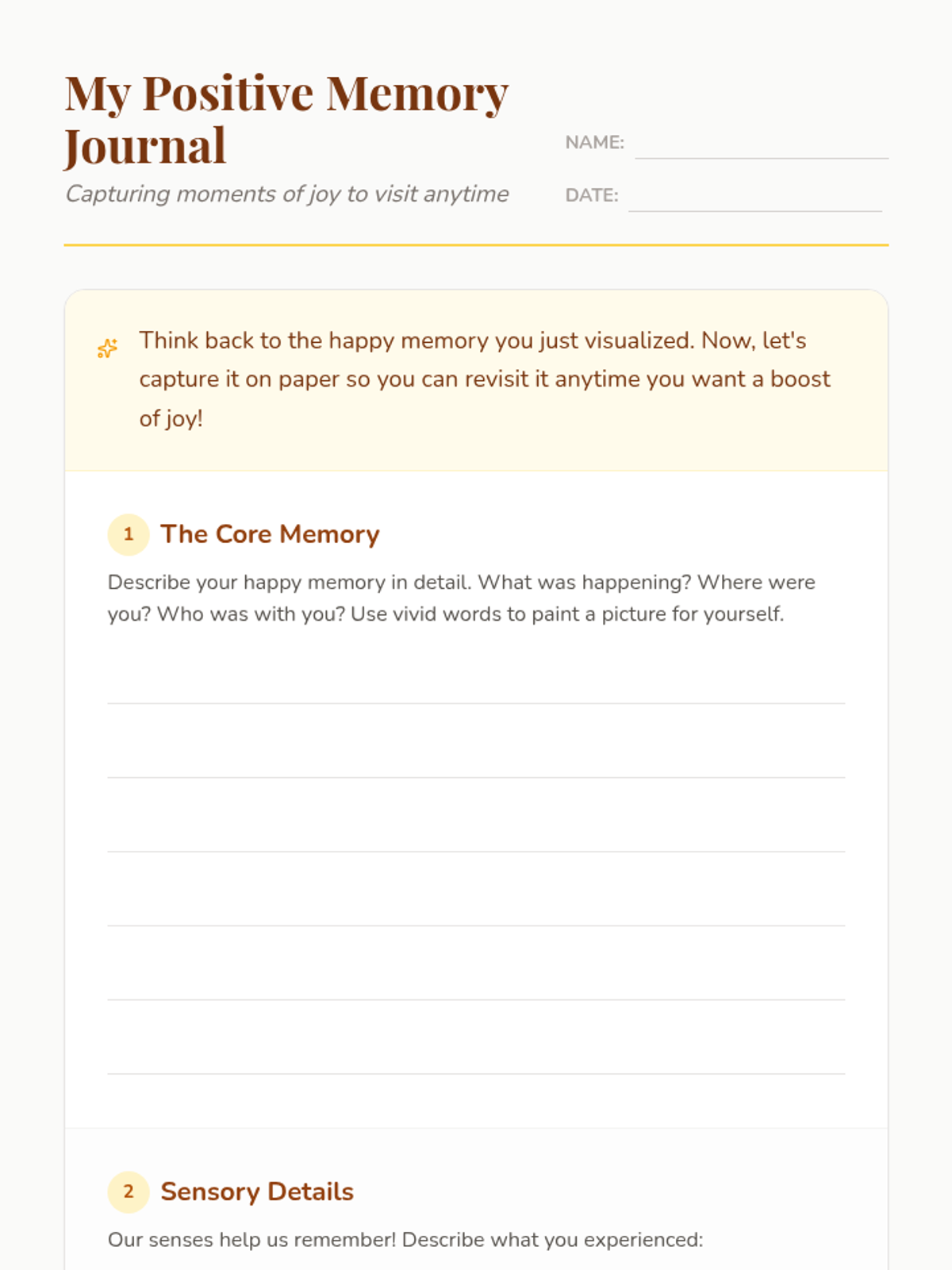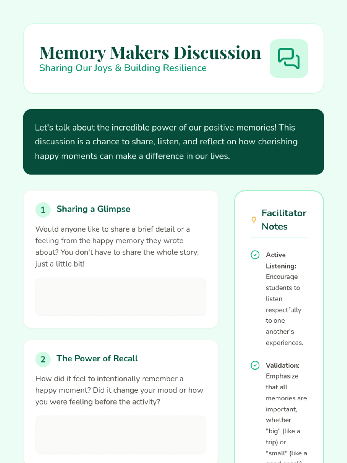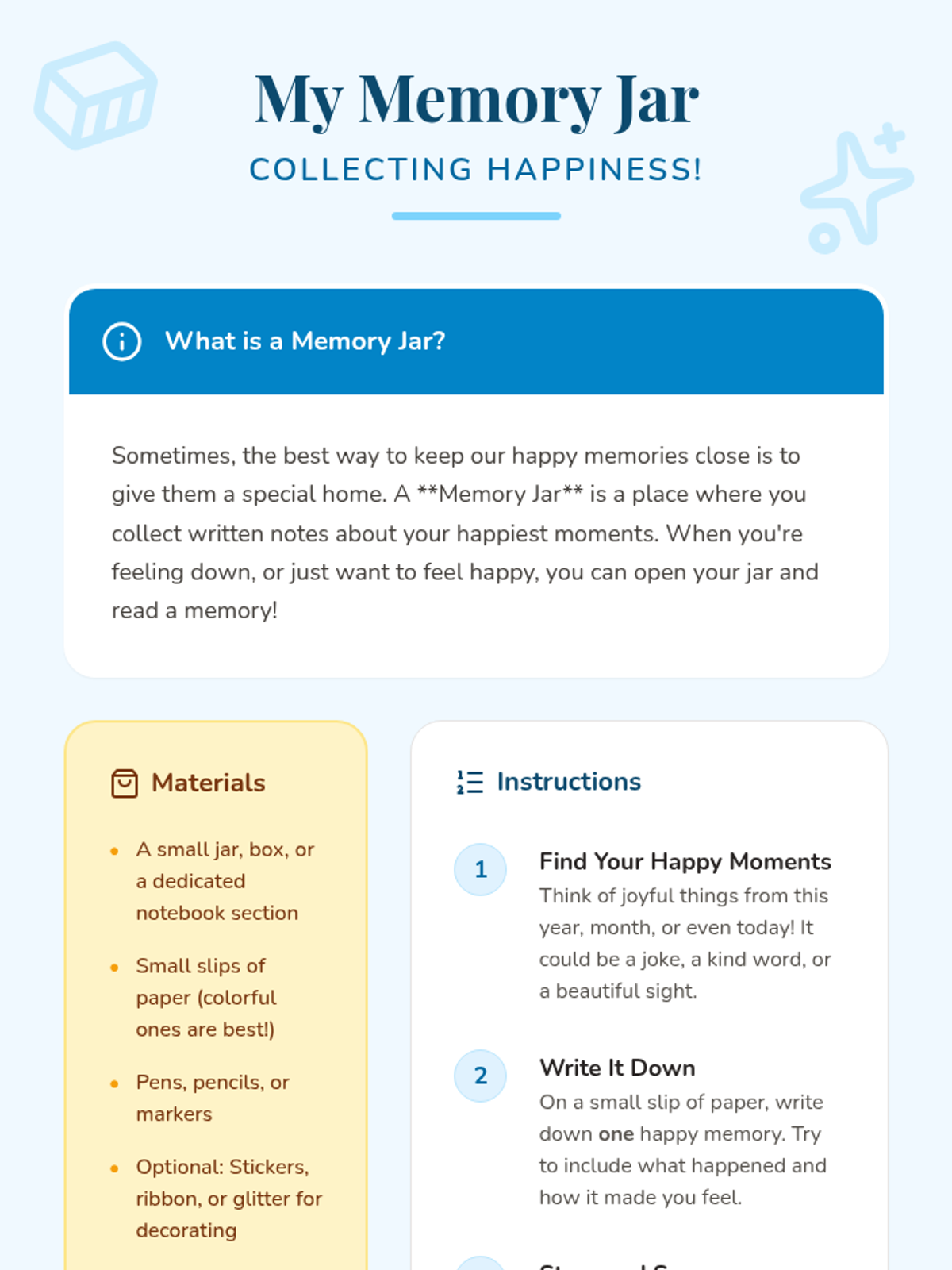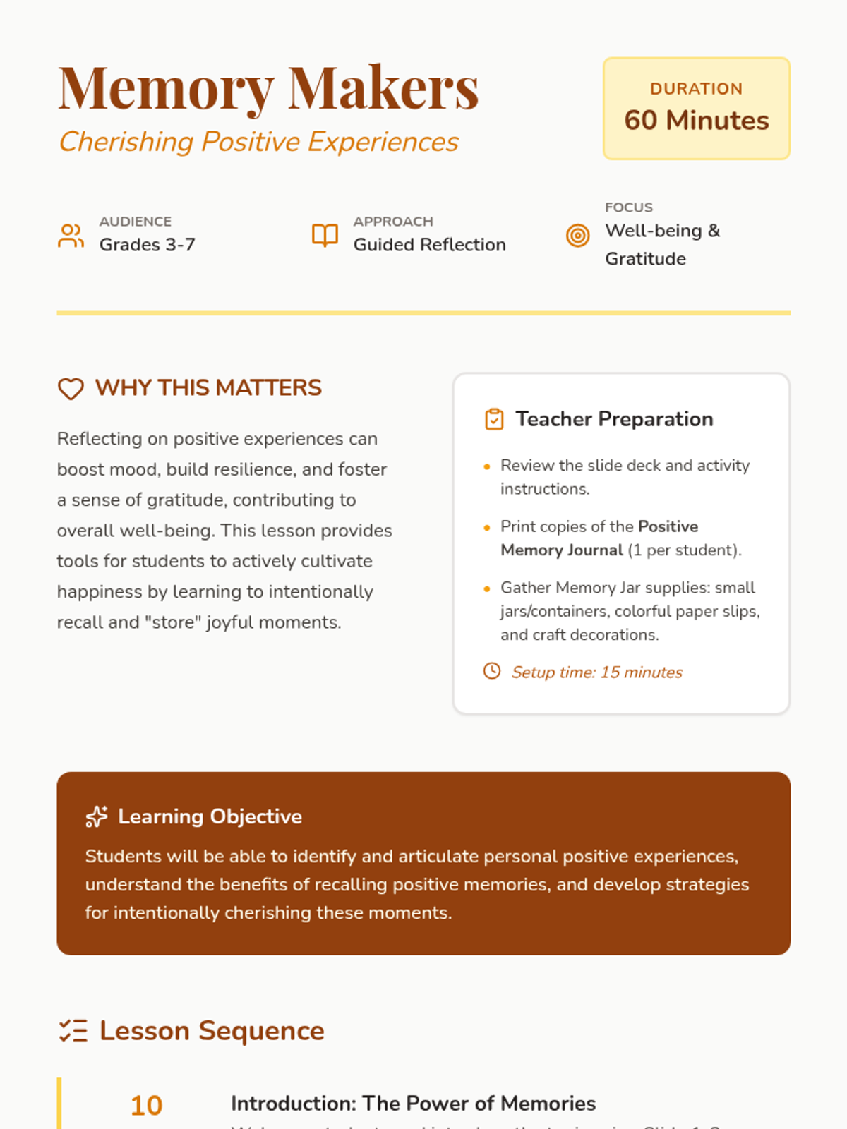 A 60-minute lesson for grades 3-7 focused on identifying, cherishing, and 'storing' positive memories to build resilience and well-being. Includes guided visualization, journaling, and a creative 'Memory Jar' activity.