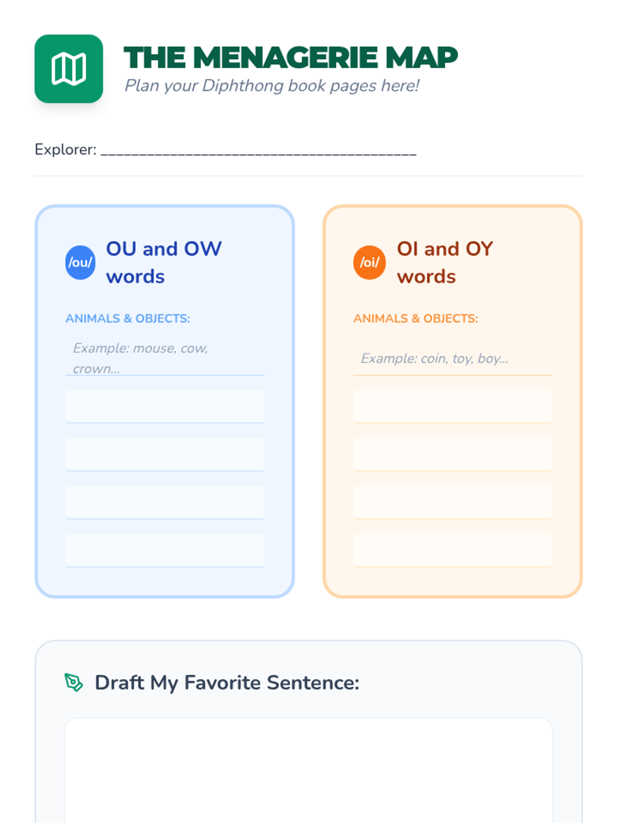 Students brainstorm animals and objects for their 'Diphthong Menagerie' and begin drafting sentences for their class book.