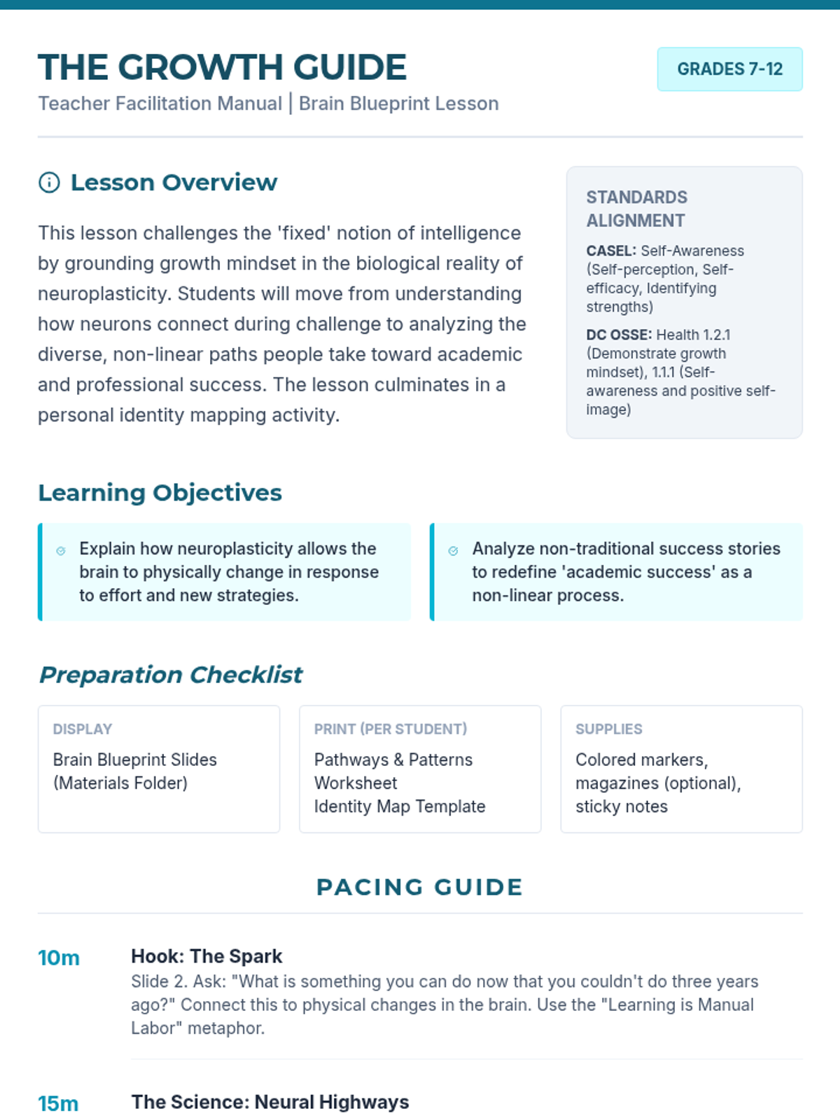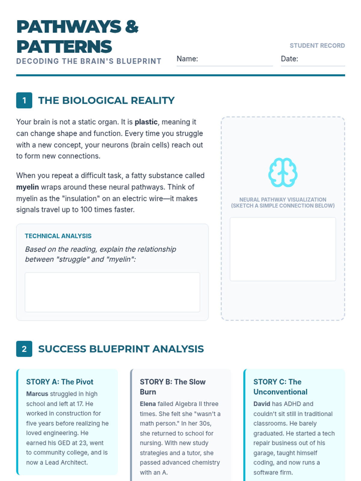 A high school lesson exploring the science of neuroplasticity and diverse academic journeys to build a robust, growth-oriented identity. Students move from the biological 'how' of learning to personal reflection on their own strengths and non-traditional paths to success.