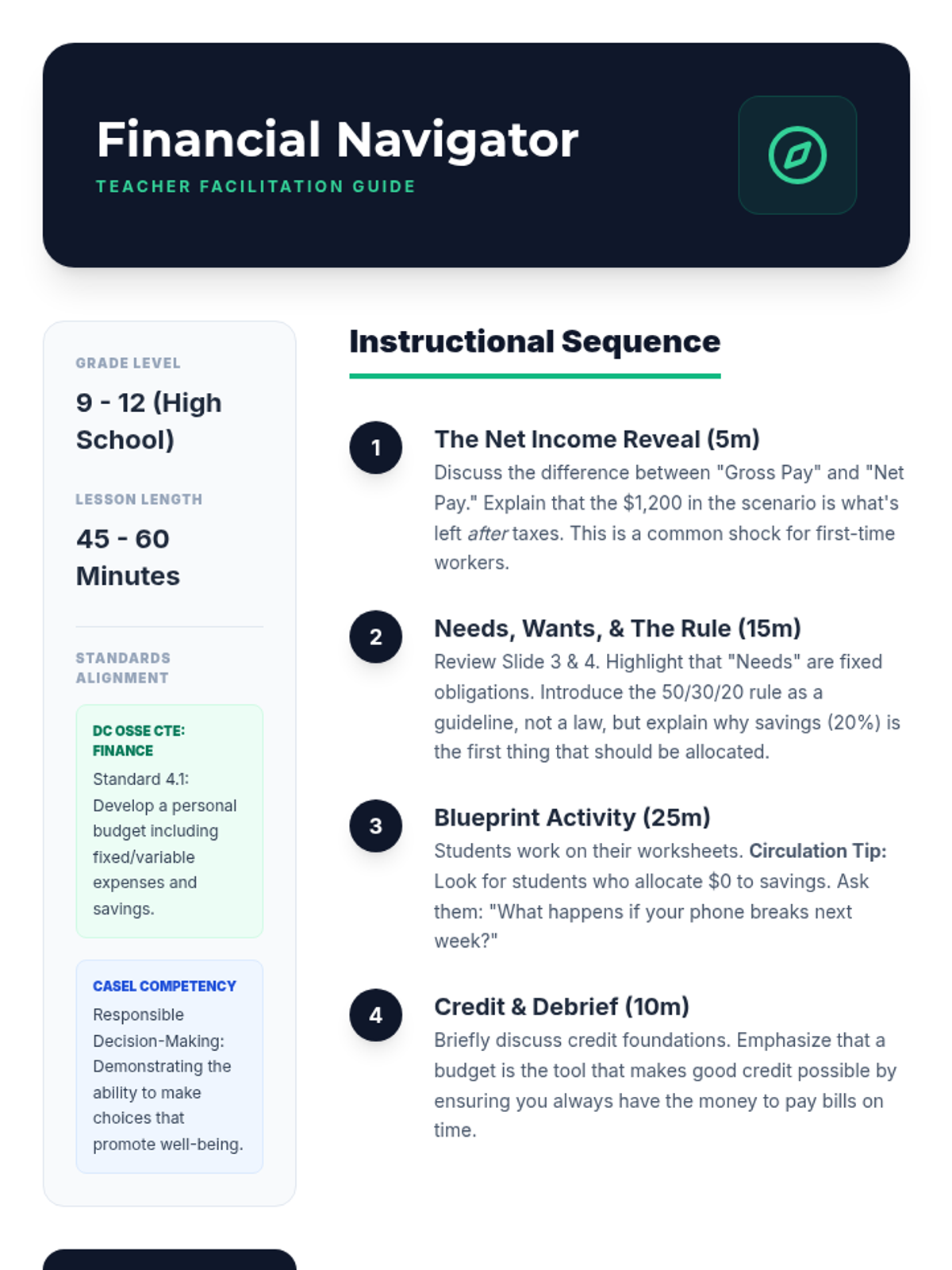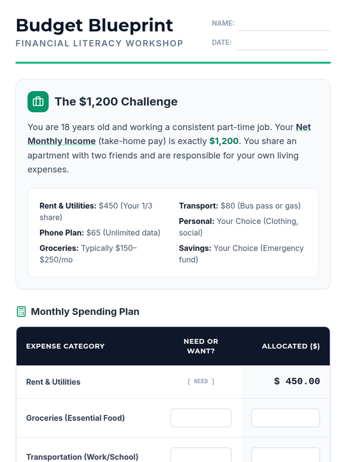 A practical deep dive into personal budgeting for high school students. They'll navigate a $1,200 monthly income scenario, distinguish between needs and wants, and learn the foundations of credit building.