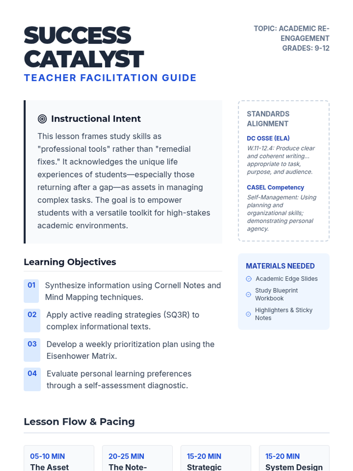 A comprehensive lesson designed for high school students to master advanced study techniques and academic re-engagement strategies, focusing on Cornell notes, time management, and active reading.