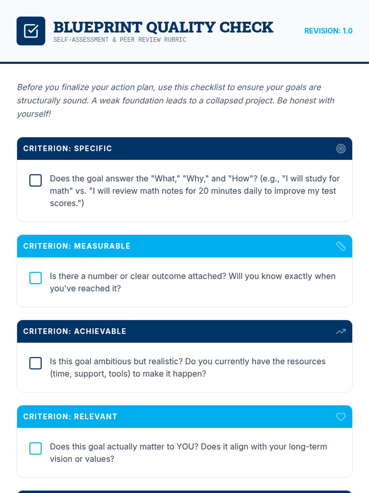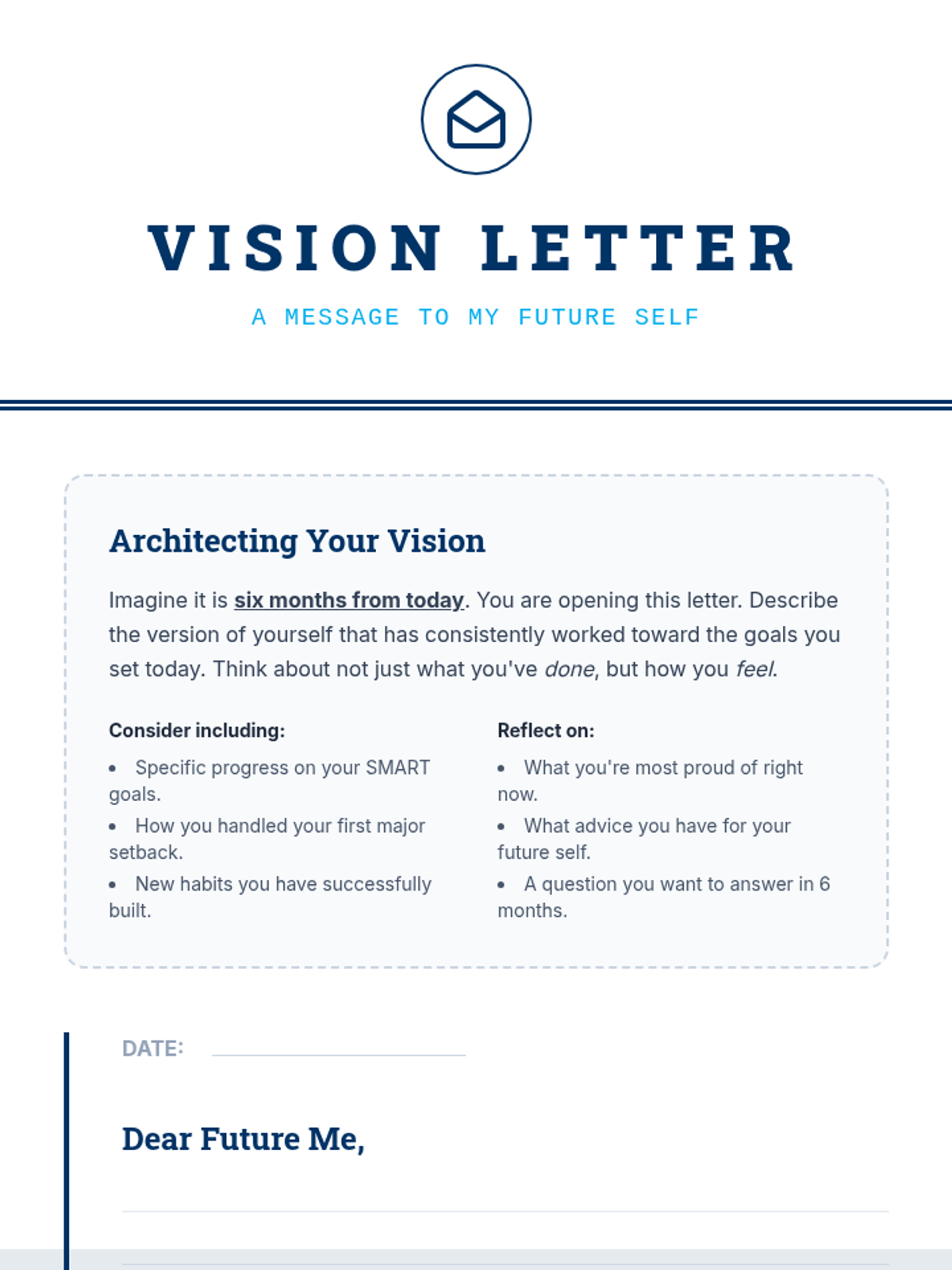 A high school lesson focused on the SMART goals framework, action planning, and self-reflection. Students design a blueprint for their future by setting academic and personal goals, identifying obstacles, and writing a vision letter to their future selves.