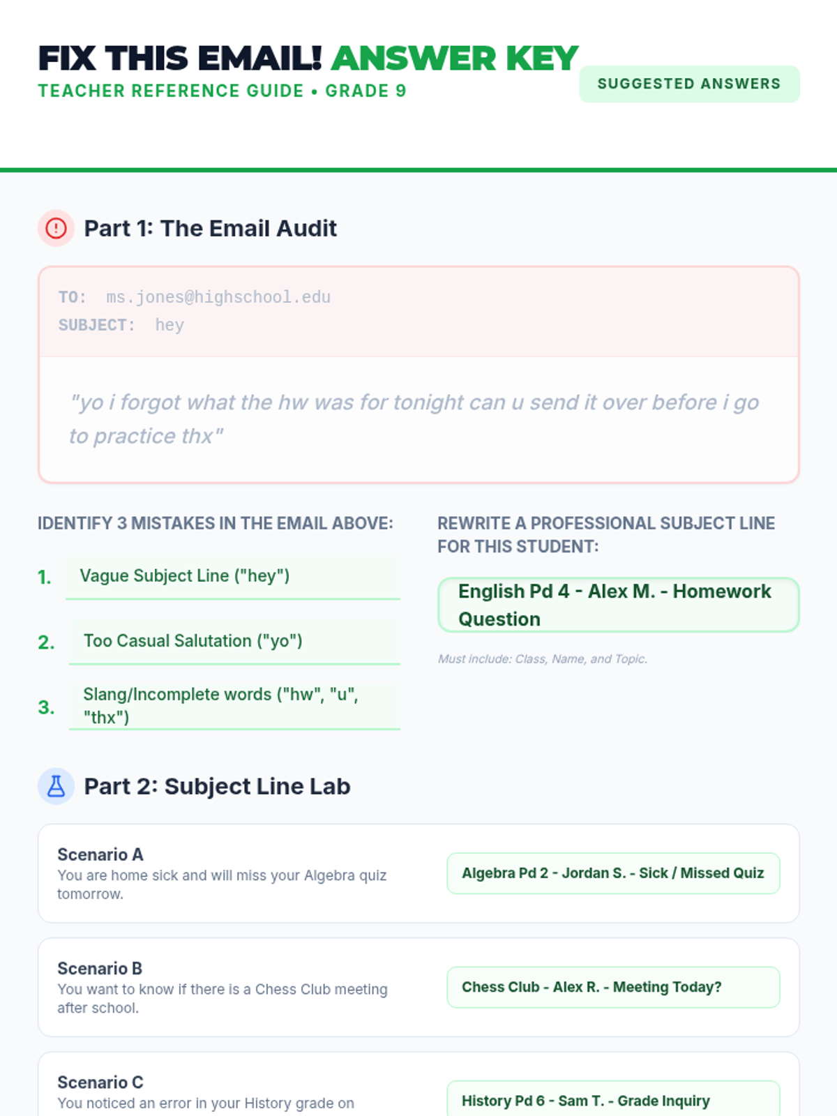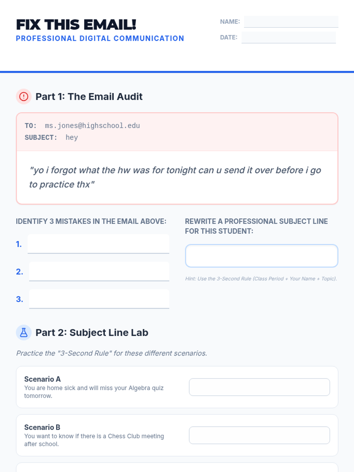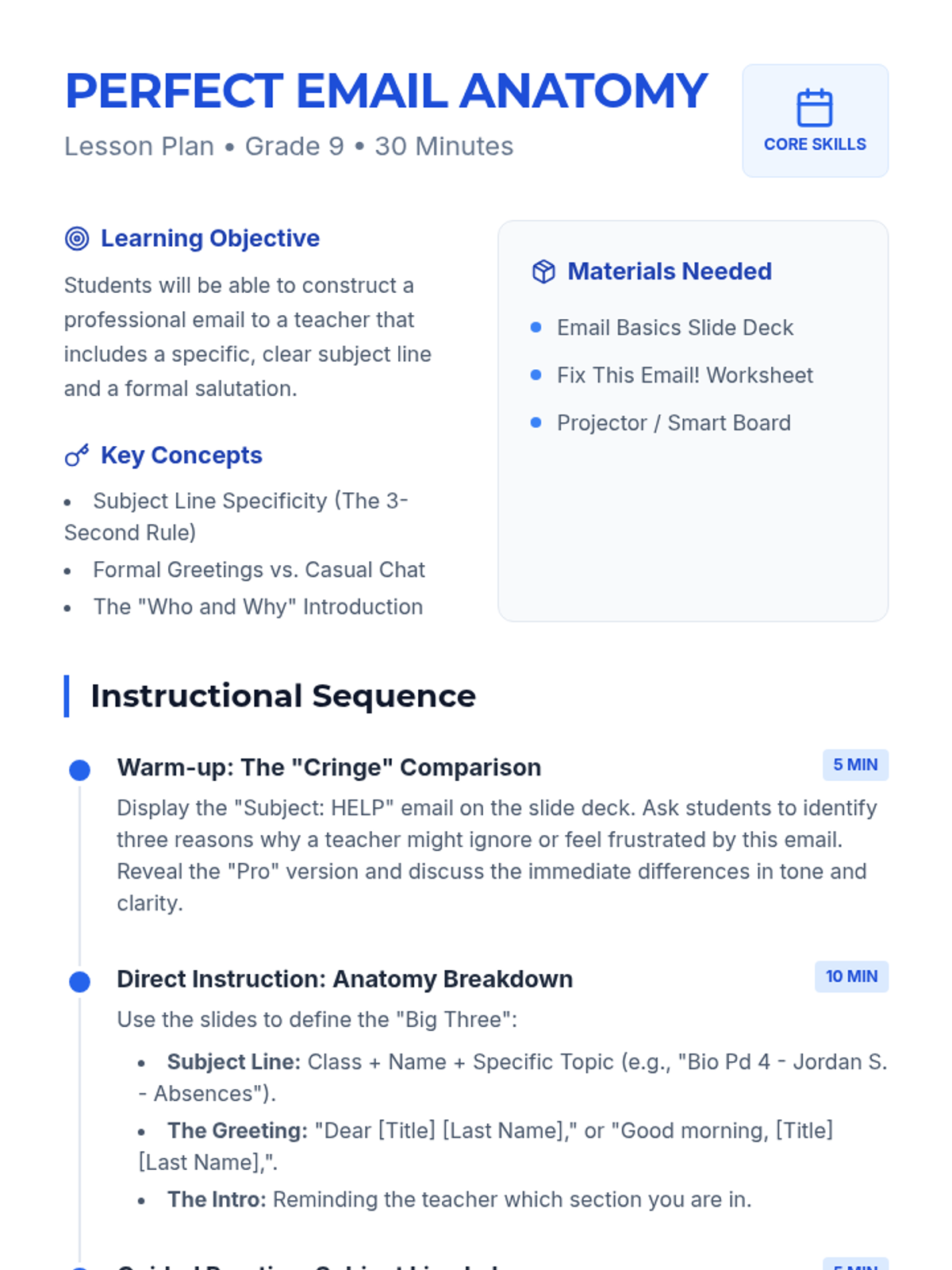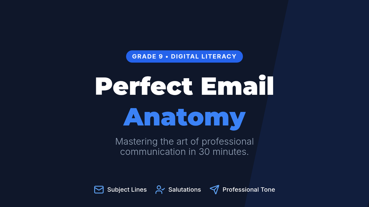 A 30-minute lesson designed to teach 9th graders the essentials of professional digital communication, focusing on clear subject lines and formal salutations. Students will transition from analyzing 'cringe' emails to drafting professional openings for real-world school scenarios.