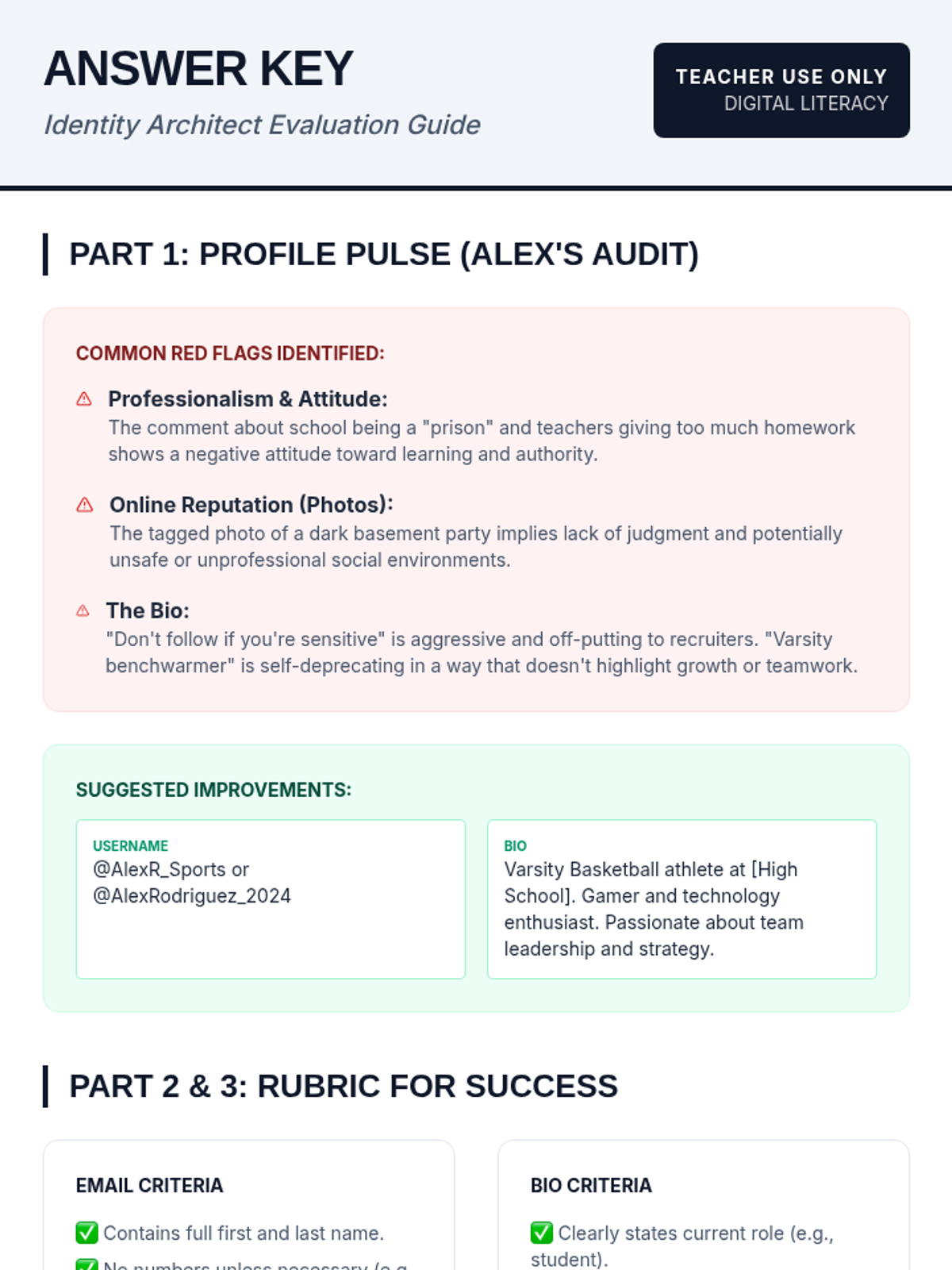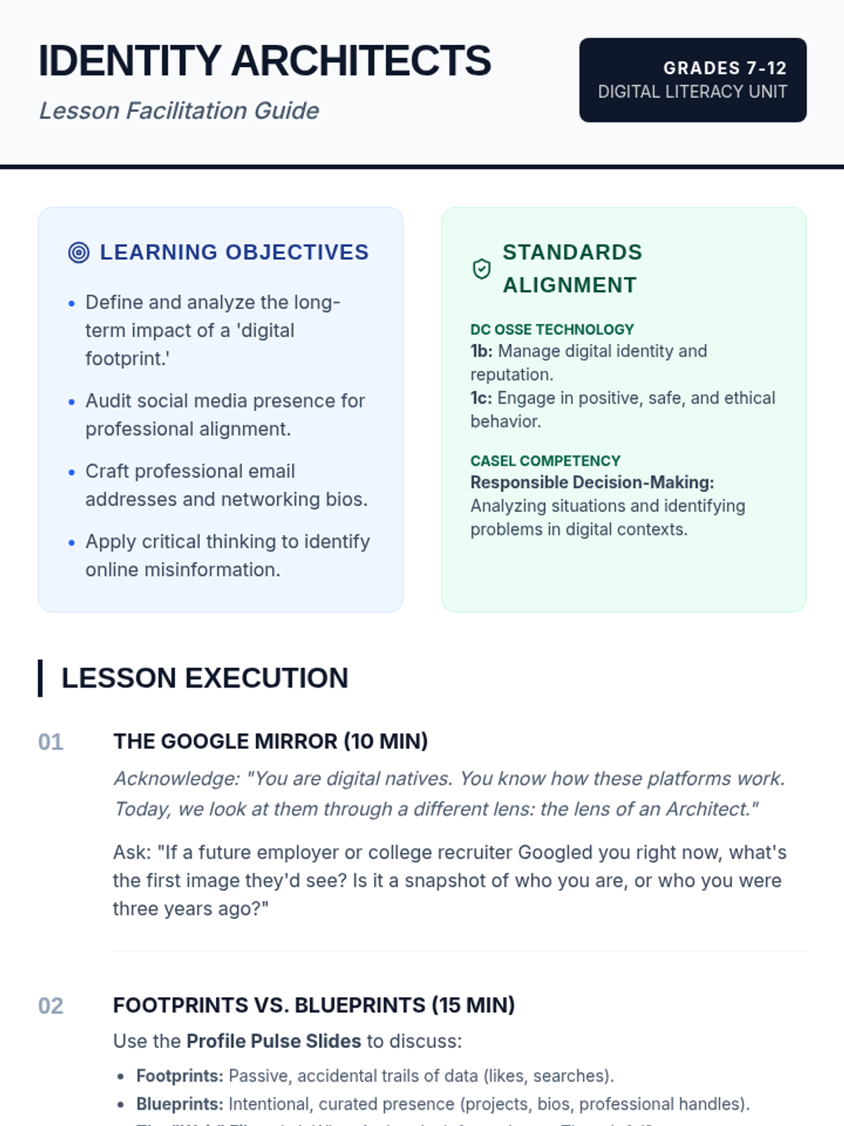 This lesson empowers students to take control of their digital footprints by transforming them into intentional 'digital blueprints.' Students analyze mock social media profiles, practice professional communication, and draft networking bios while navigating online safety and misinformation.