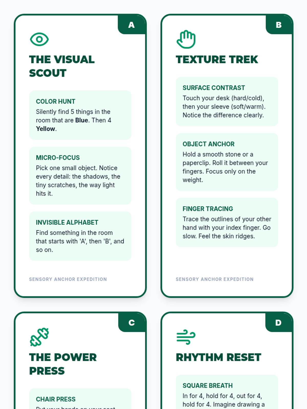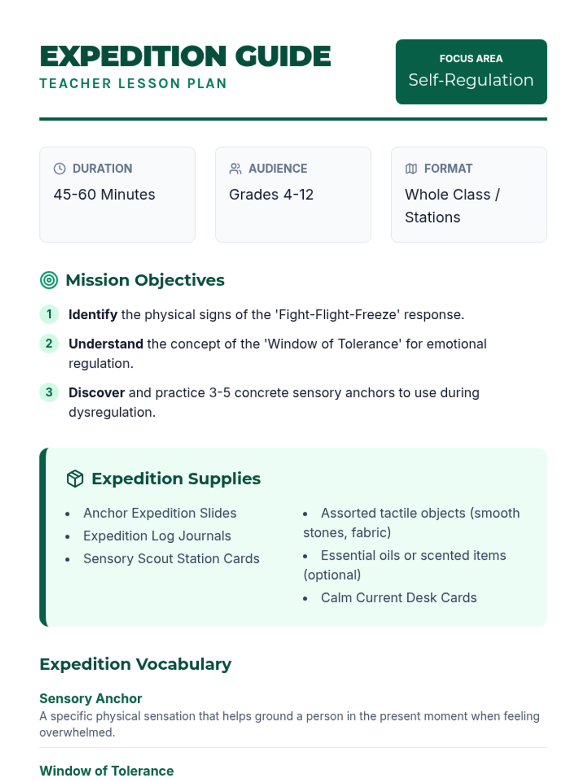 A grounding-focused lesson teaching the physiology of the 'fight-flight-freeze' response and providing a toolkit of sensory anchors to return to the 'window of tolerance.'