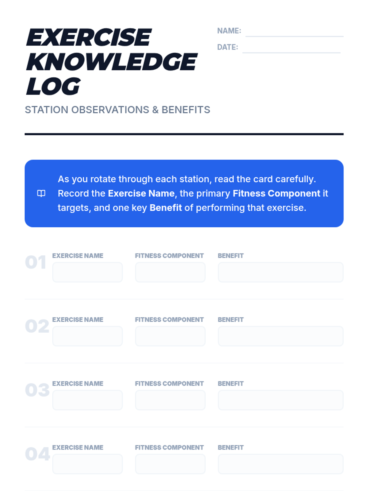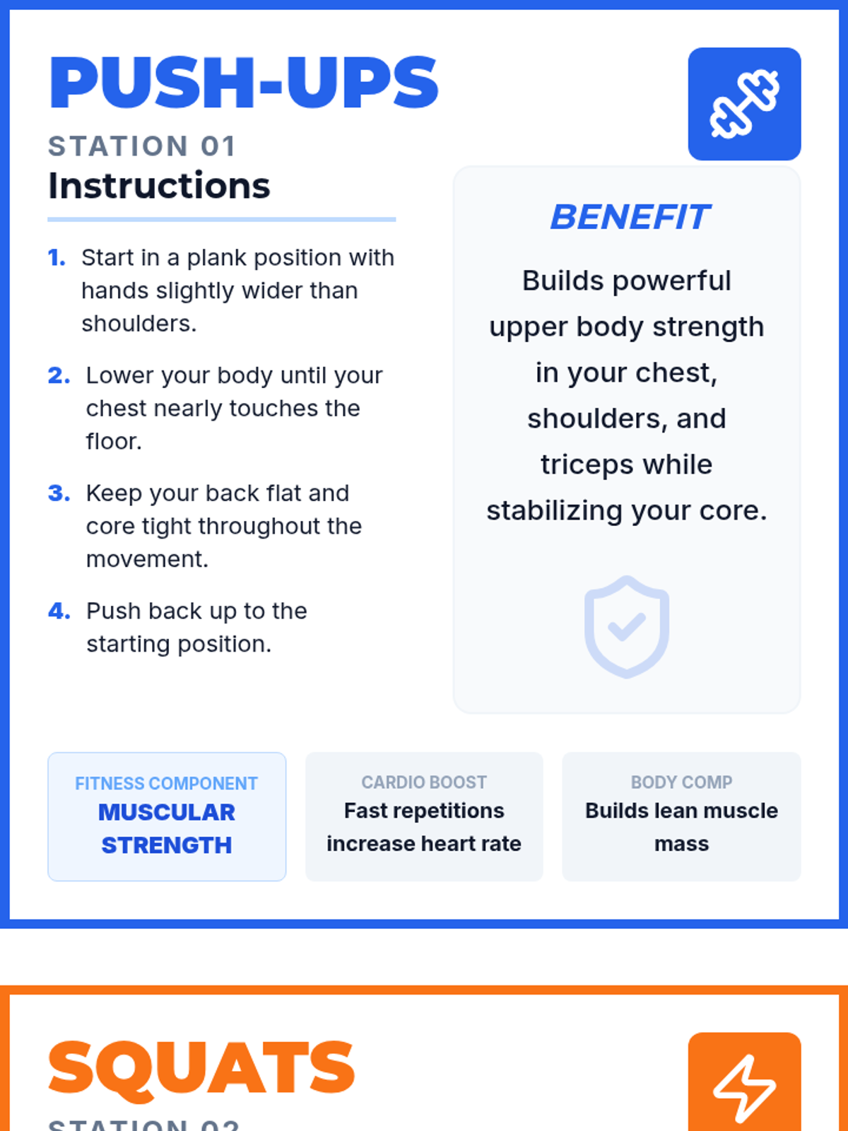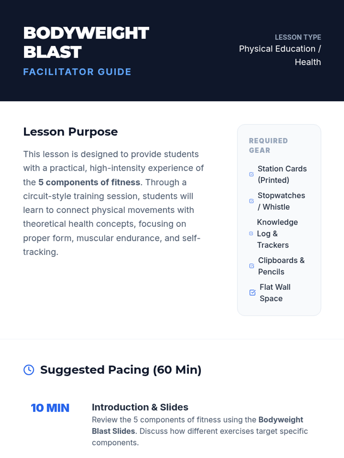 A high-energy lesson focused on bodyweight exercises that target the five components of fitness through a circuit-style training session. Students will learn proper form, the benefits of each exercise, and how they contribute to overall health.