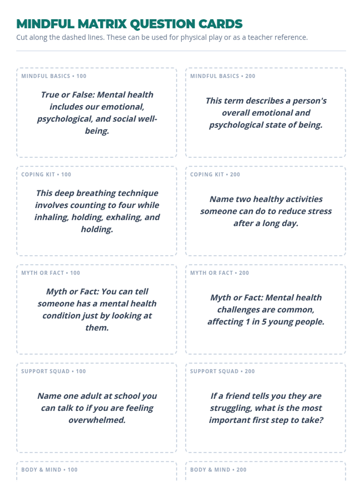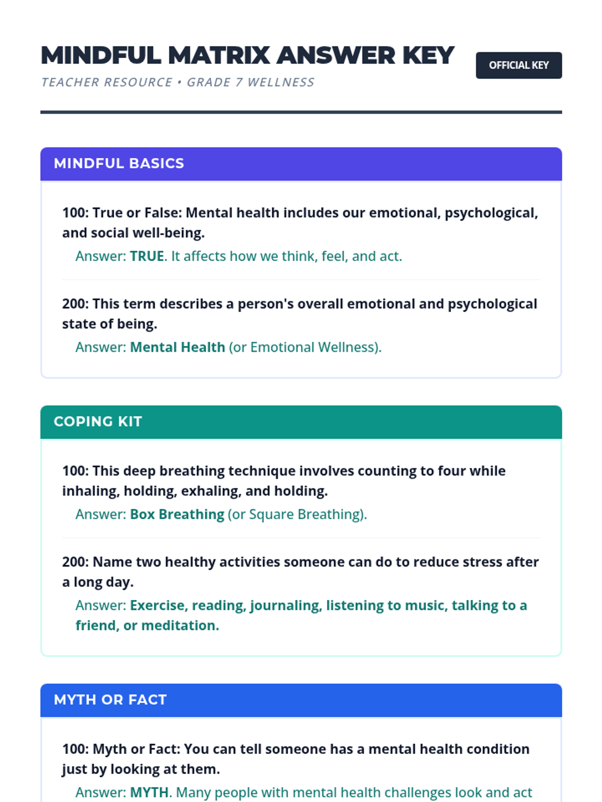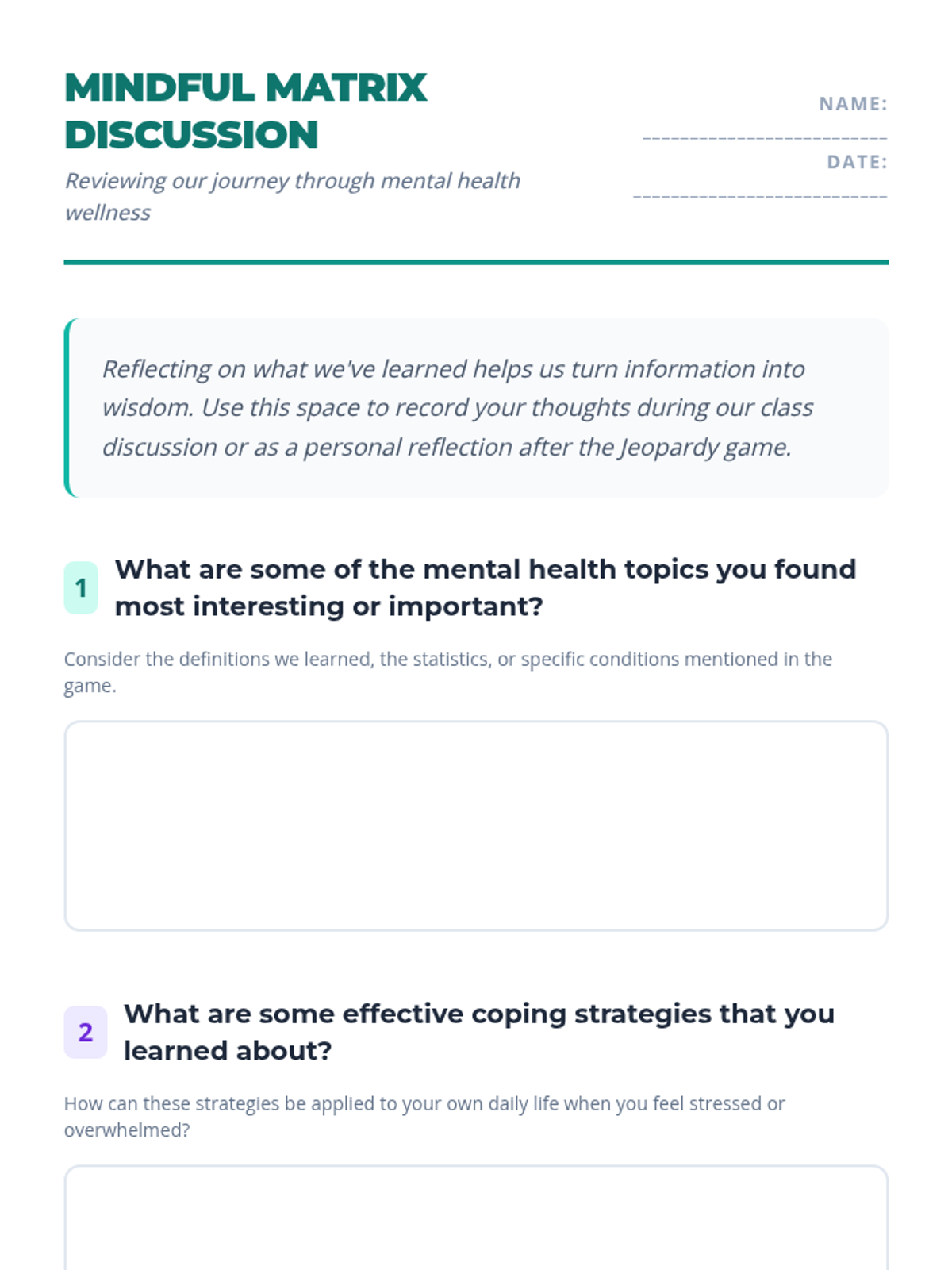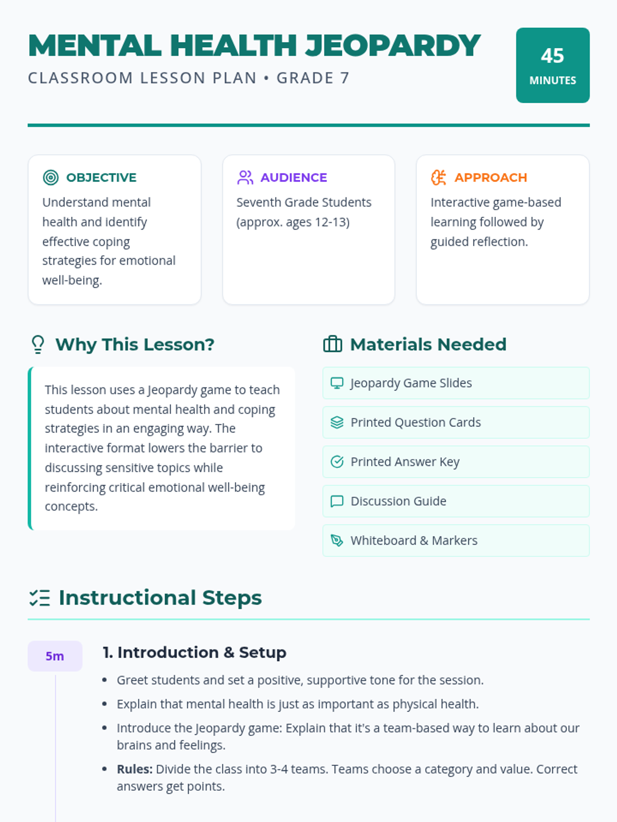 An interactive 7th-grade lesson using a Jeopardy-style game to explore mental health definitions, coping strategies, and support systems. Students engage in competitive learning followed by a reflective guided discussion.