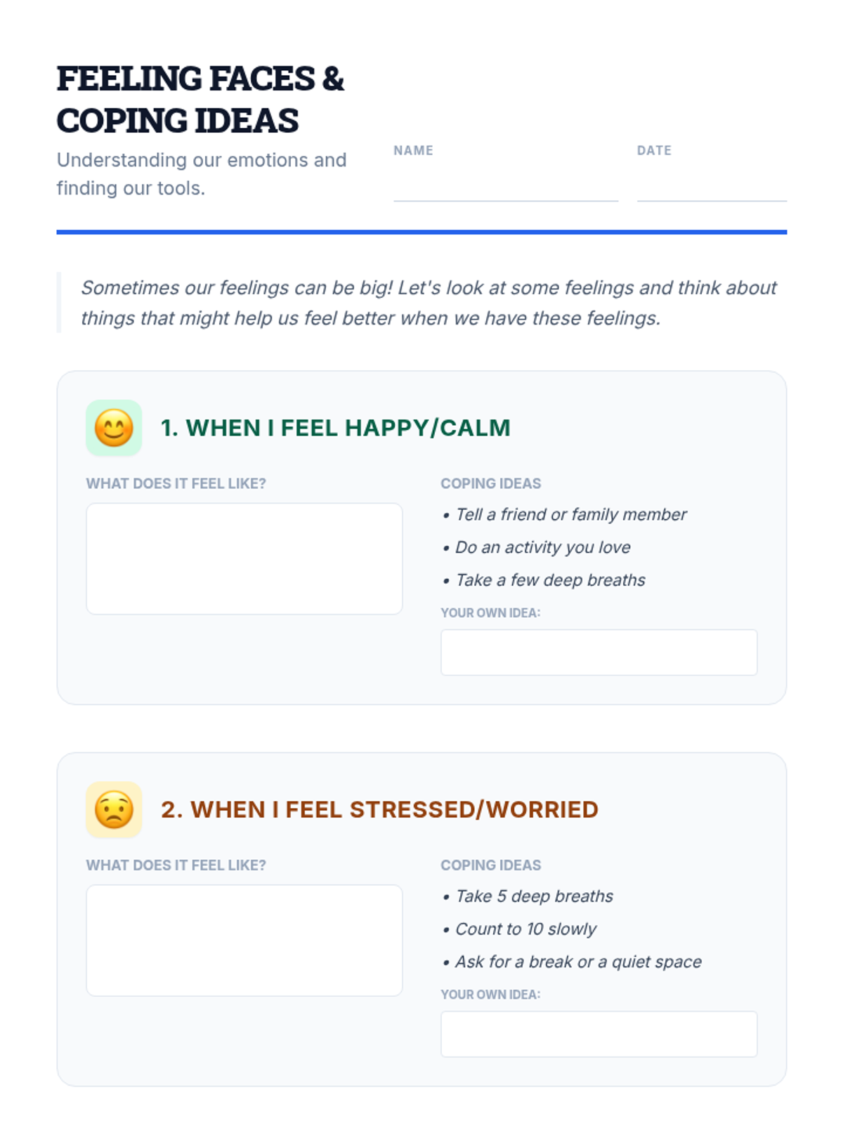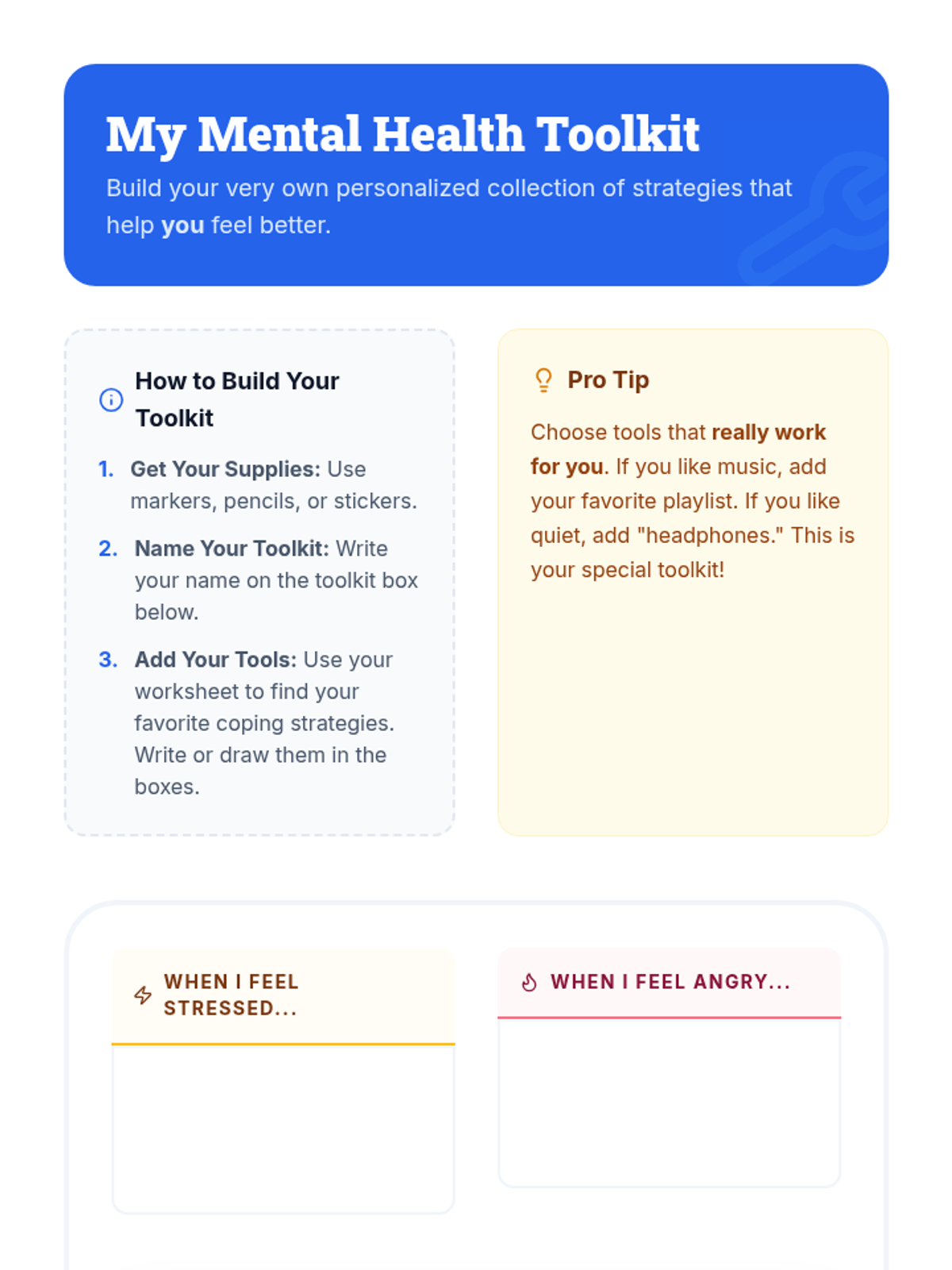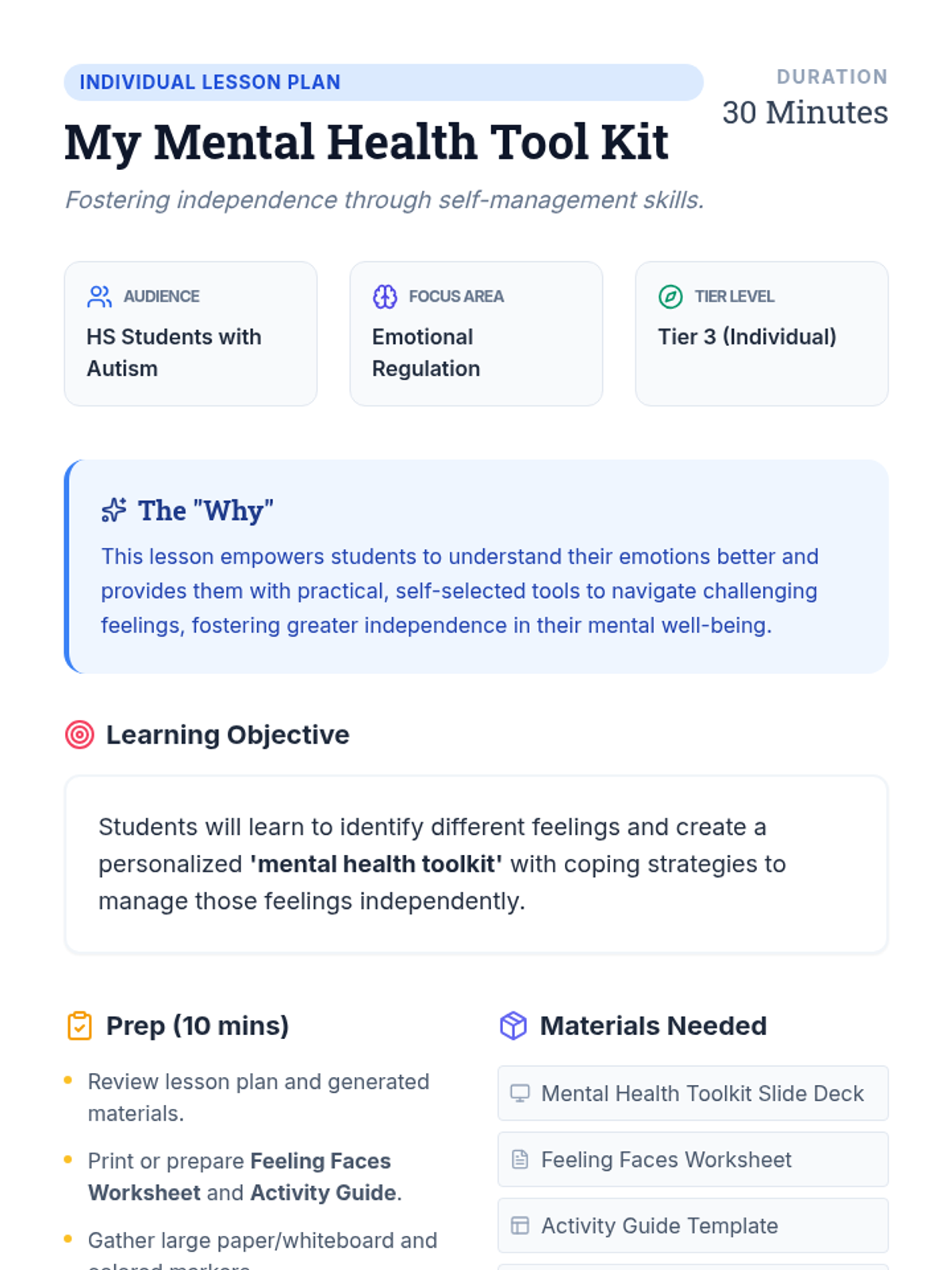 A 30-minute individual counseling session designed for high school students with autism to identify emotions and build a personalized coping strategies toolkit for emotional regulation.