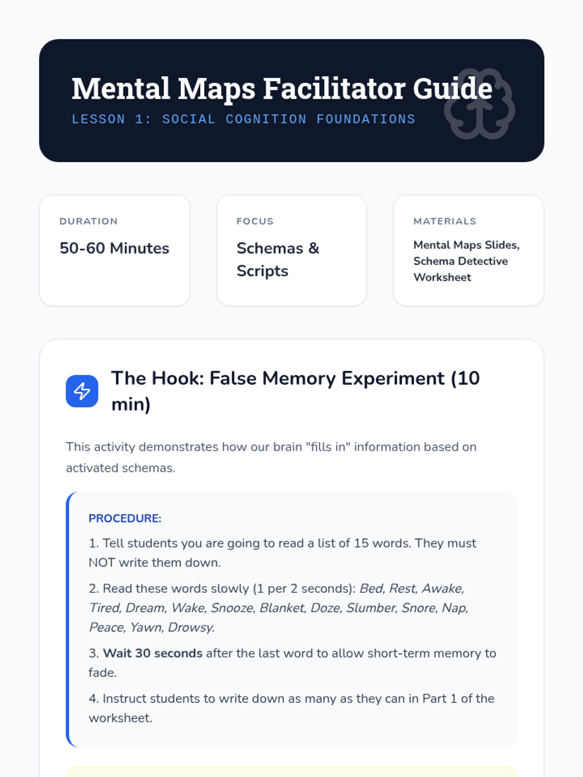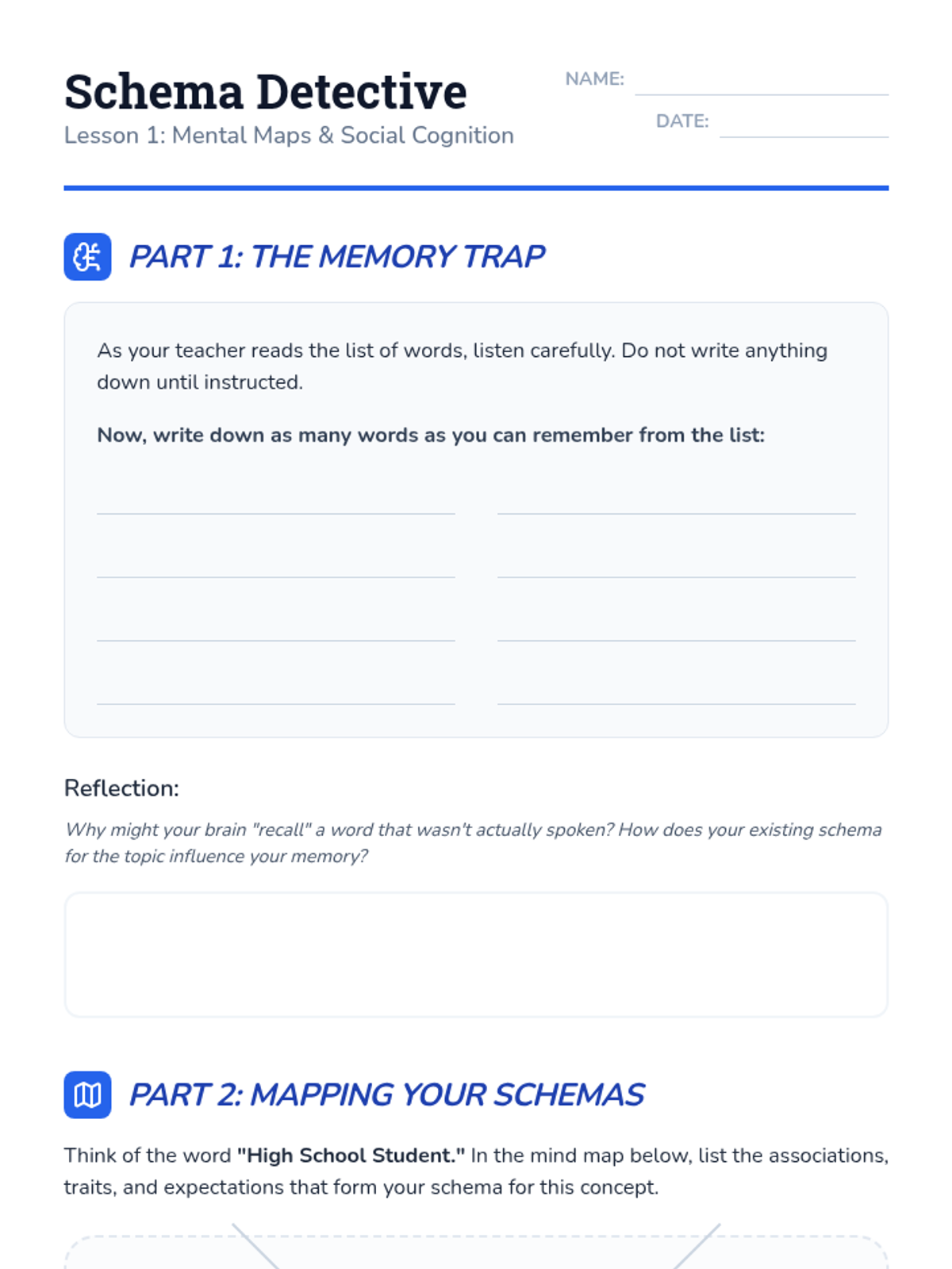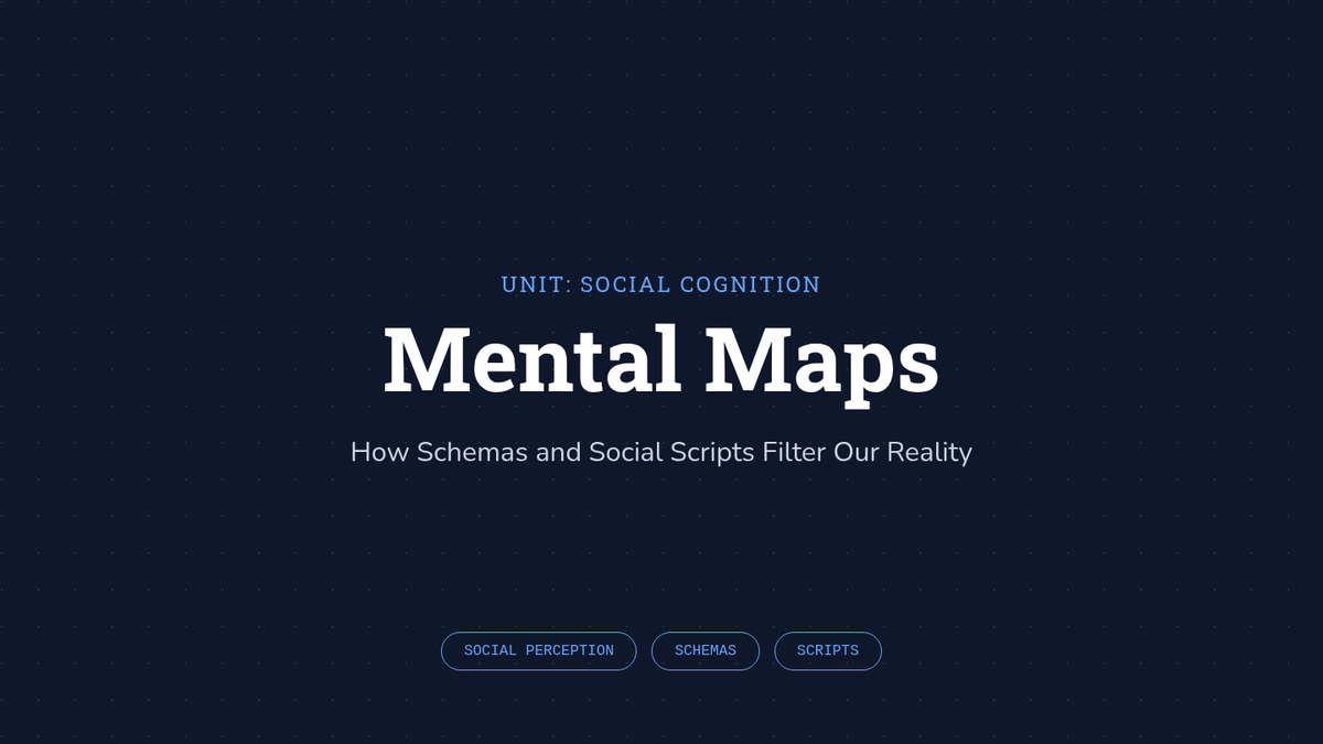 Introduces schemas and social scripts as mental frameworks that organize social information. Includes a 'false memory' experiment and exploration of how stereotypes function as schemas.