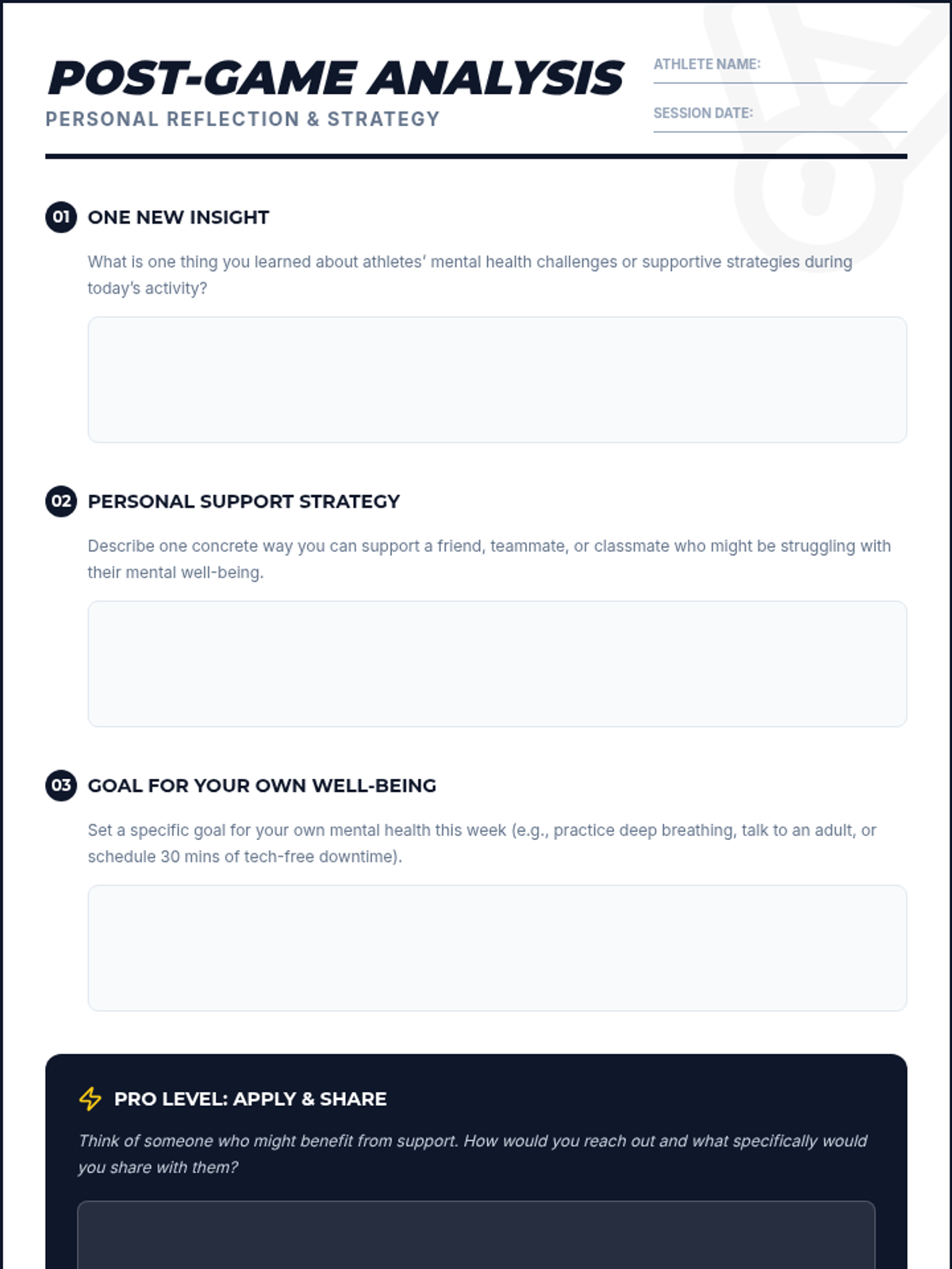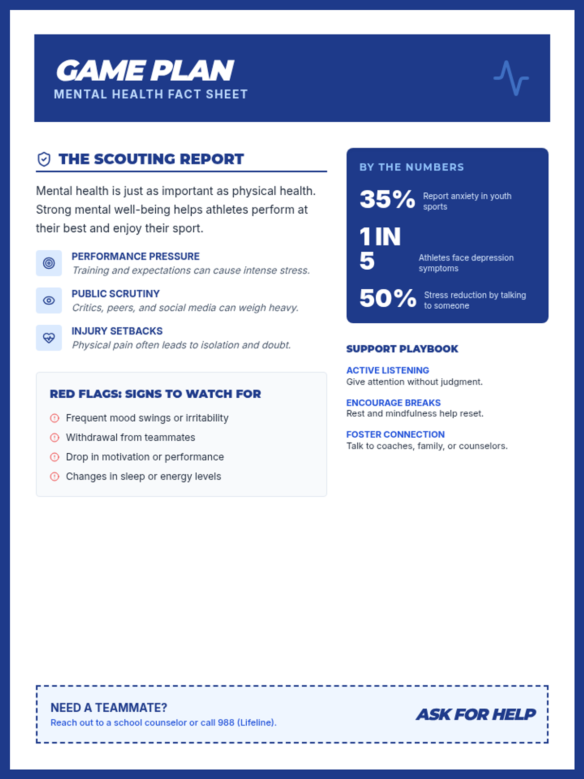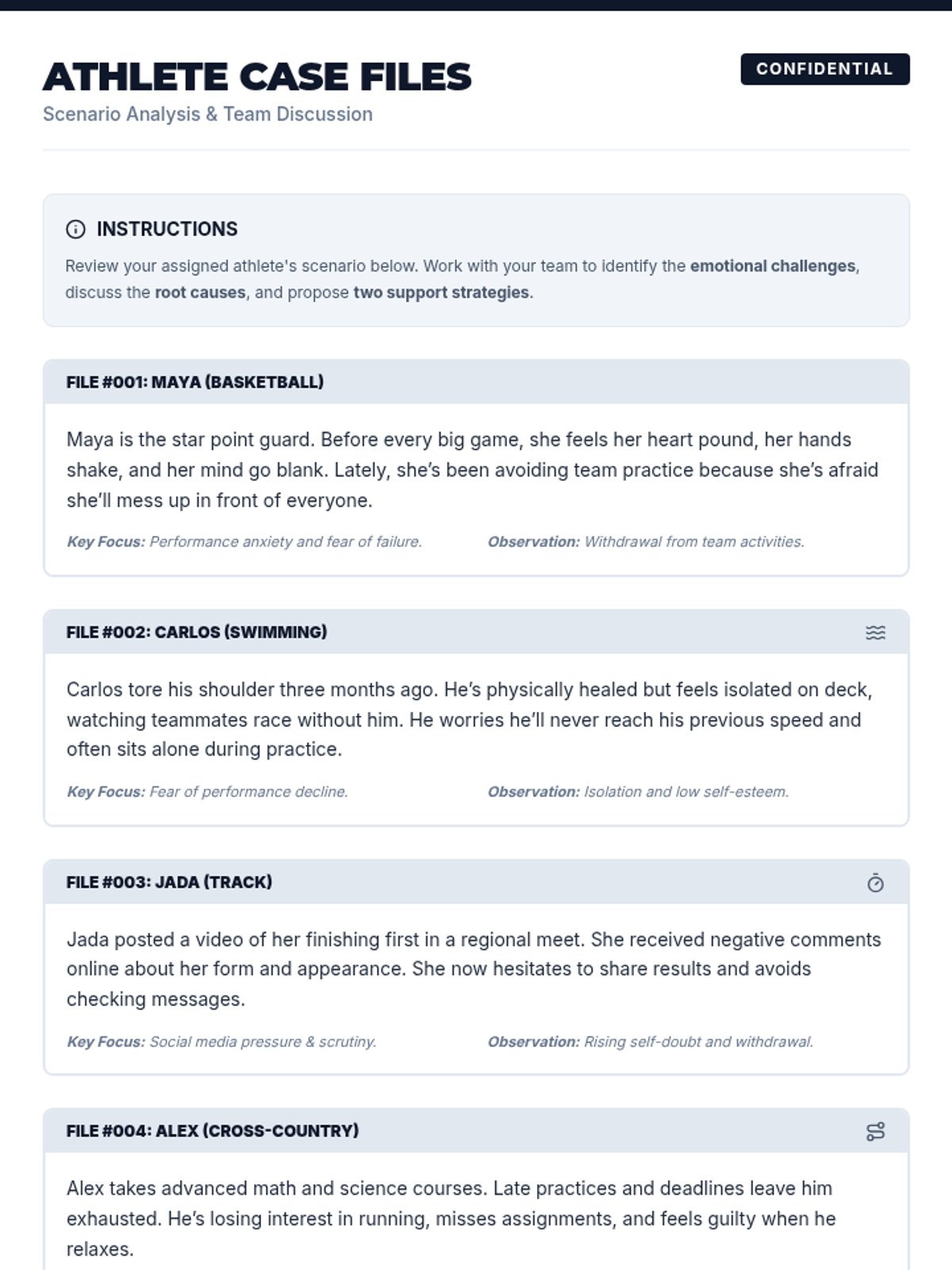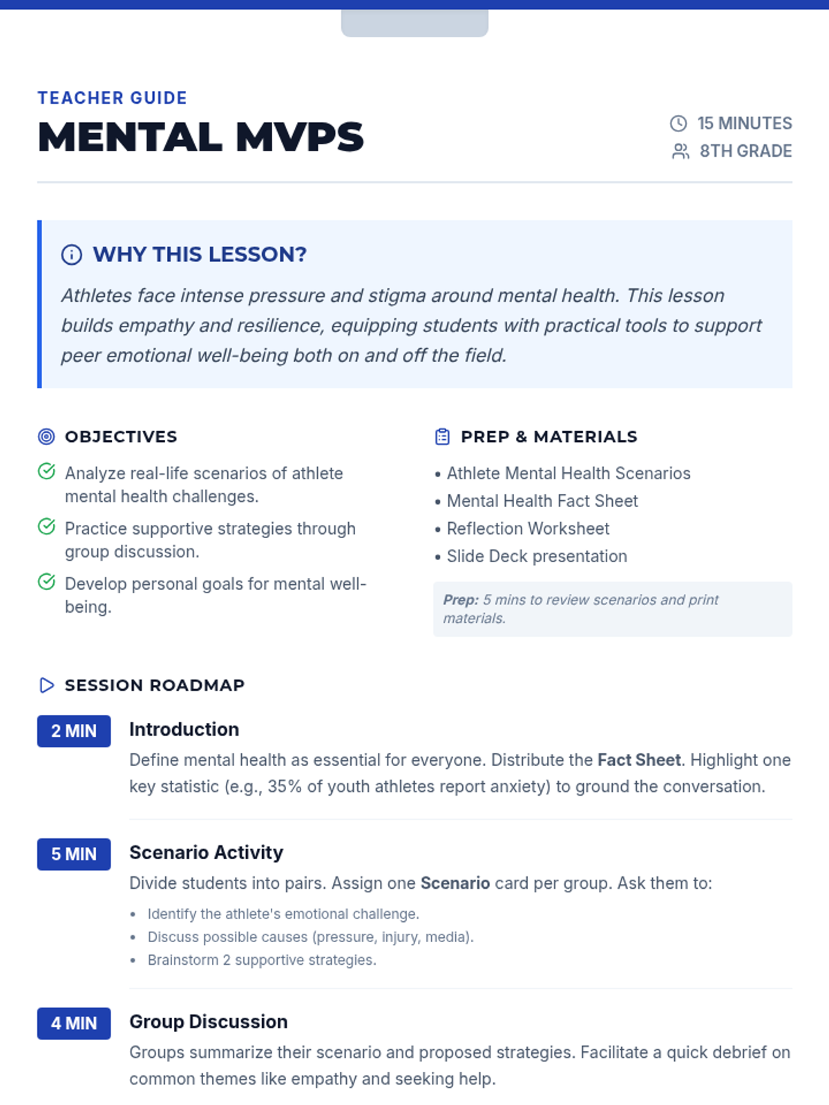 A 15-minute activity for 8th-grade students exploring the mental health challenges of athletes through scenario analysis and reflection. Students learn to recognize signs of struggle and practice supportive strategies to foster empathy and resilience.
