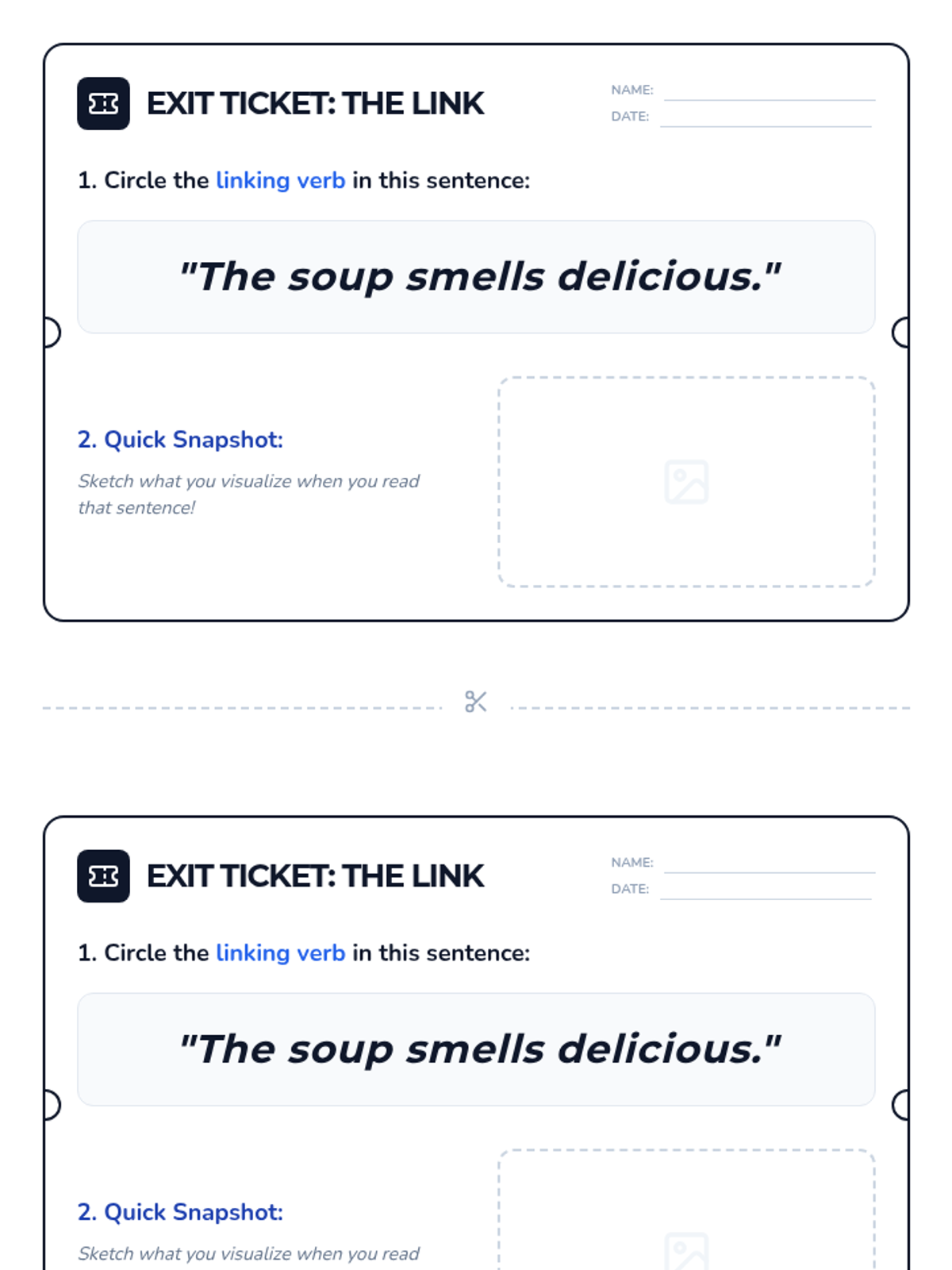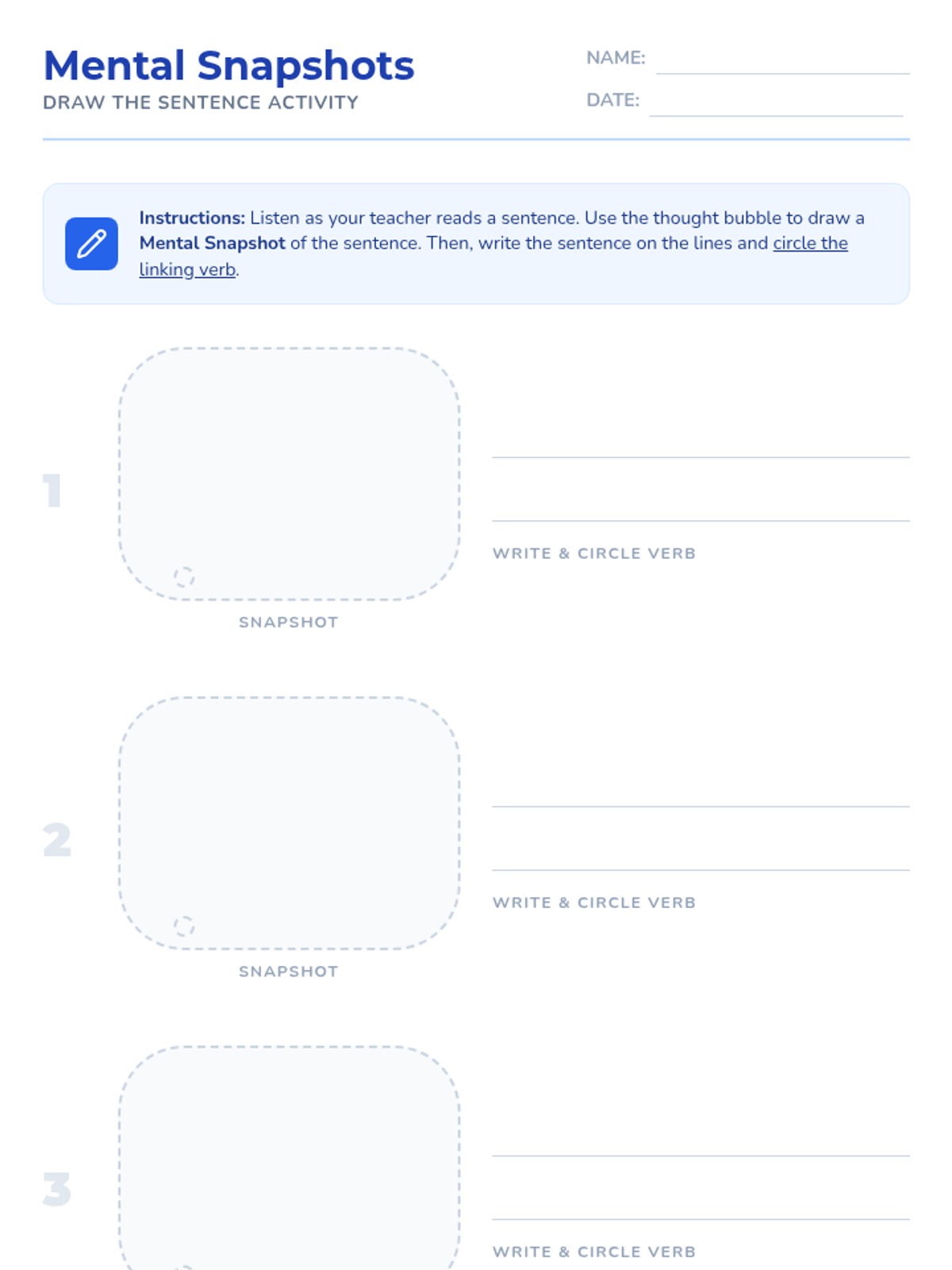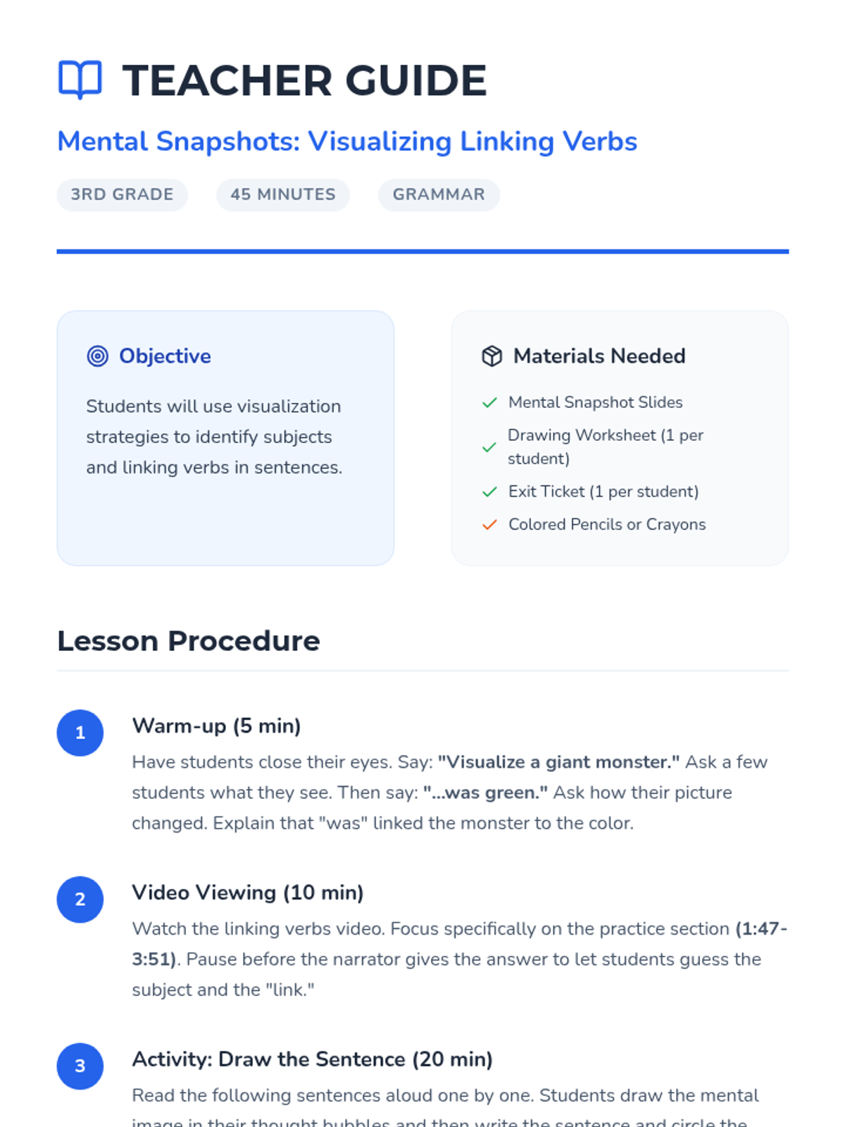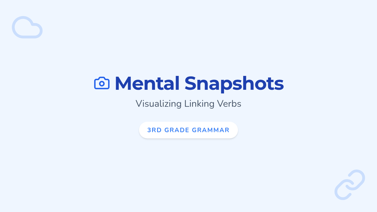 A 3rd-grade grammar lesson focusing on using visualization (mental images) to identify subjects and linking verbs in sentences. Students will watch a practice video, draw 'mental snapshots' of sentences, and identify how linking verbs connect subjects to descriptions.