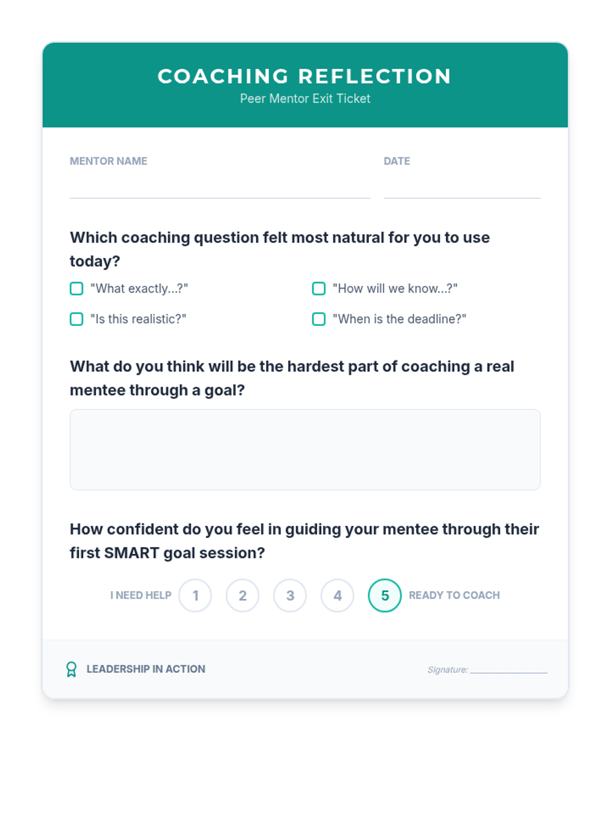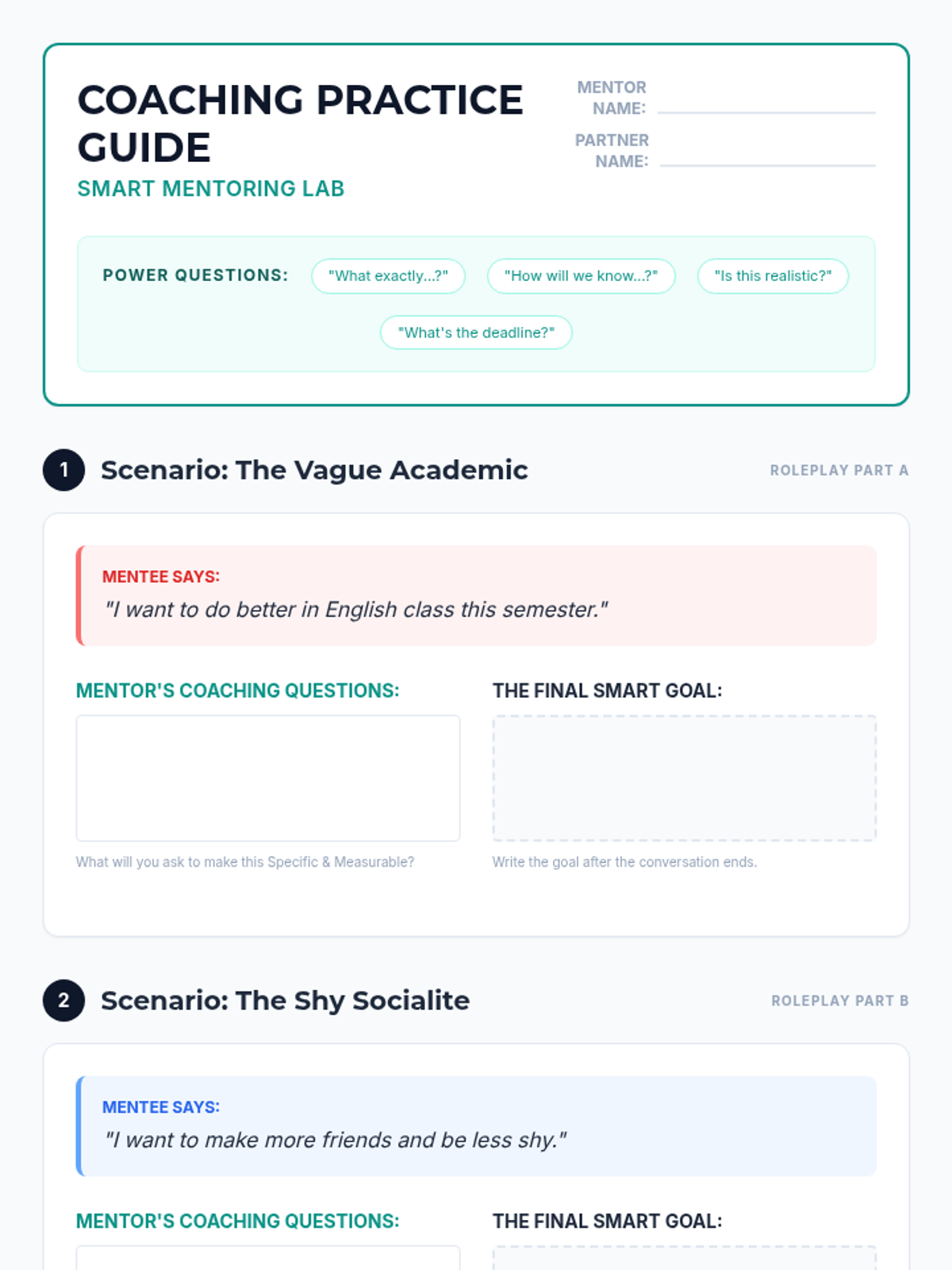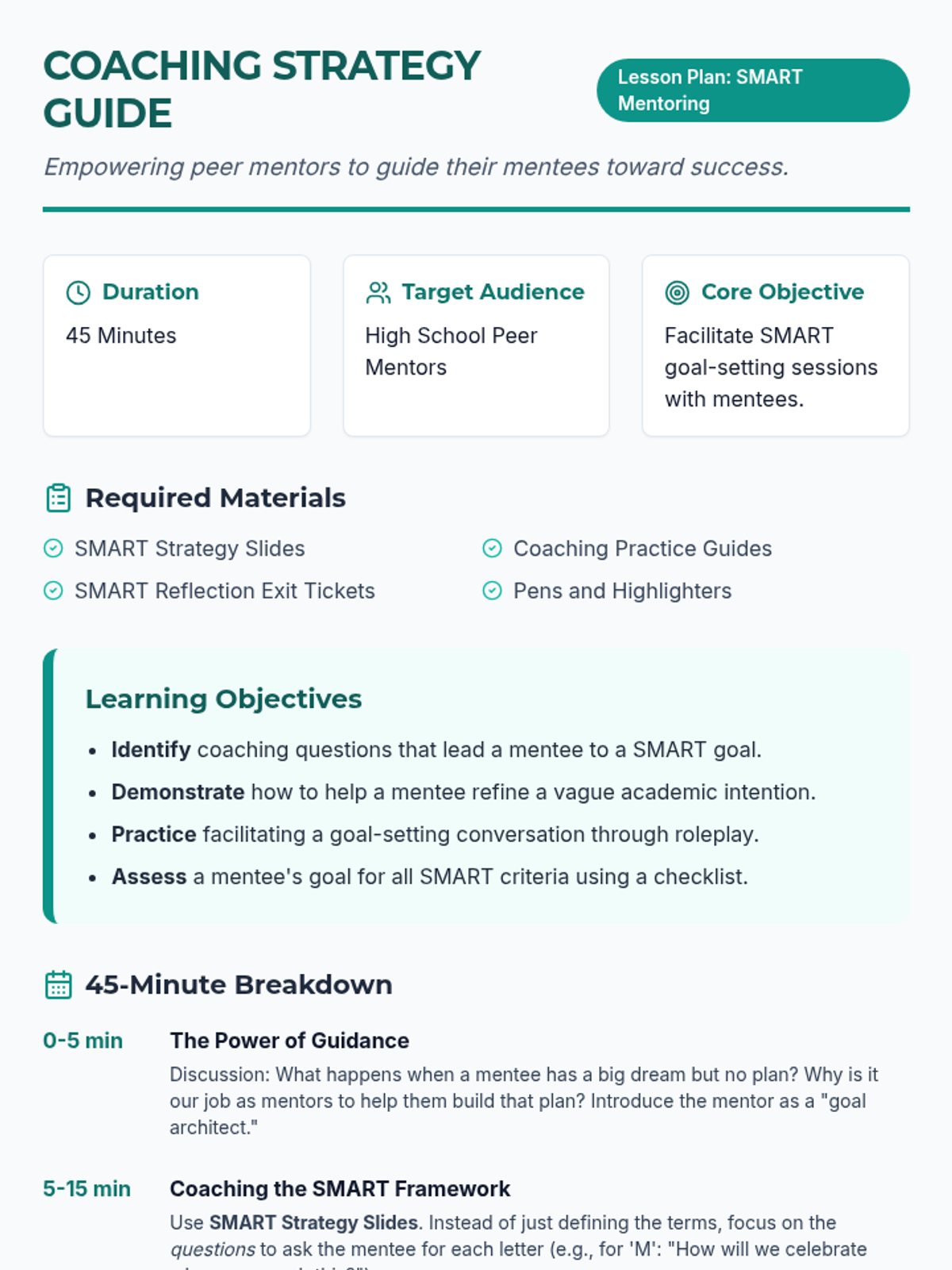 A comprehensive 45-minute workshop designed for high school peer mentors to master the SMART goal framework. Mentors will learn to refine vague intentions into actionable plans for both their academic success and personal leadership development.