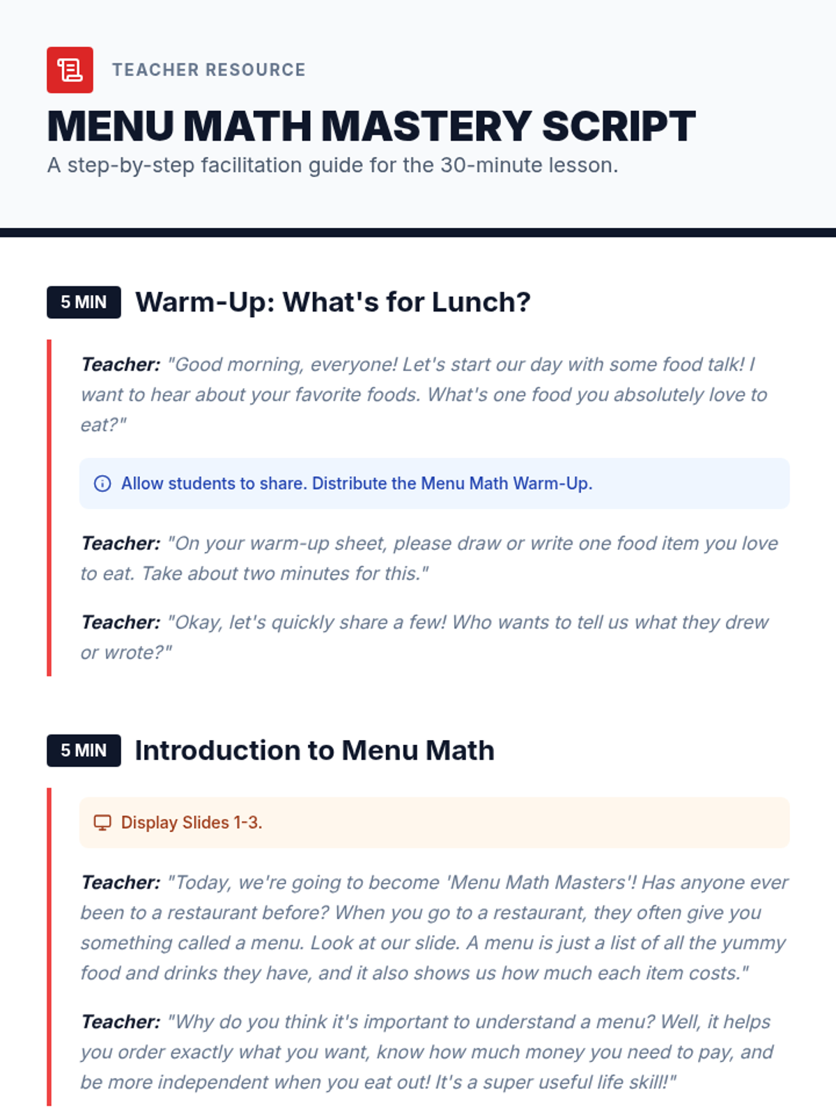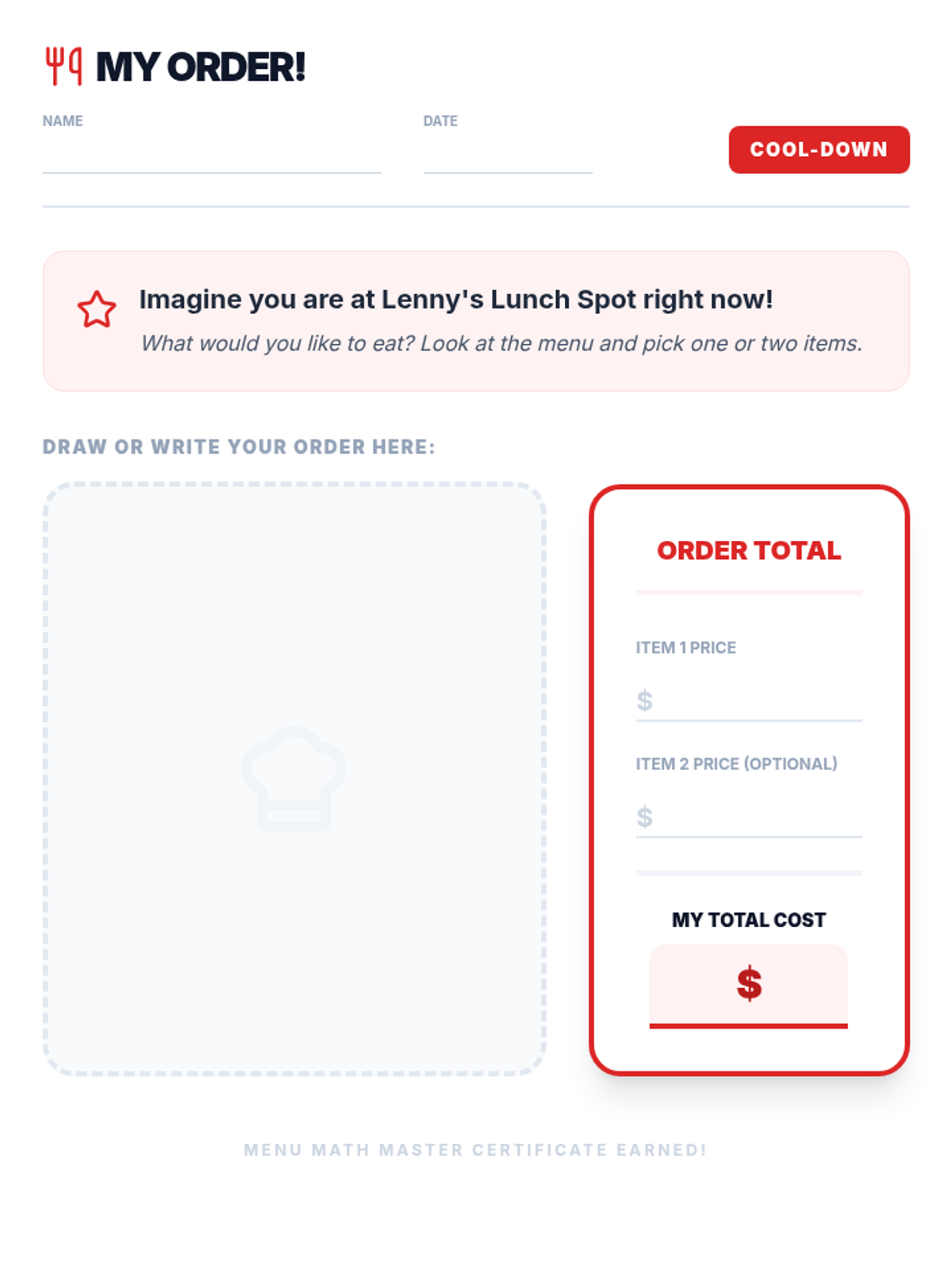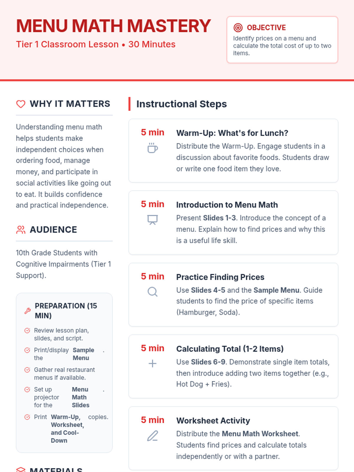 This lesson empowers sophomores with cognitive impairments to confidently apply math skills to real-world menu scenarios. Students will learn to navigate a menu, identify prices, and calculate simple totals for lunch orders.