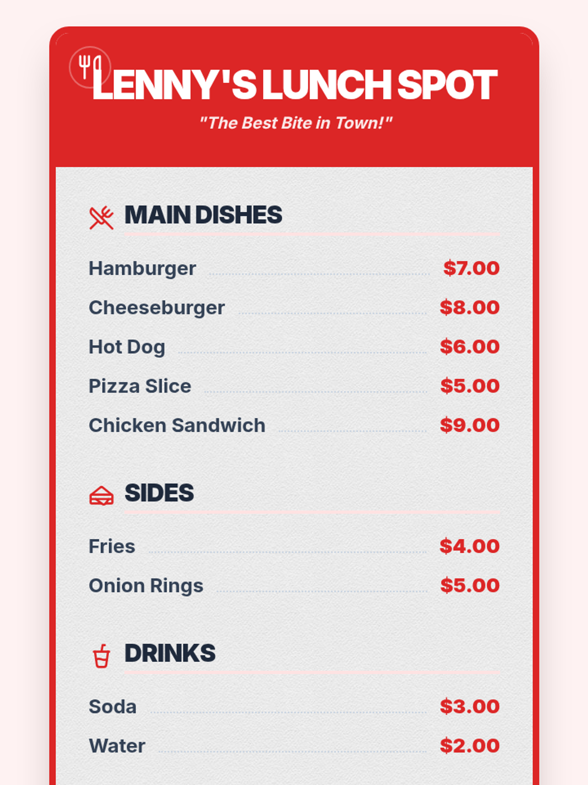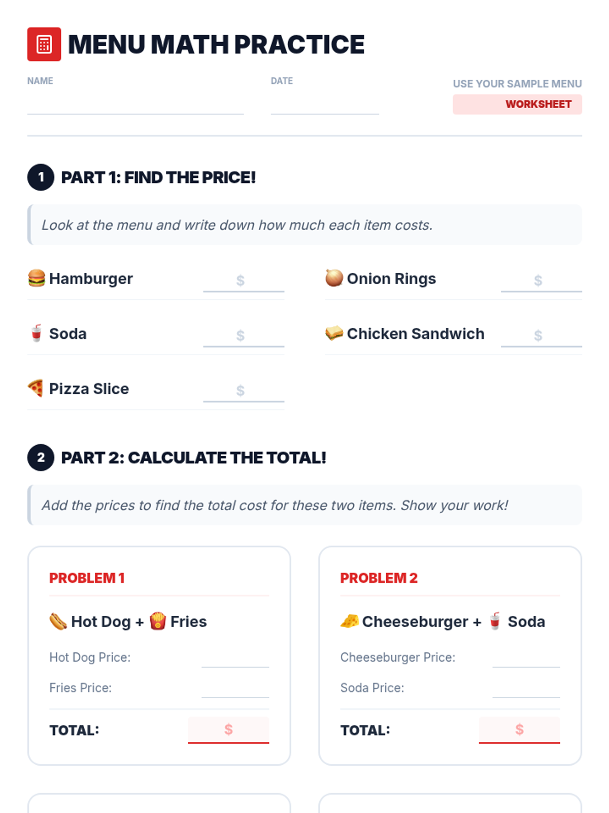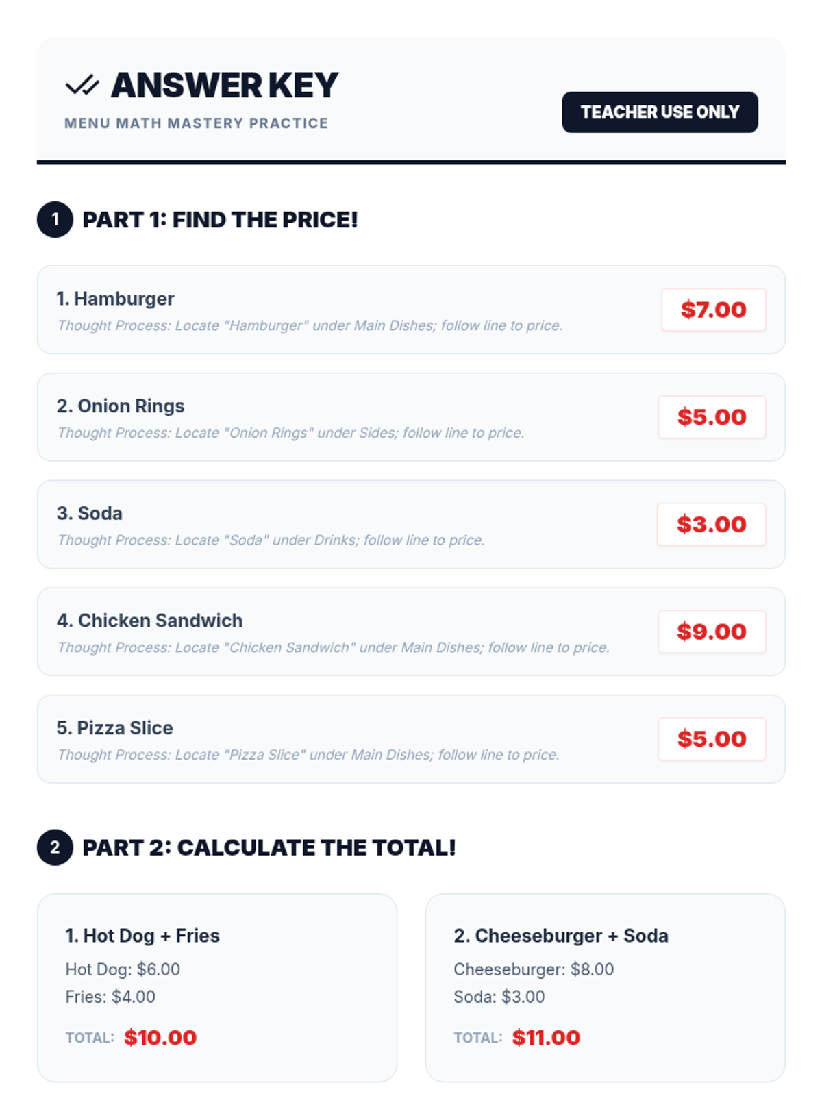 This lesson empowers sophomores with cognitive impairments to confidently apply math skills to real-world menu scenarios. Students will learn to navigate a menu, identify prices, and calculate simple totals for lunch orders.