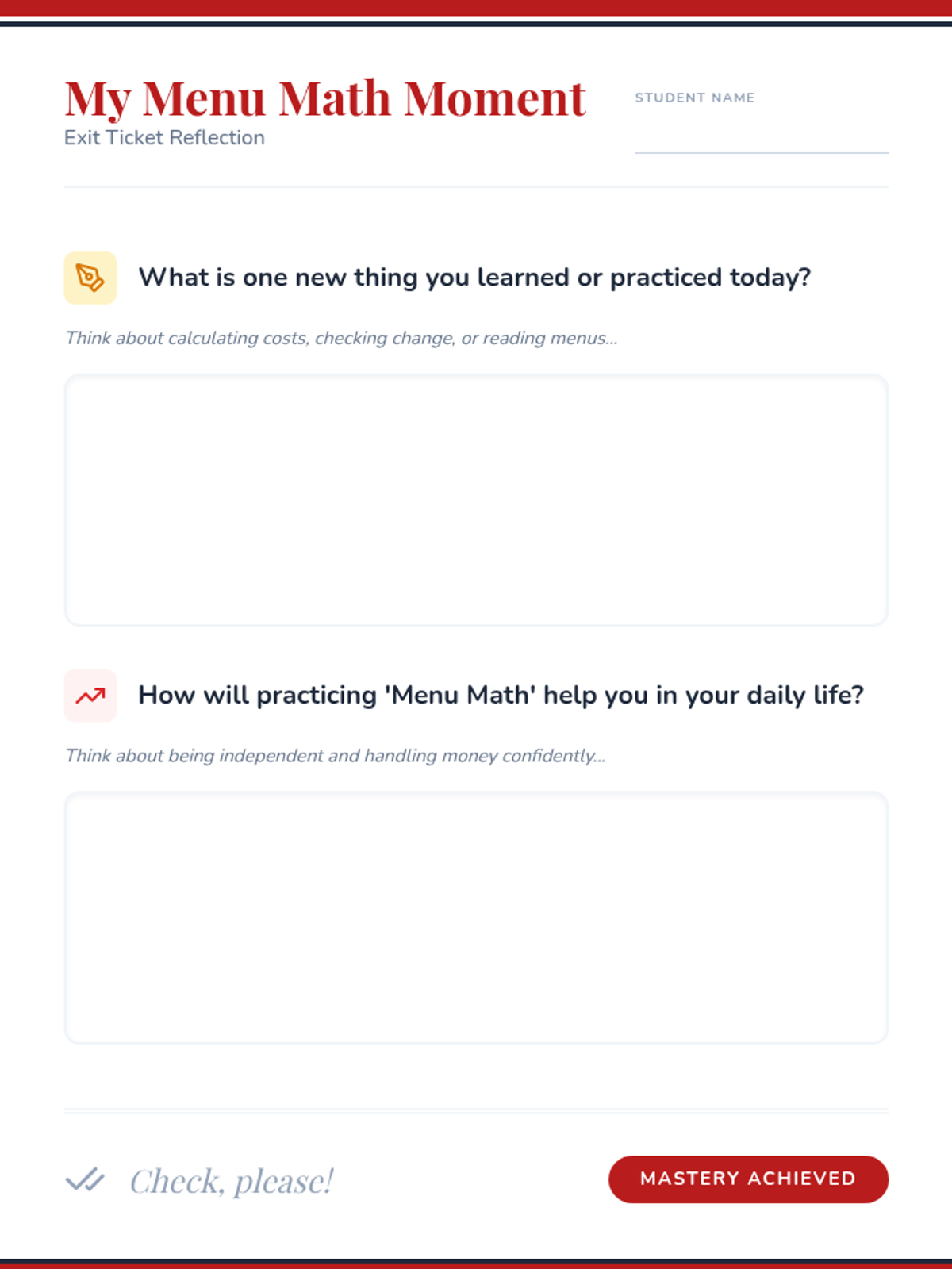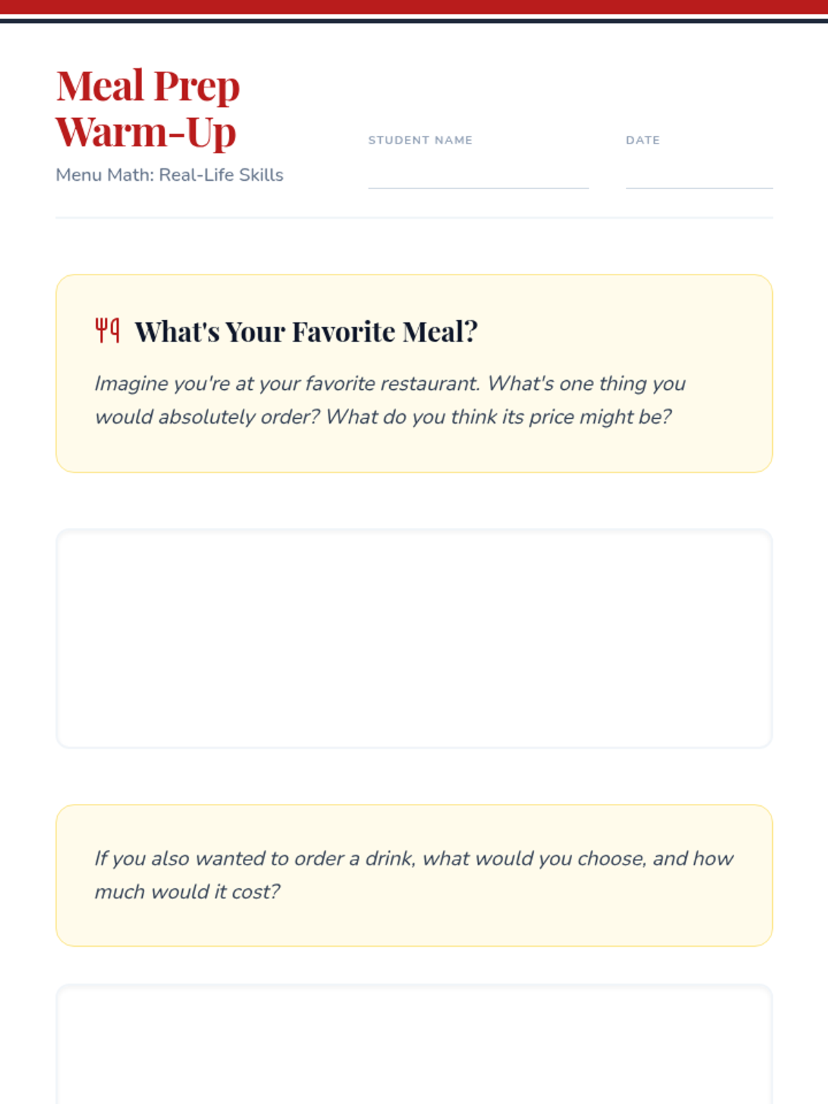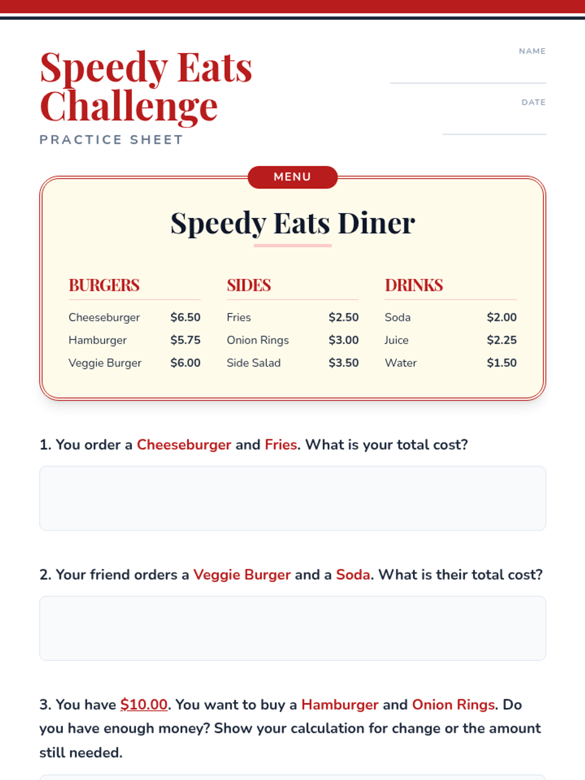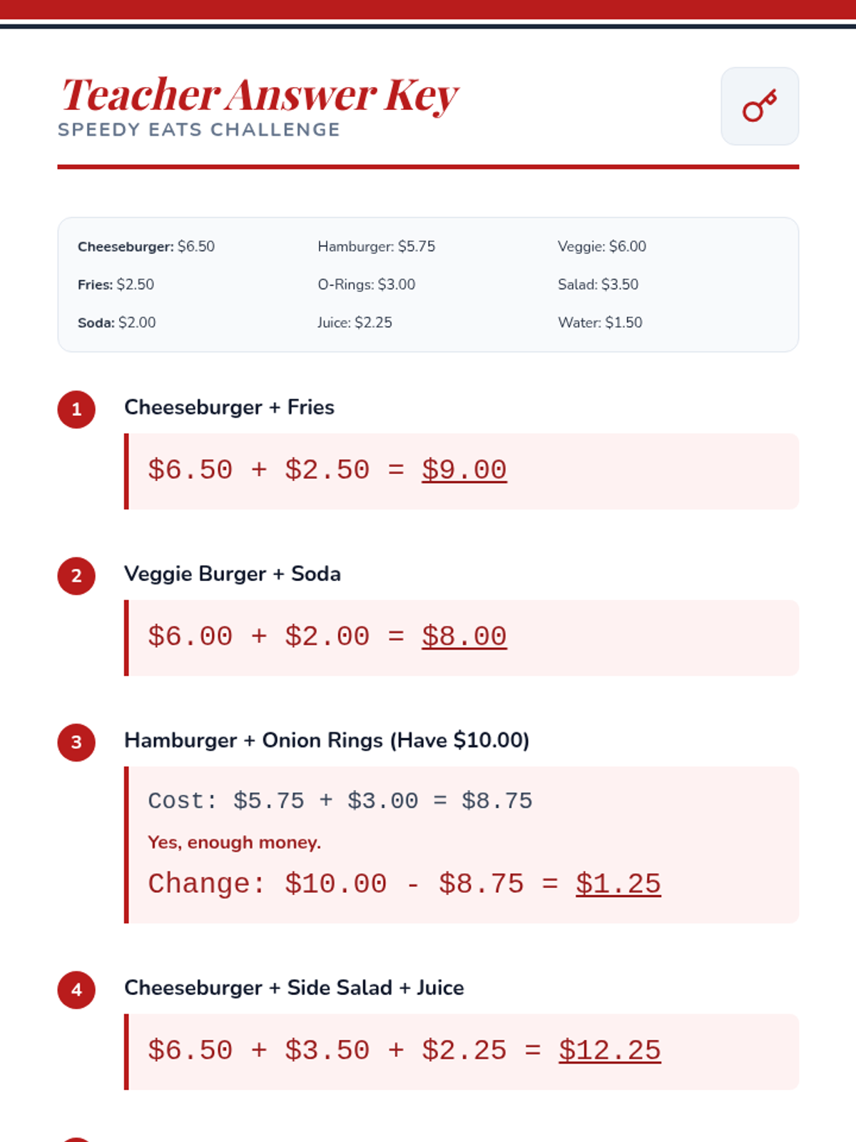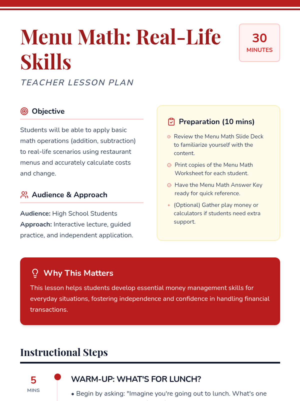 This lesson teaches high school students practical math skills using restaurant menus, focusing on addition, subtraction, and calculating change. Designed for a 30-minute session, it builds financial independence through real-world scenarios.