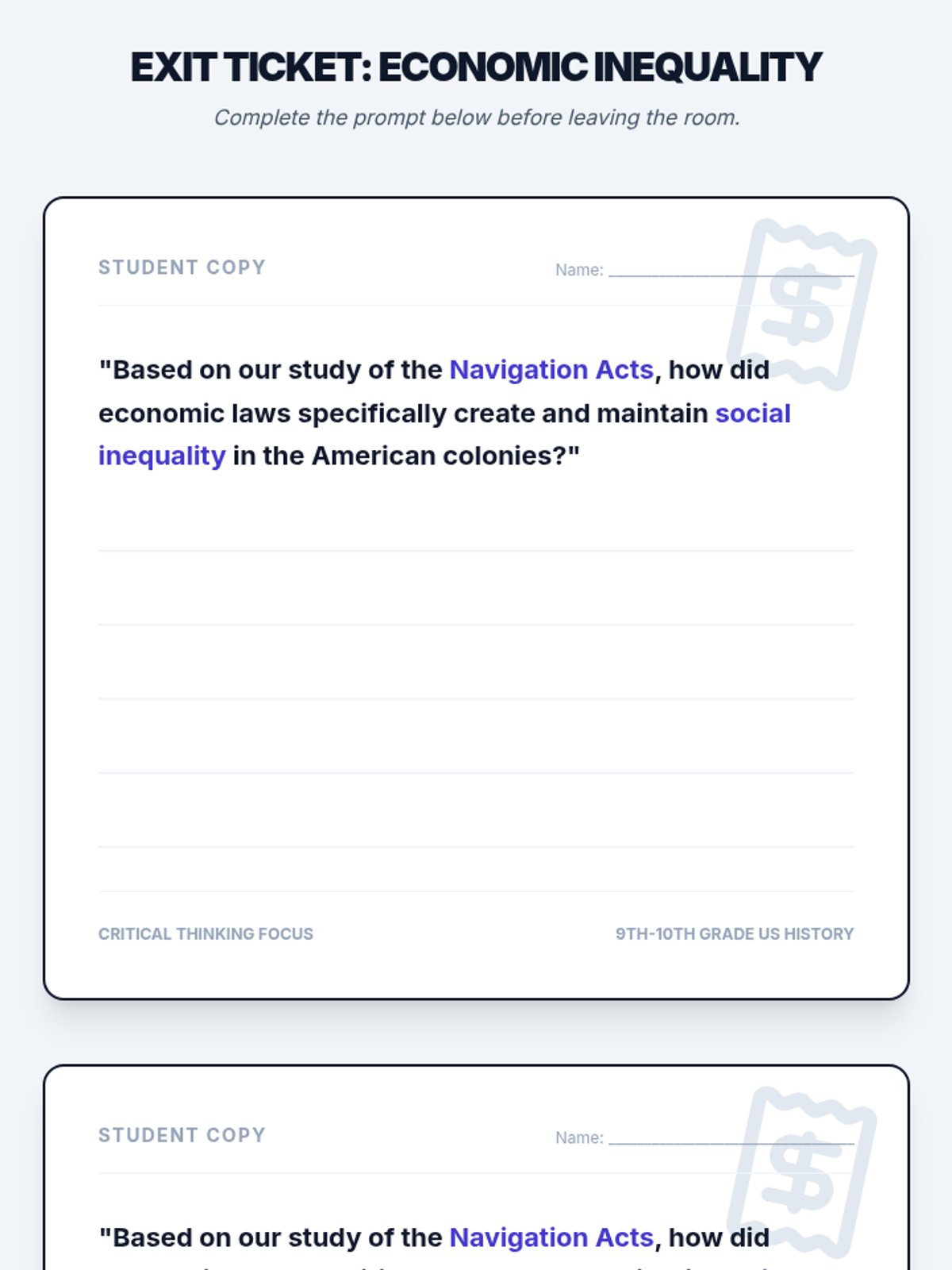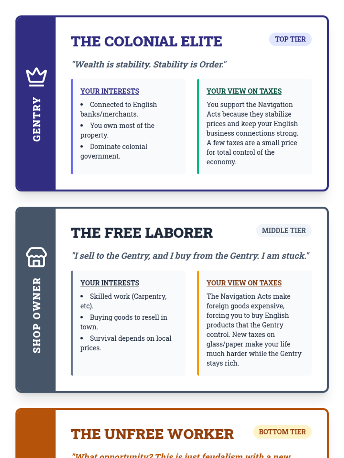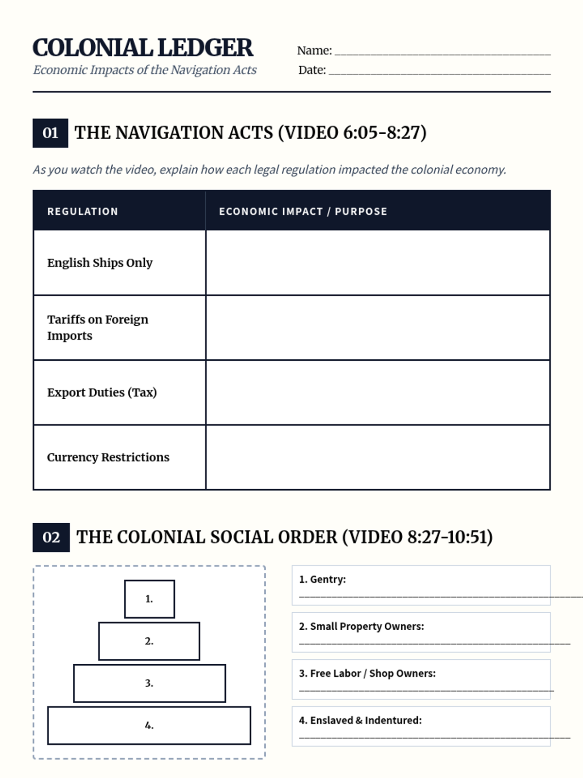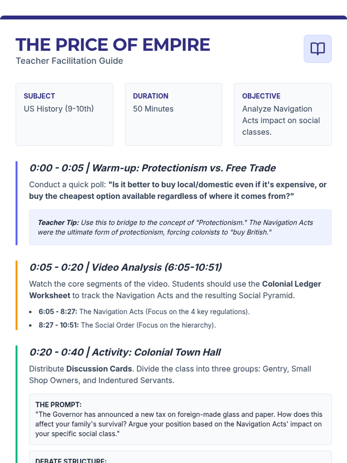 A comprehensive lesson exploring how the Navigation Acts and mercantilism structured colonial society, leading to a rigid social hierarchy and economic dependence on England. Students will analyze the legal framework of the British Empire and role-play as different social classes to understand the human impact of these economic policies.