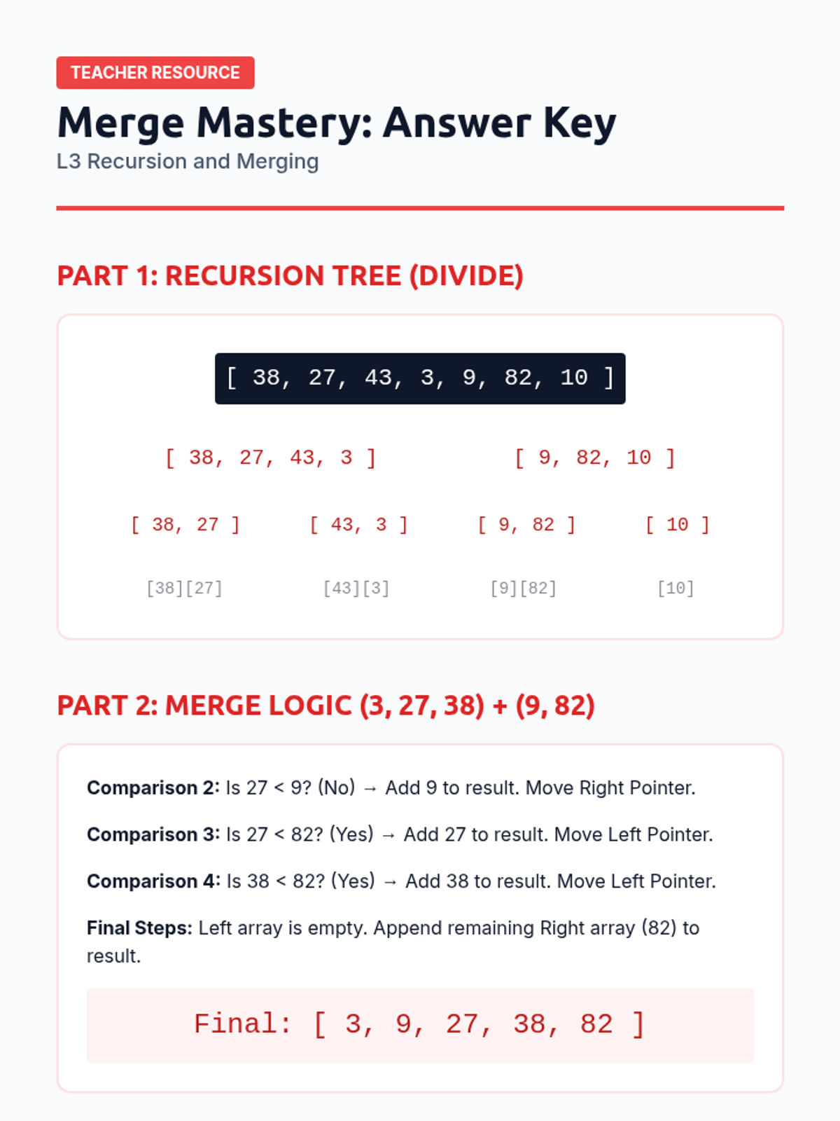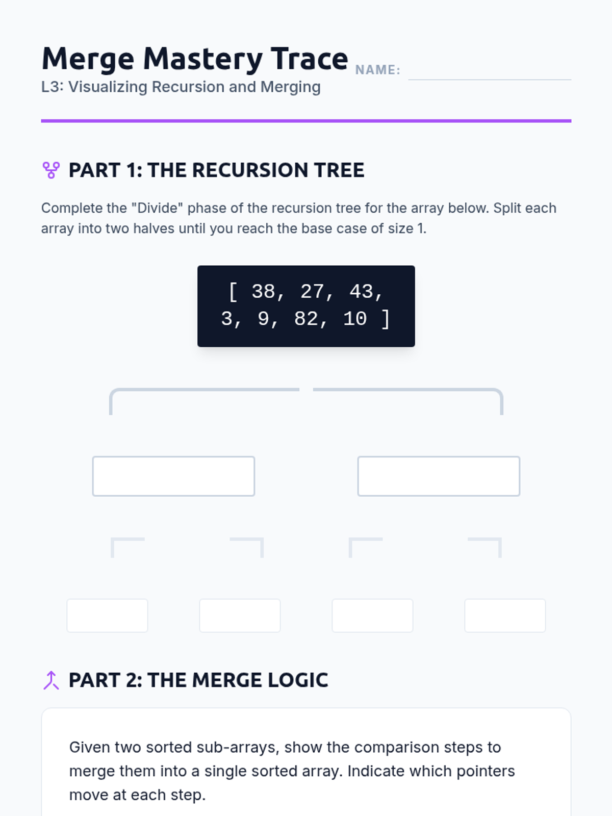 Introduction to recursive divide-and-conquer strategies through Merge Sort, emphasizing stability and O(n log n) performance.