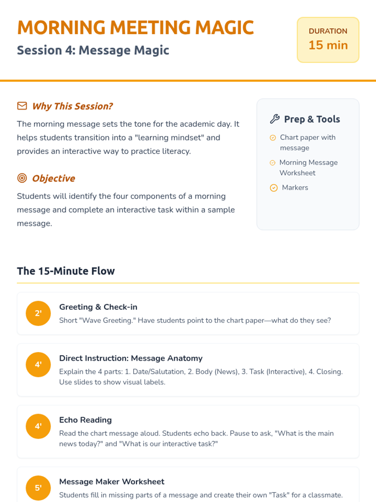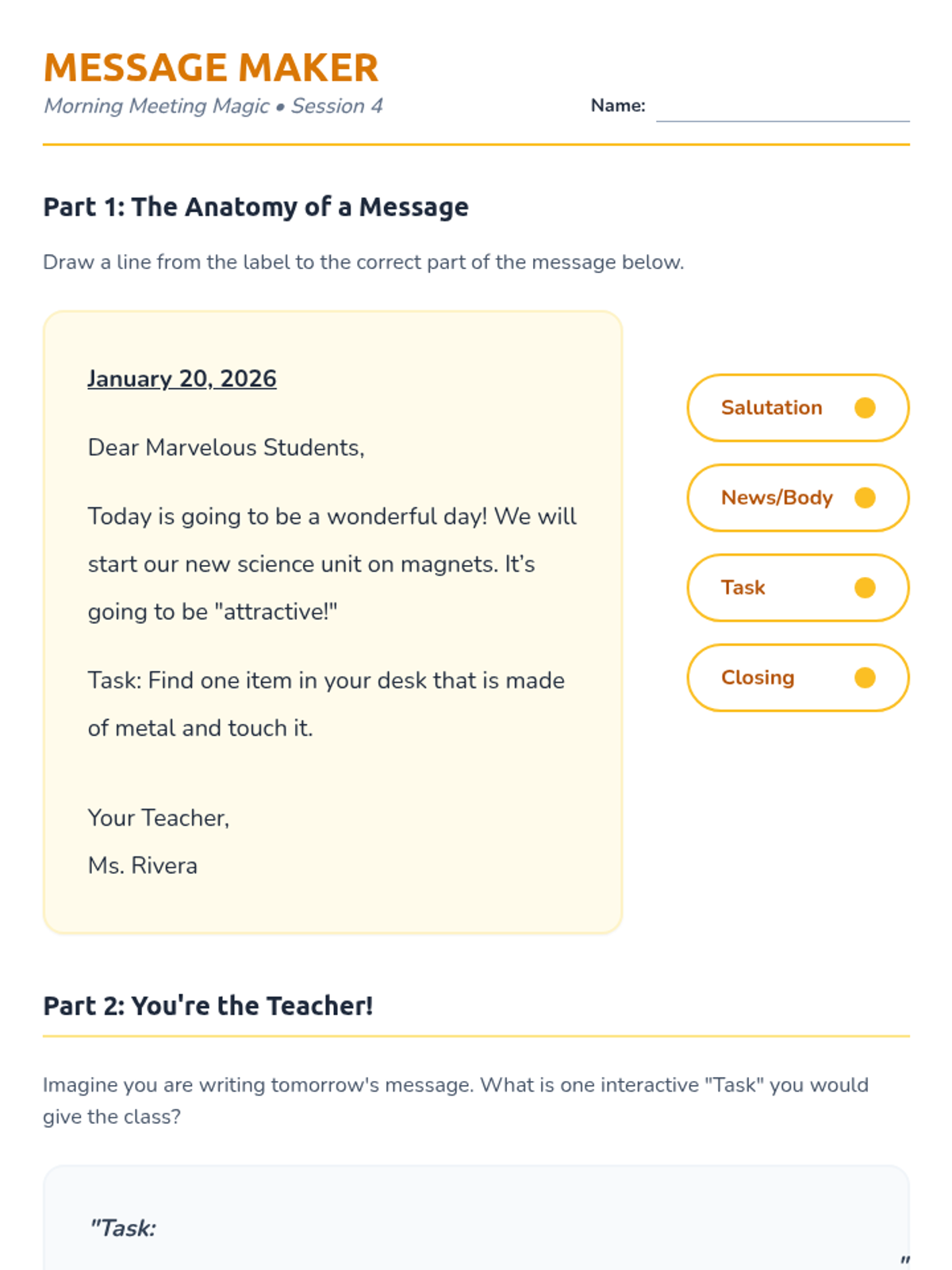 Students learn how to read and interact with the daily morning message to prepare for the day's learning.