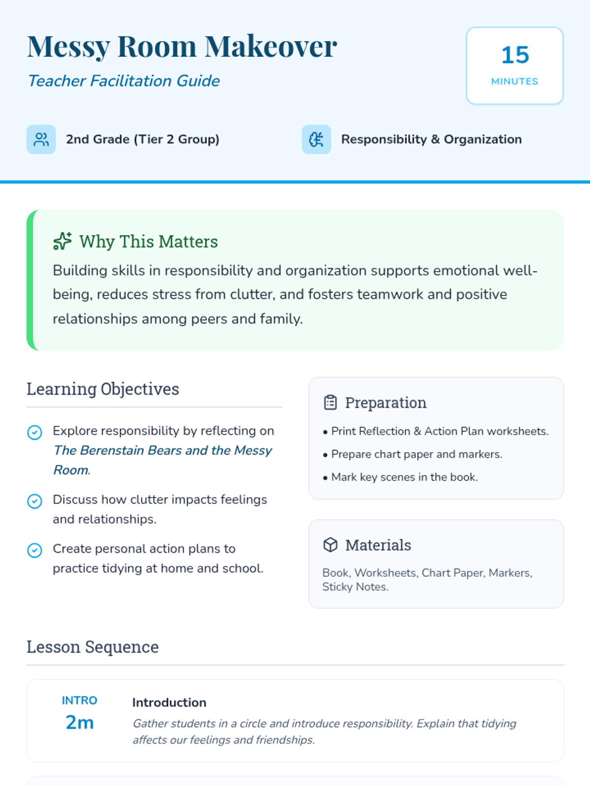 A 15-minute social-emotional lesson for 2nd graders focusing on responsibility and organization using 'The Berenstain Bears and the Messy Room' to explore how tidying impacts feelings and relationships.