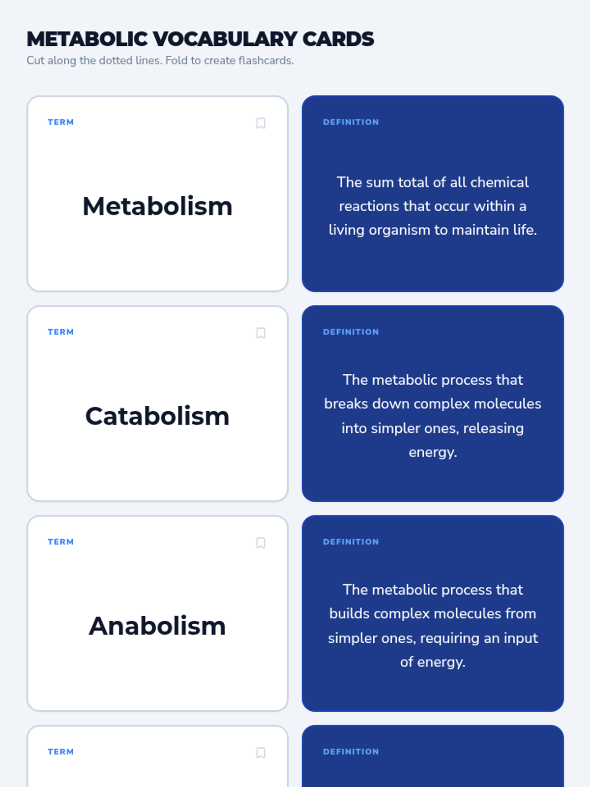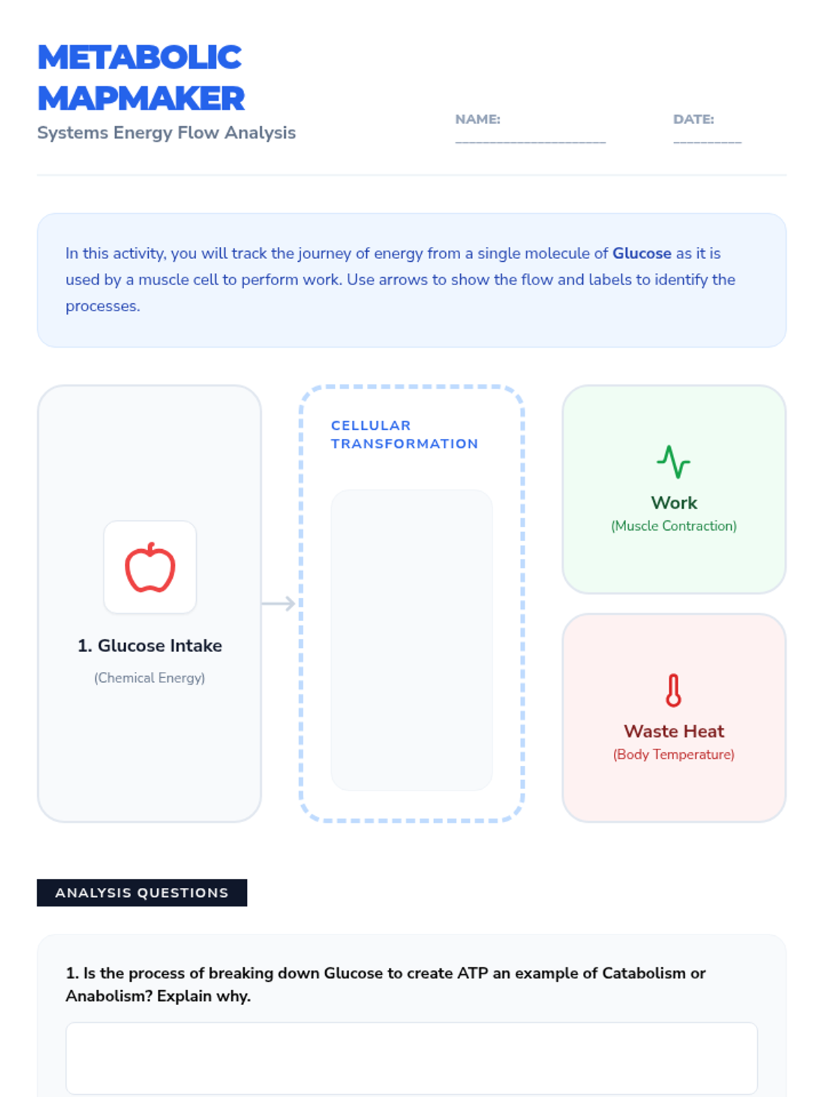 Students explore the concept of metabolism not just as digestion, but as the sum of catabolic and anabolic reactions. They map the flow of energy from intake to heat loss and cellular work.