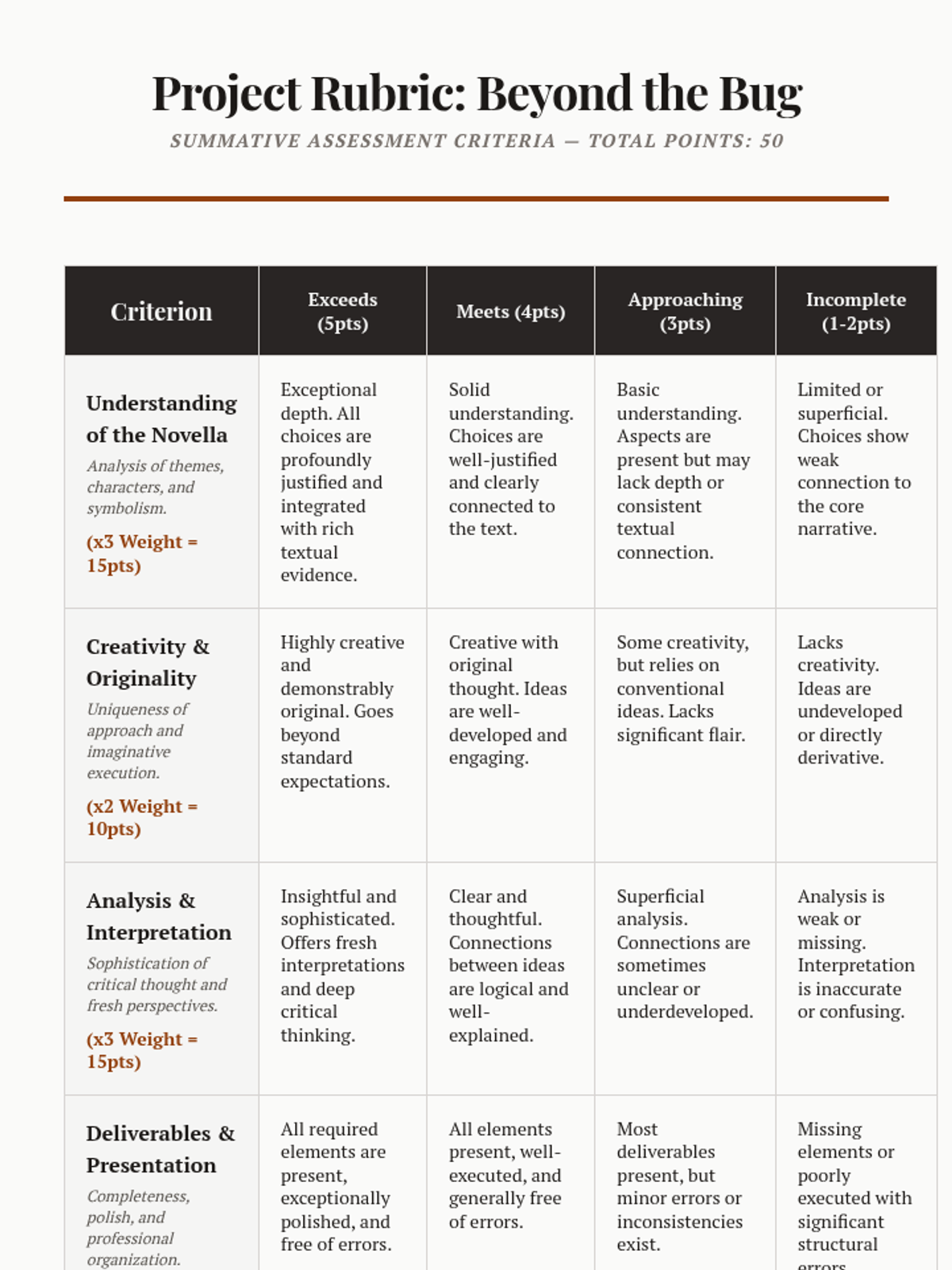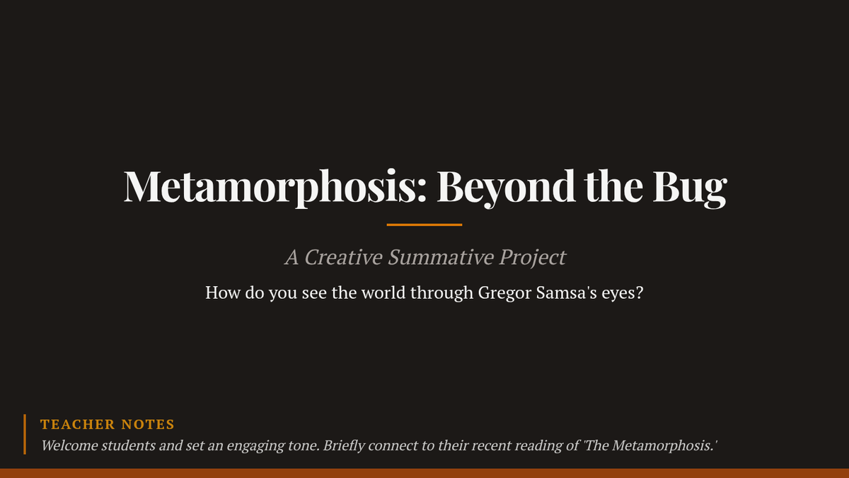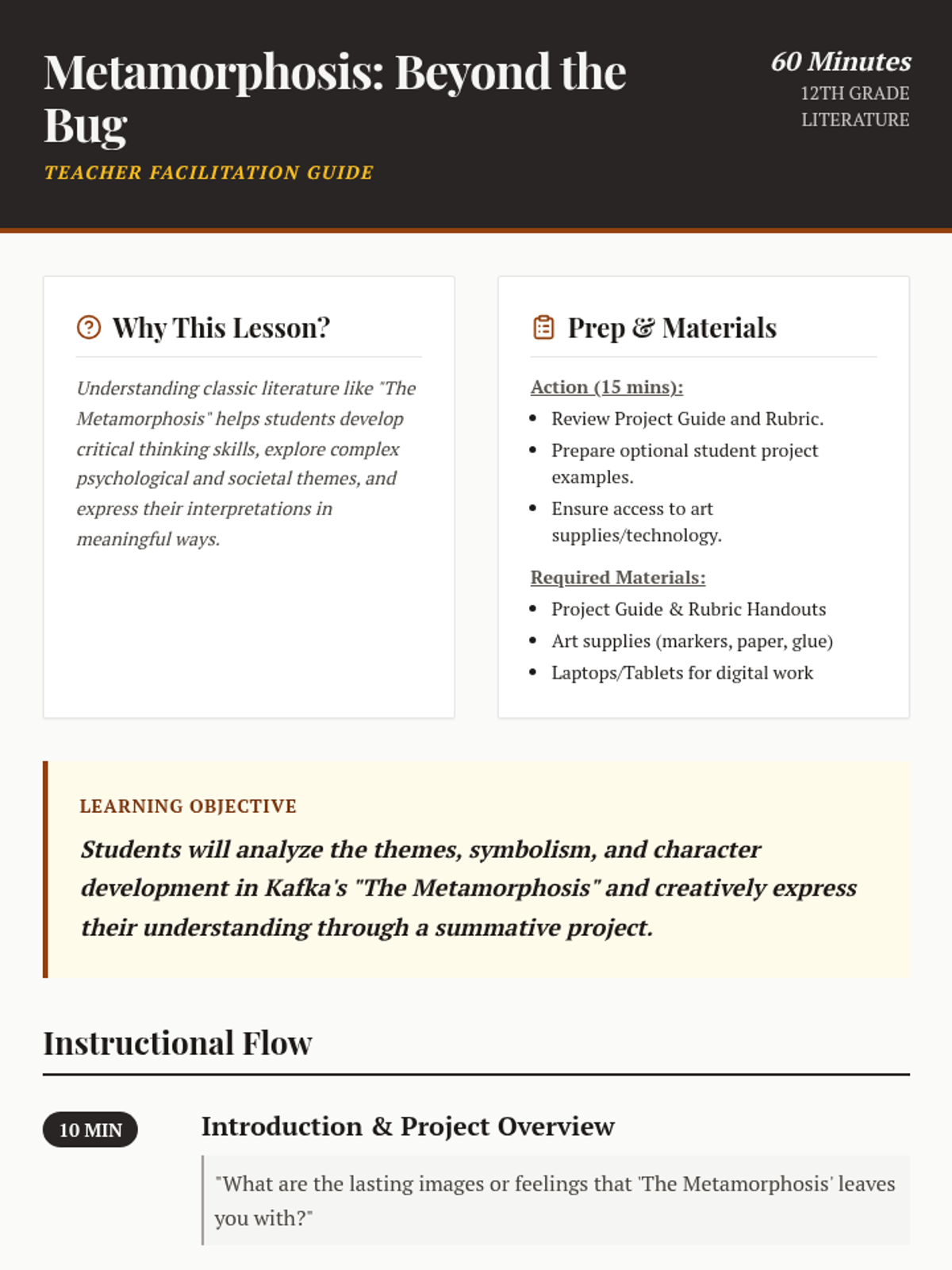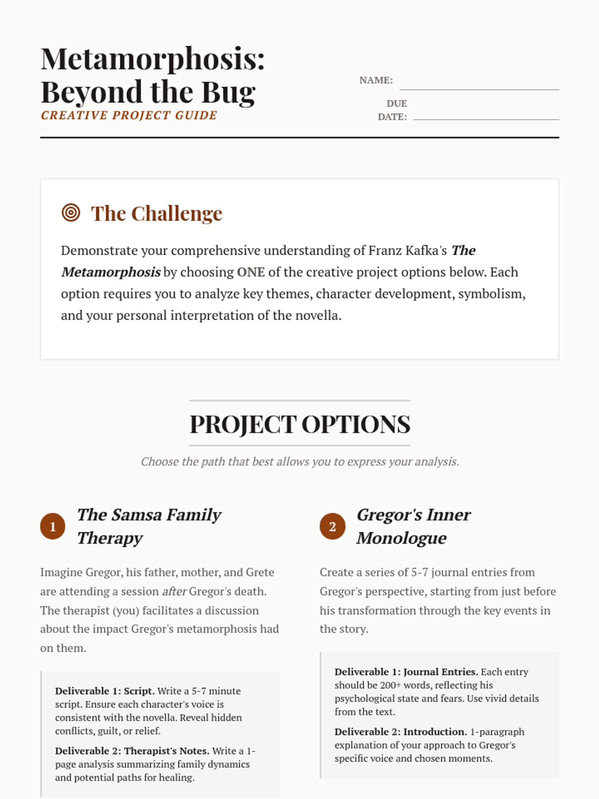 This project challenges 12th-grade students to creatively demonstrate their understanding of Franz Kafka's 'The Metamorphosis' through various artistic and analytical lenses. Students will synthesize key themes, character development, and literary techniques in a summative project over a 60-minute session.