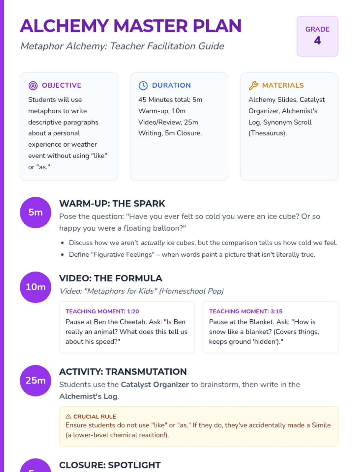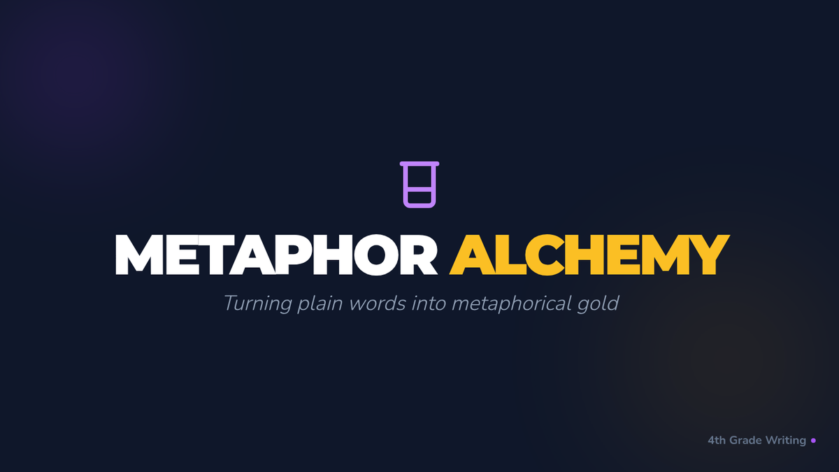 A 4th-grade creative writing lesson where students transform plain descriptions into 'metaphorical gold' through a 'Word Alchemy' theme, using a video-led discussion and a structured creative writing activity.