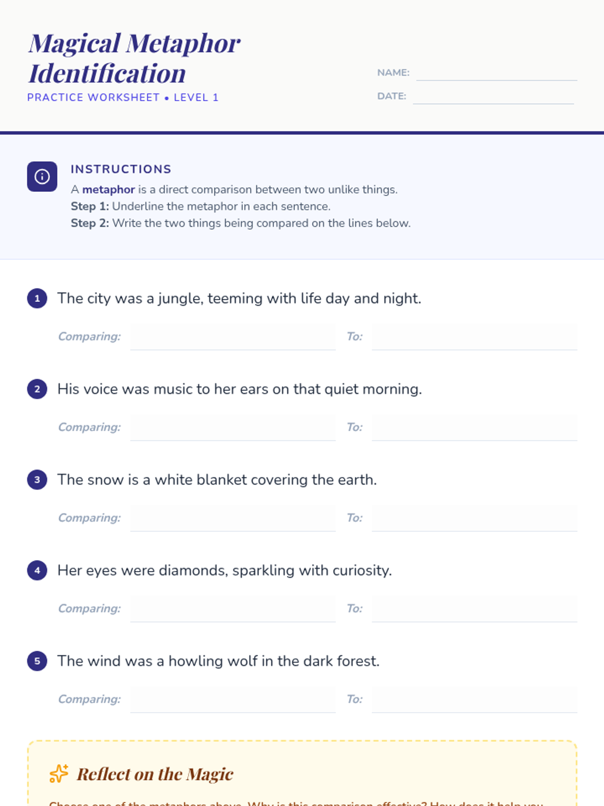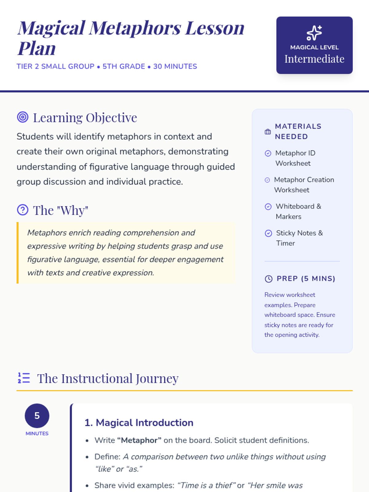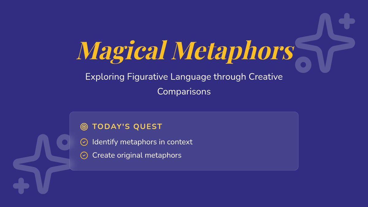 In this 30-minute Tier 2 small-group lesson, 5th graders will explore how metaphors bring writing to life by comparing two unlike things. Students will practice identifying and creating metaphors to strengthen their reading comprehension and creative writing skills.