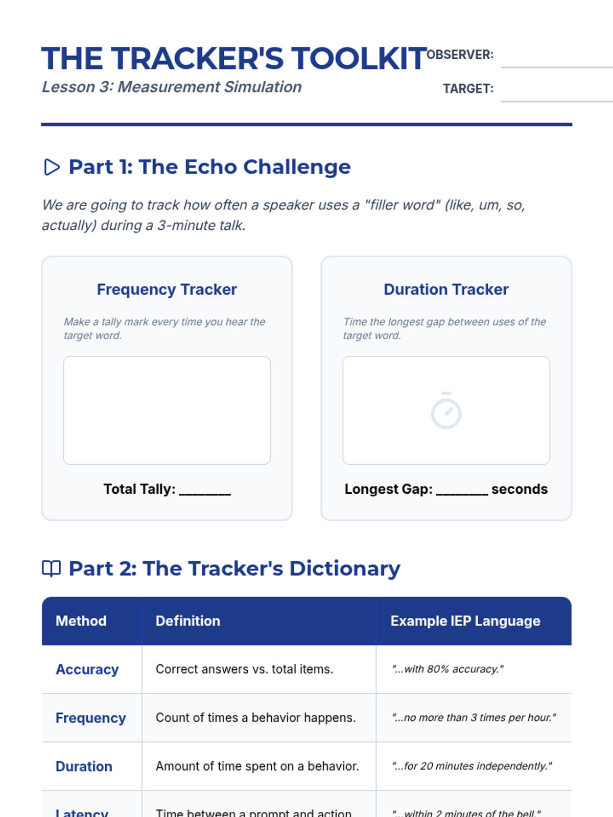 Students explore accuracy, frequency, and duration through a simulation and learn how data is collected to measure progress toward their goals.