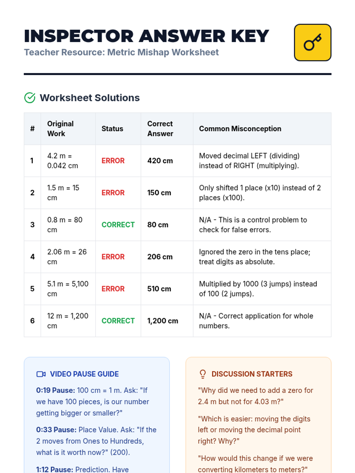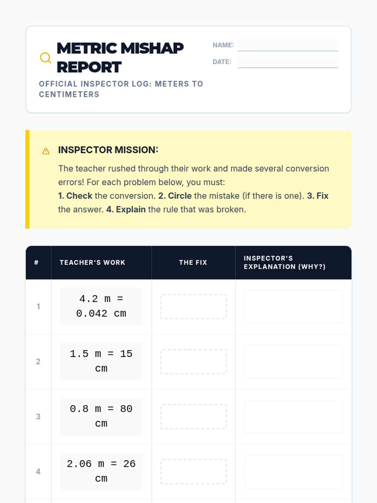 A 4th-grade lesson where students become 'Metric Inspectors' to identify and correct common errors in converting meters to centimeters using the 'Two Jump Rule'.