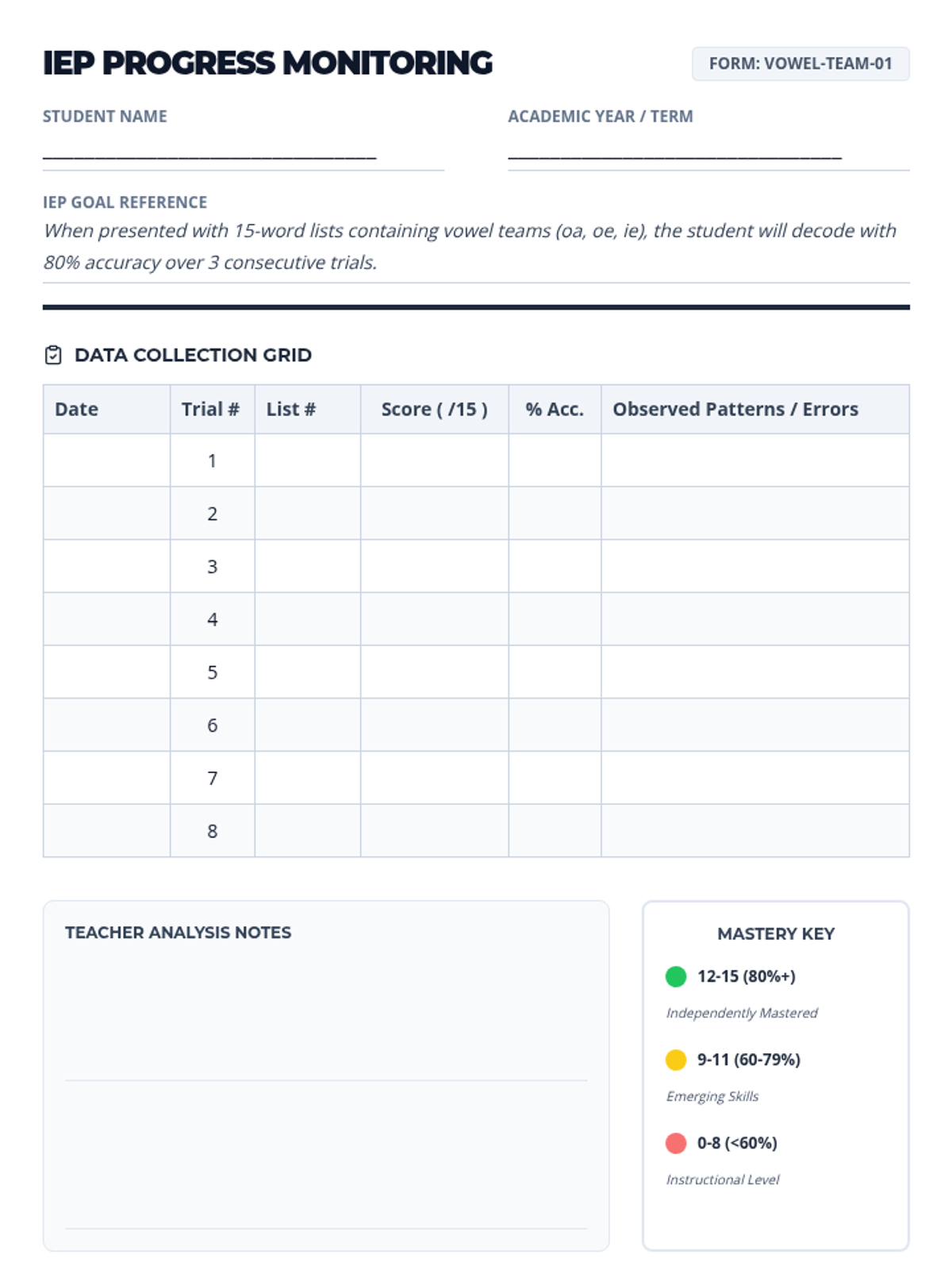 A comprehensive progress monitoring collection featuring 5 distinct word sets (75 words total) for tracking mastery of vowel teams and diphthongs. Each set includes a student reading list and a multi-trial teacher tracking sheet.