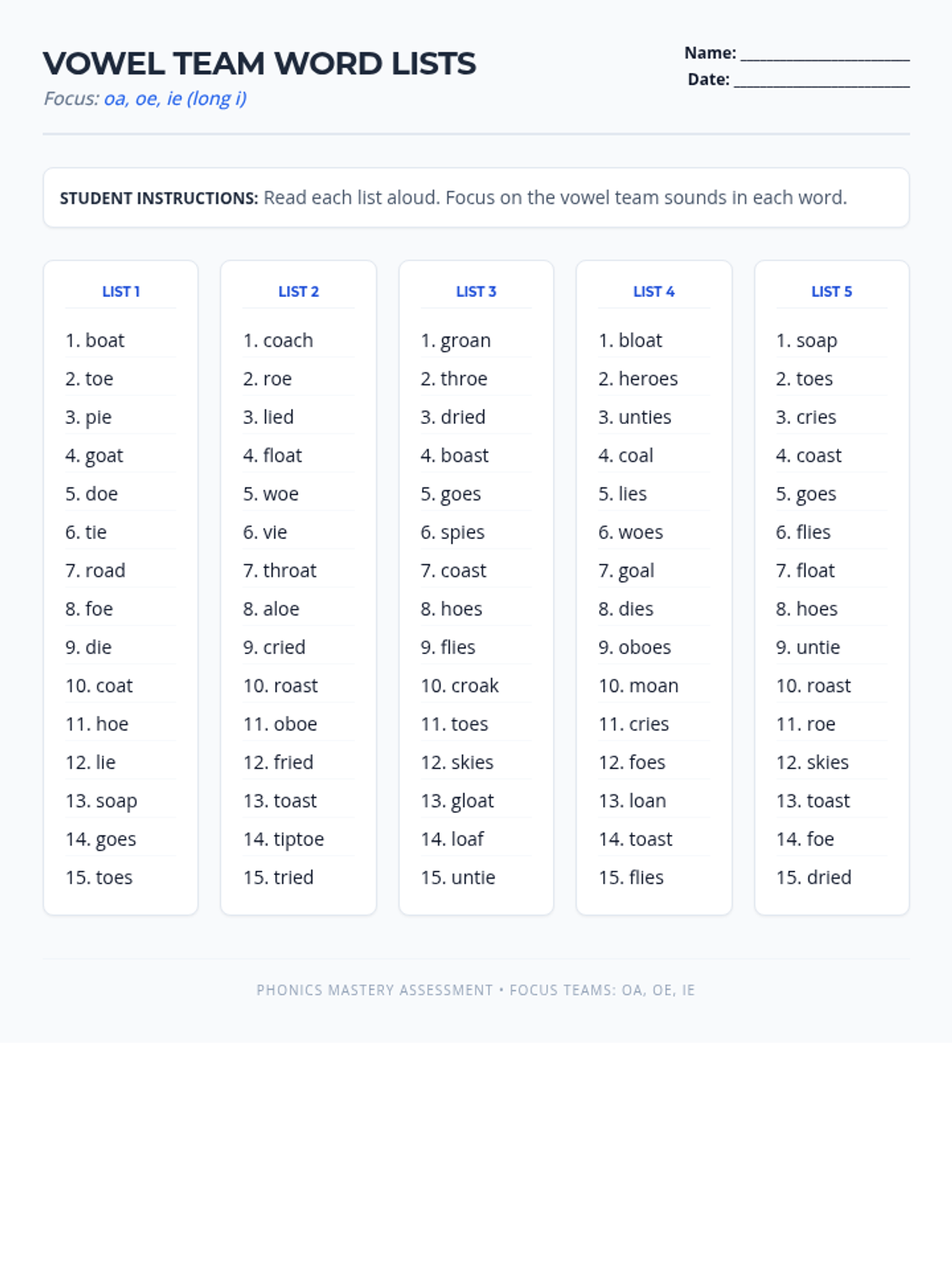 A collection of word lists and tracking tools focusing on the 'oa', 'oe', and 'ie' (long i) vowel teams. Designed for structured literacy practice and IEP data collection.
