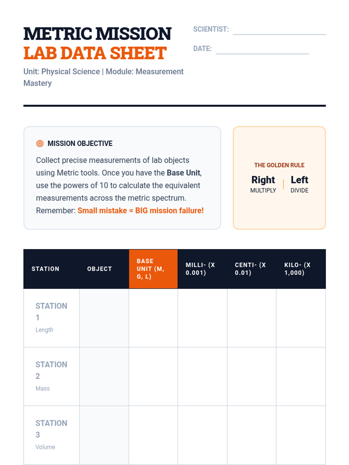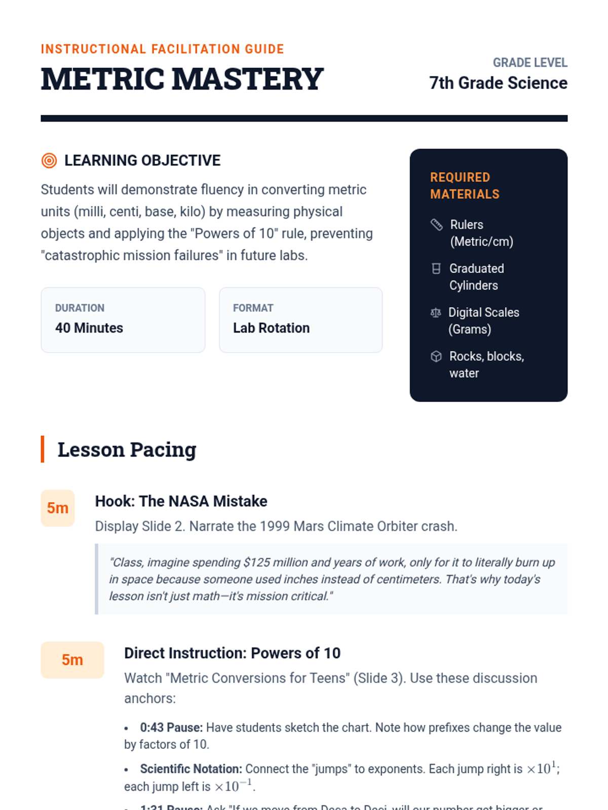 A hands-on introductory lesson to the Metric System and unit conversions, featuring the infamous NASA Mars Climate Orbiter mistake and a 5-station lab rotation.