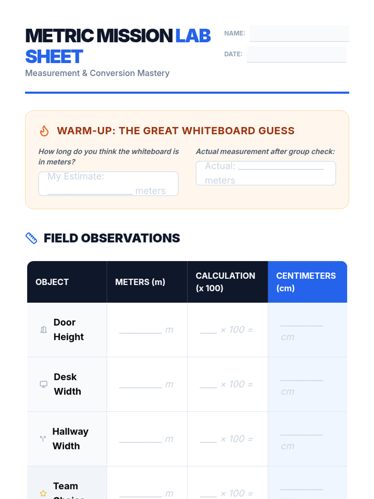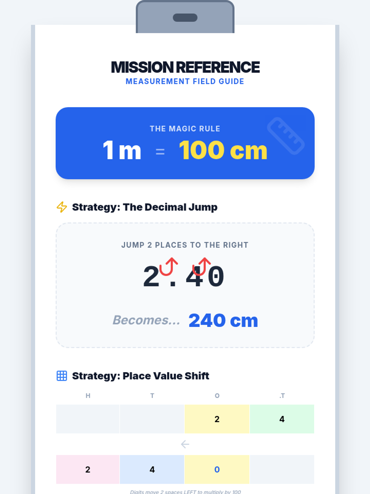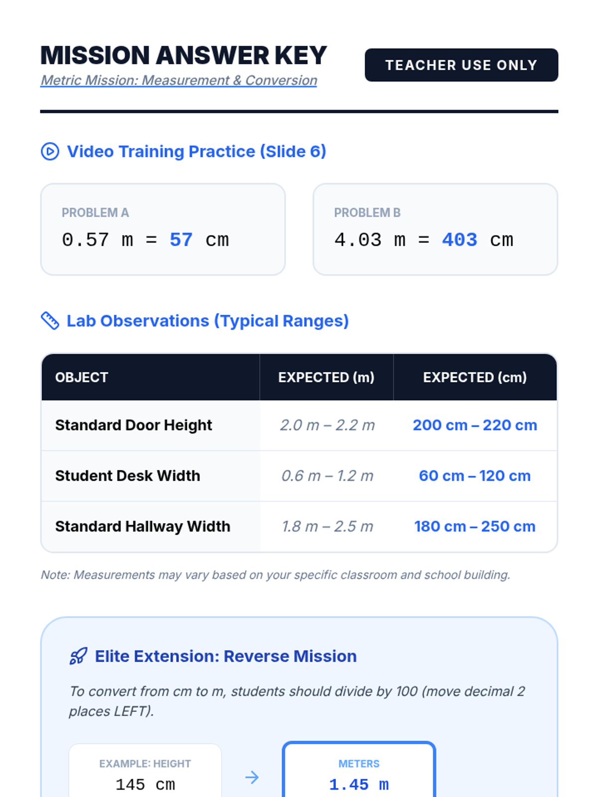 Students will learn to convert meters to centimeters using place value shifts and decimal jumping, then apply these skills to measure and compare real-world classroom objects.