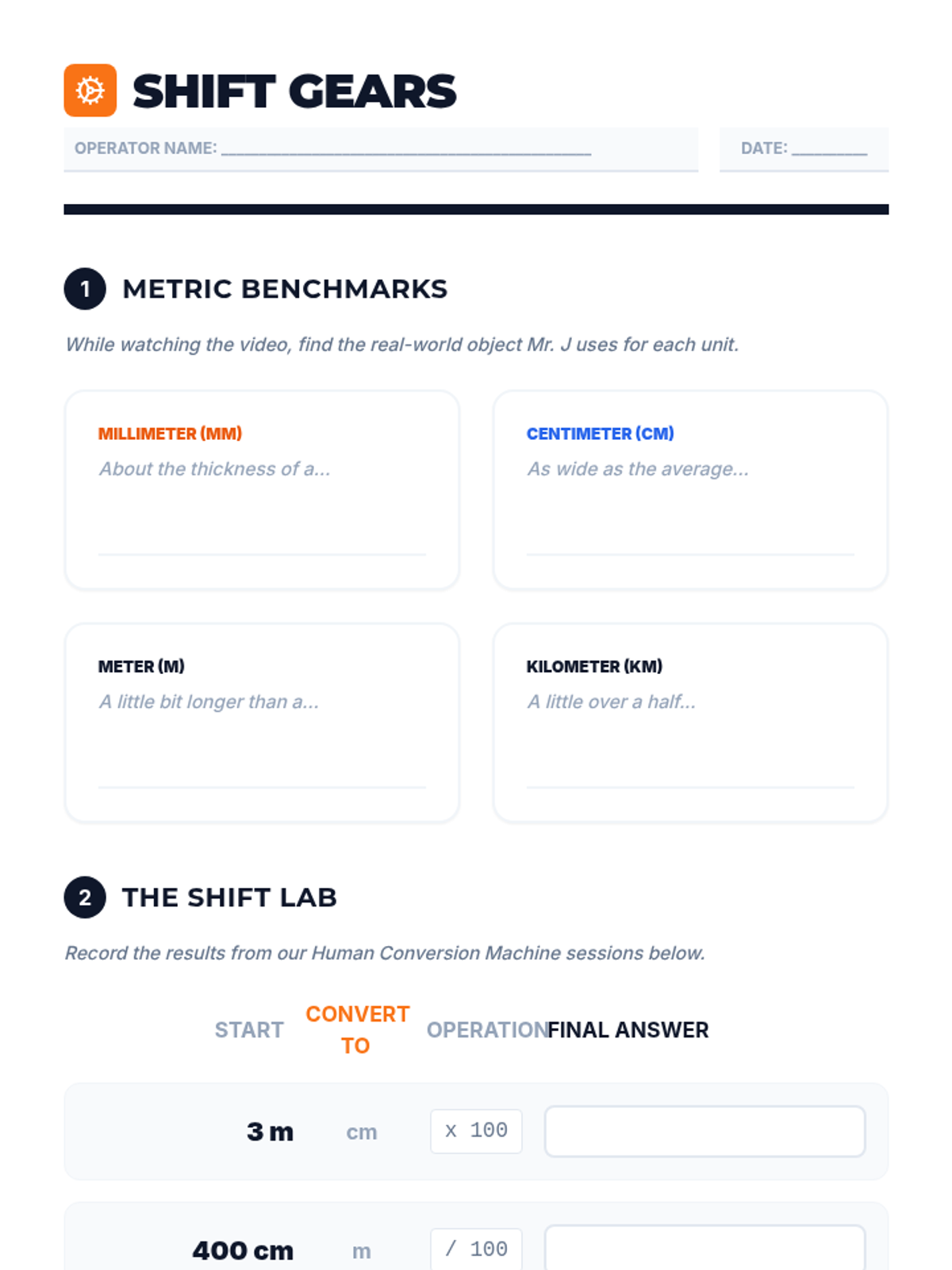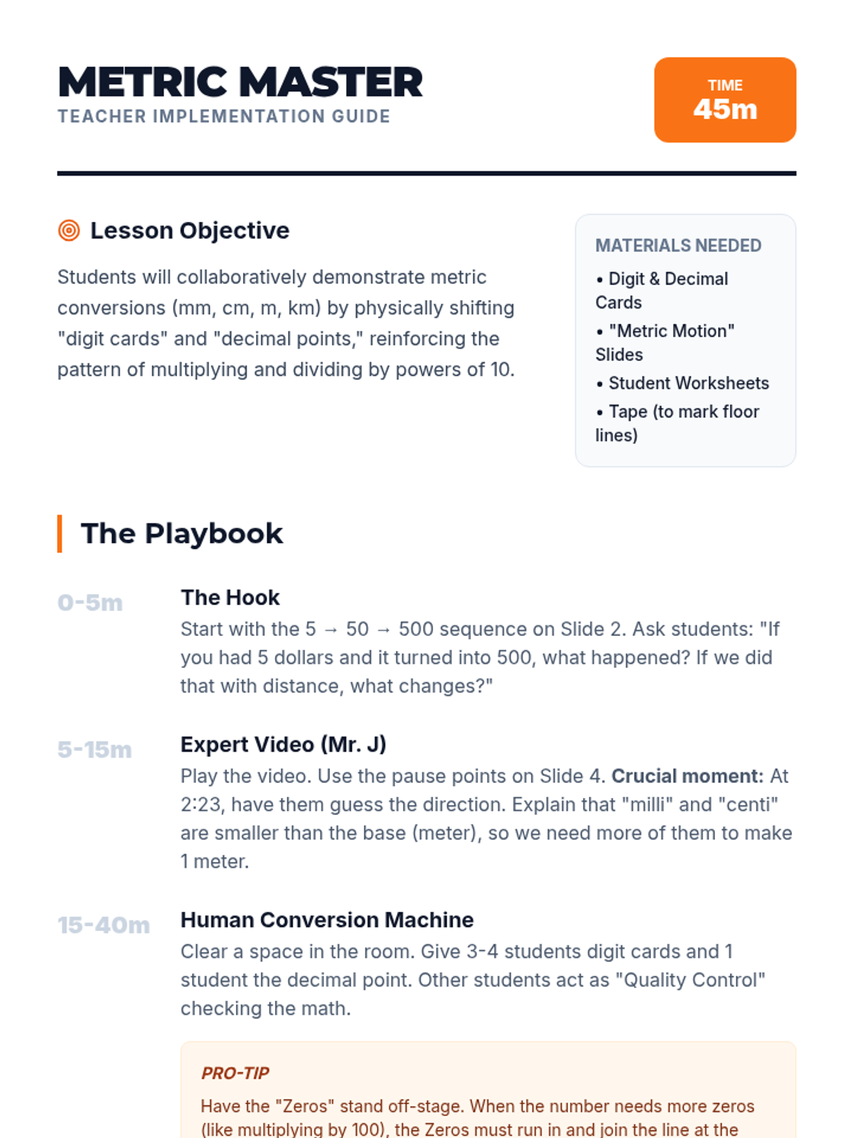 A high-energy, hands-on lesson where students physically move to represent decimal shifts during metric conversions. Using a 'Human Conversion Machine' approach, students master multiplying and dividing by 10, 100, and 1,000.