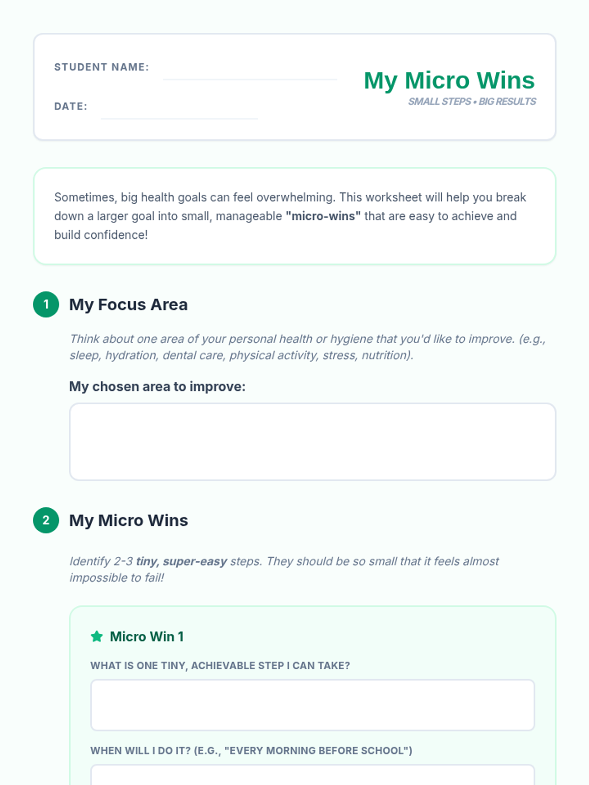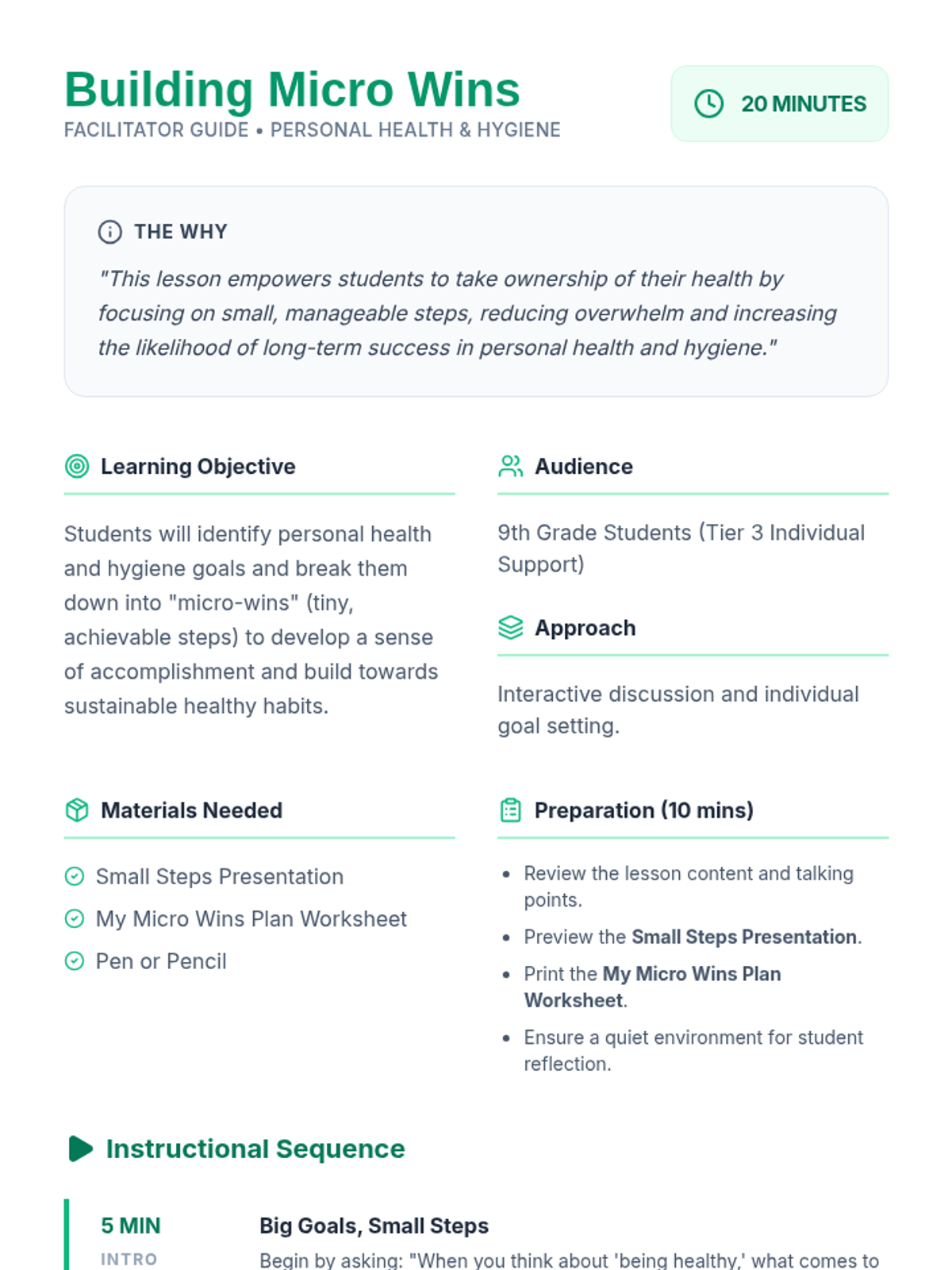 A 20-minute Tier 3 lesson for 9th graders focused on breaking down health and hygiene goals into tiny, achievable 'micro-wins' to build confidence and lasting habits.