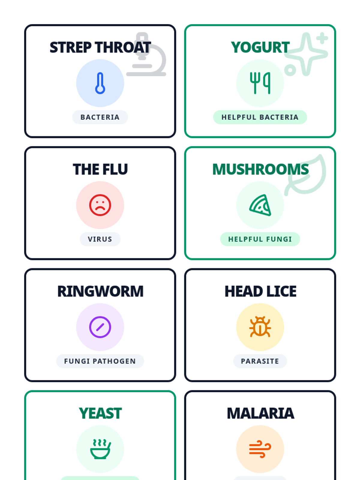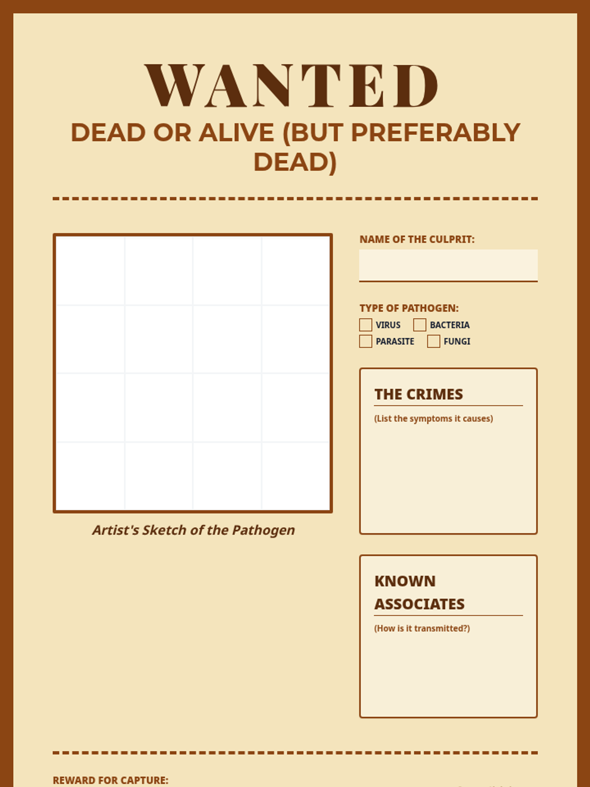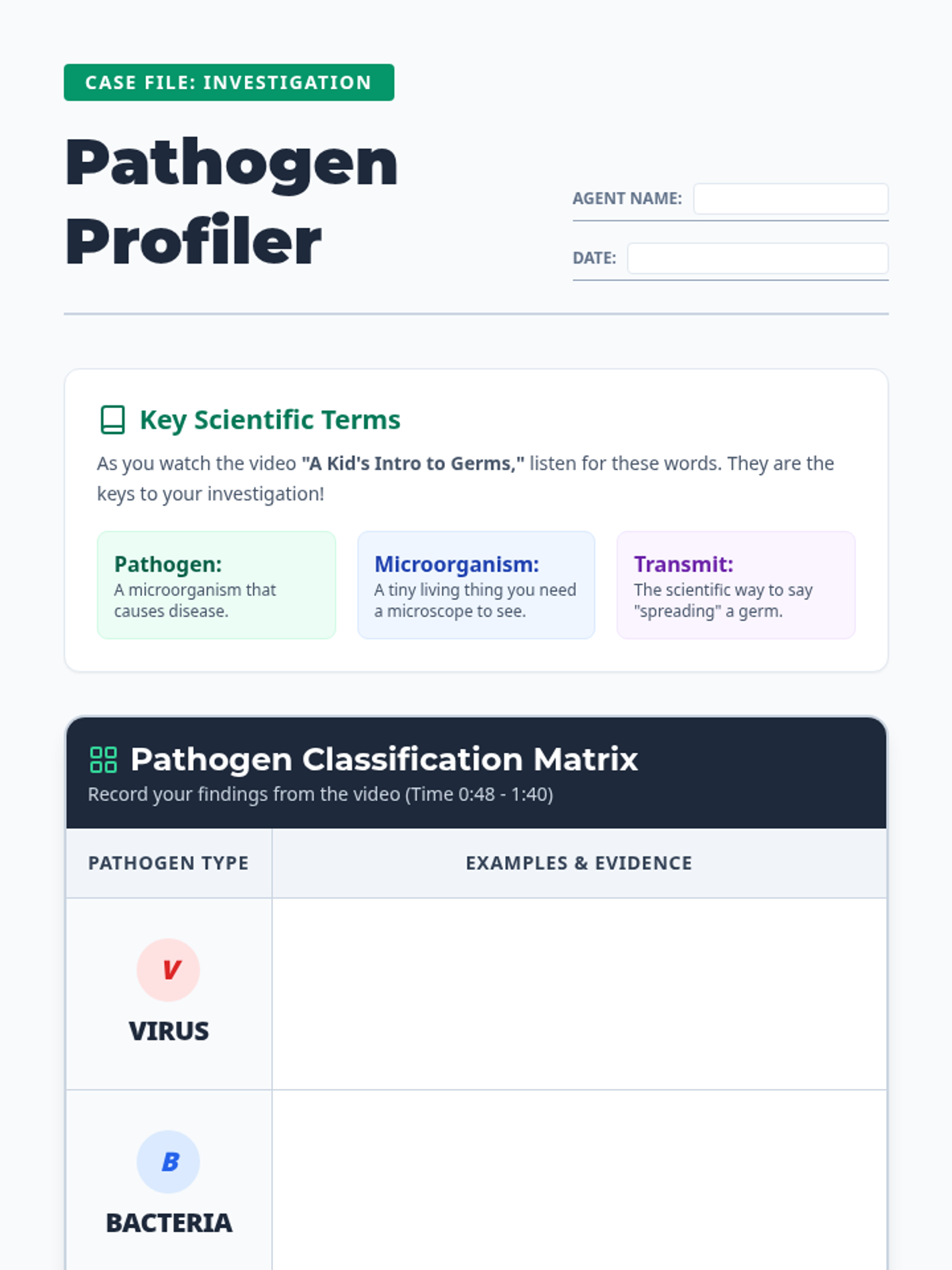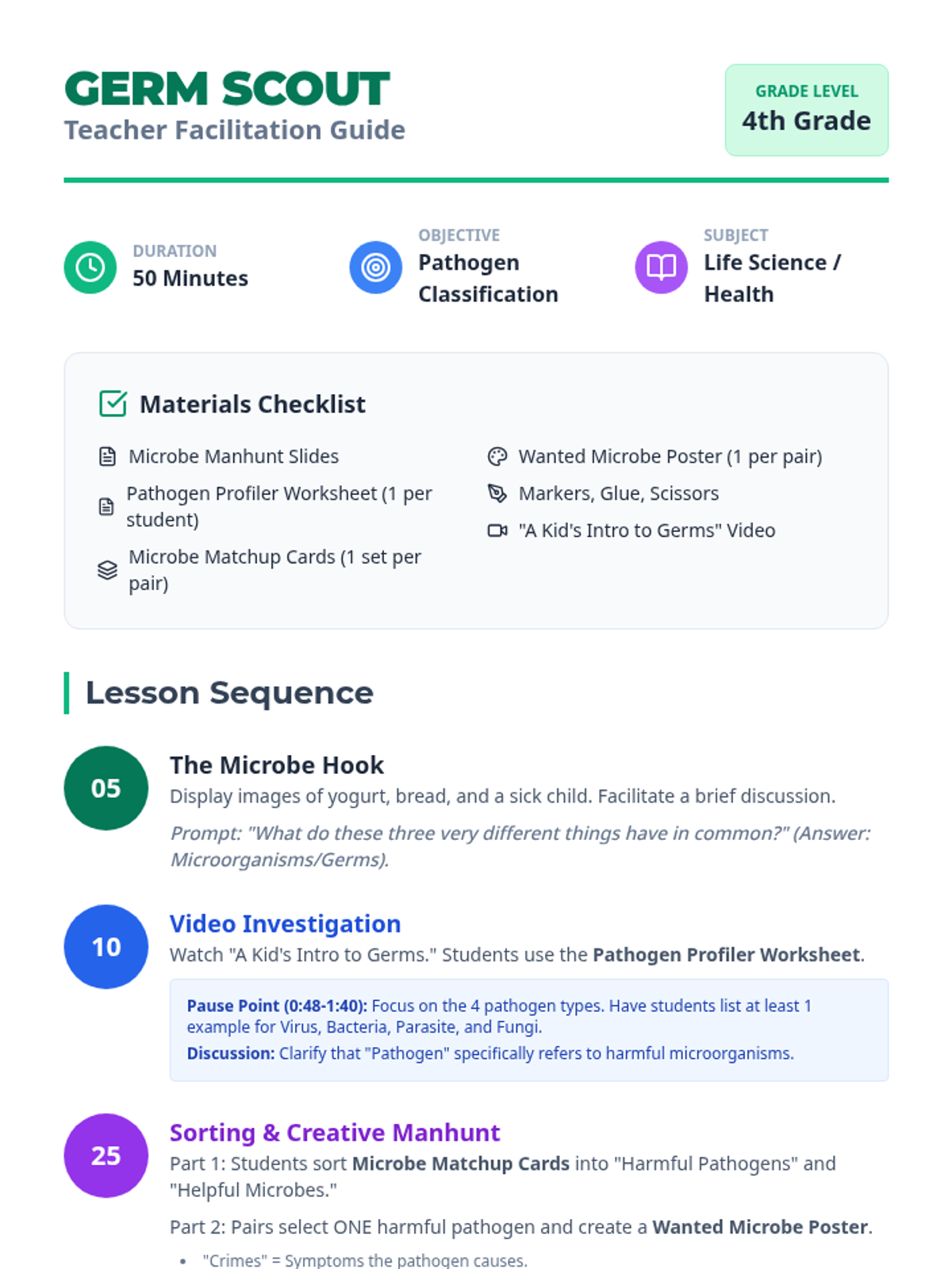 Students will investigate the world of microorganisms, distinguishing between harmful pathogens (viruses, bacteria, parasites, fungi) and beneficial microbes through a video-based matrix, a sorting challenge, and a creative 'Wanted Poster' project.