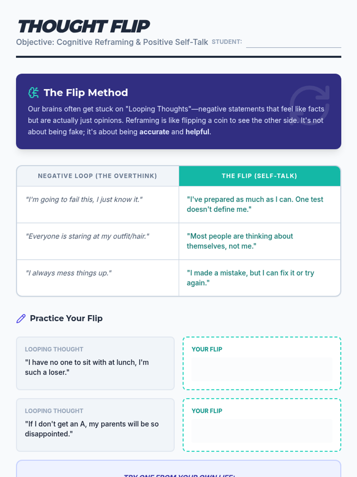 Teaches cognitive reframing (positive self-talk) and grounding techniques to manage overthinking and emotional overwhelm.