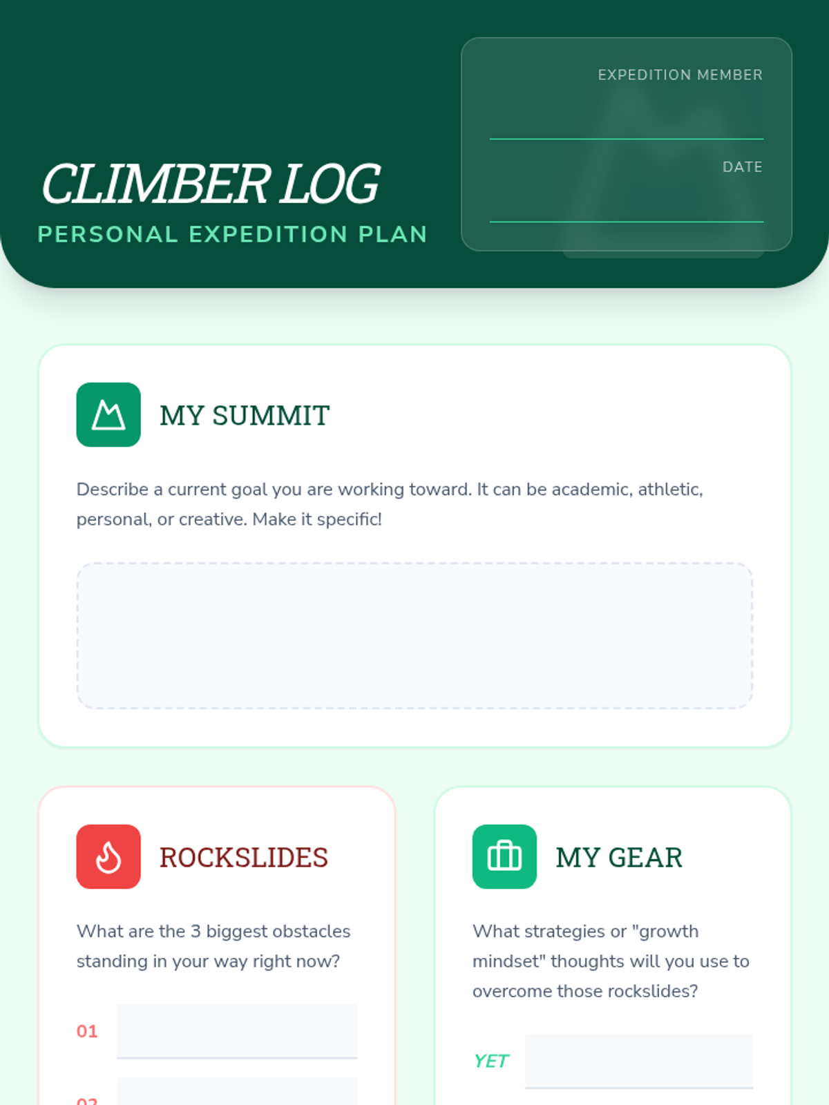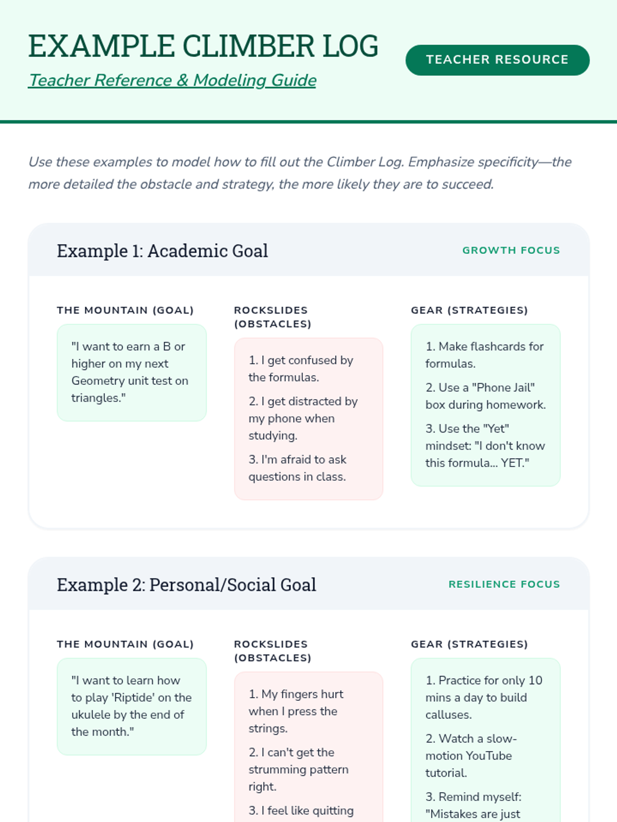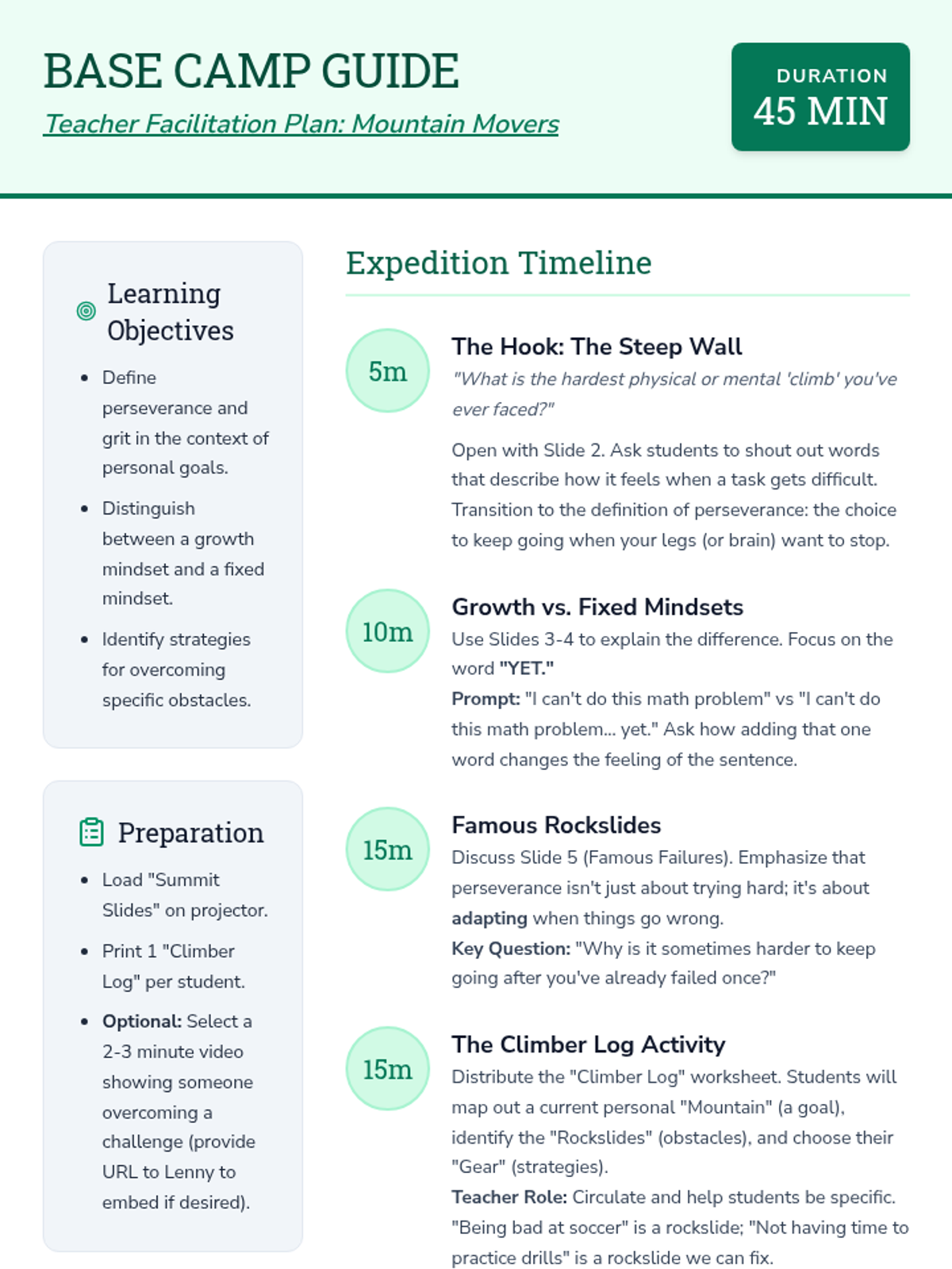A 45-minute character development lesson for 7th graders focusing on perseverance through the metaphor of mountain climbing, covering growth mindset and overcoming obstacles.