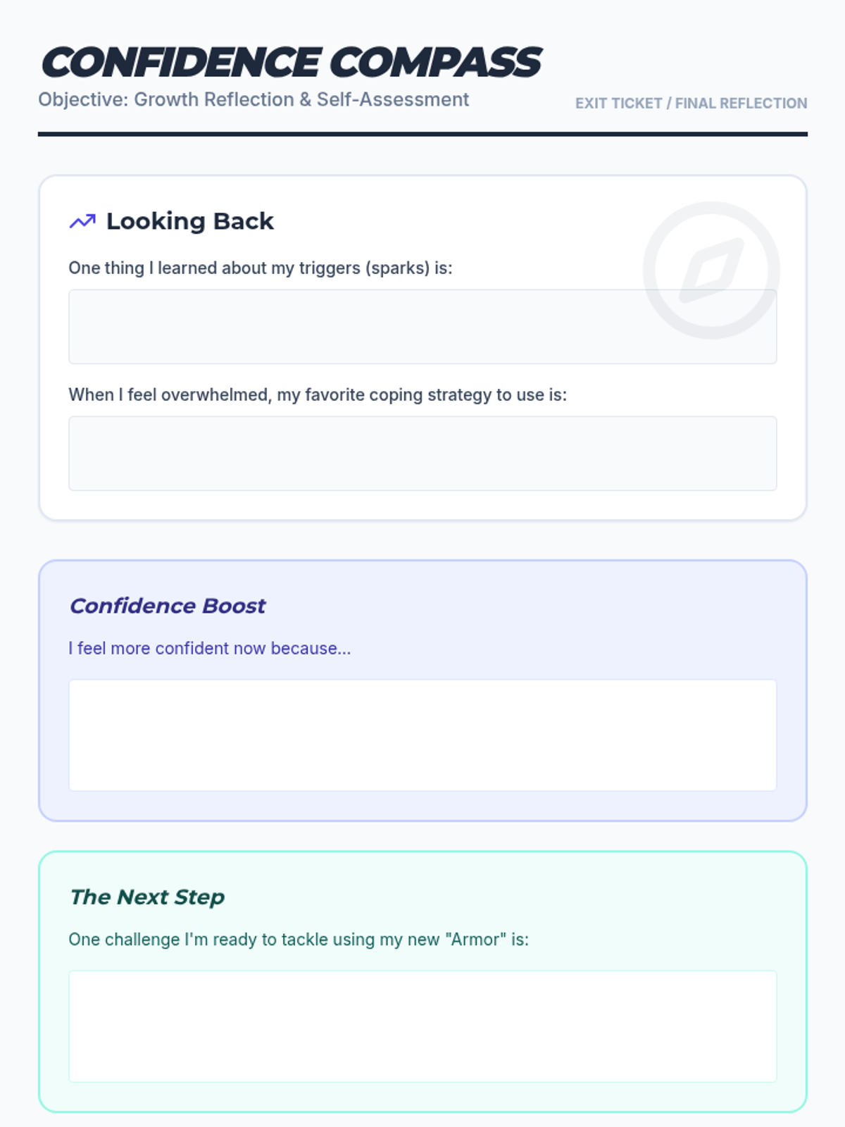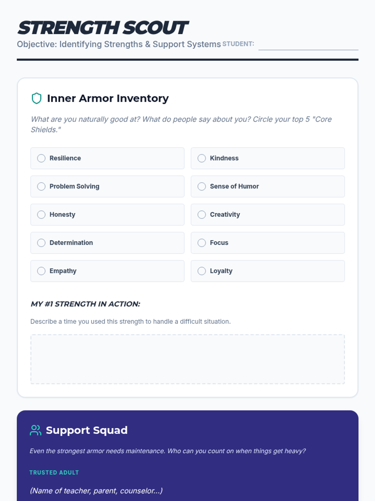 Empowers students to recognize their inner strengths, build self-confidence, and identify a support network.