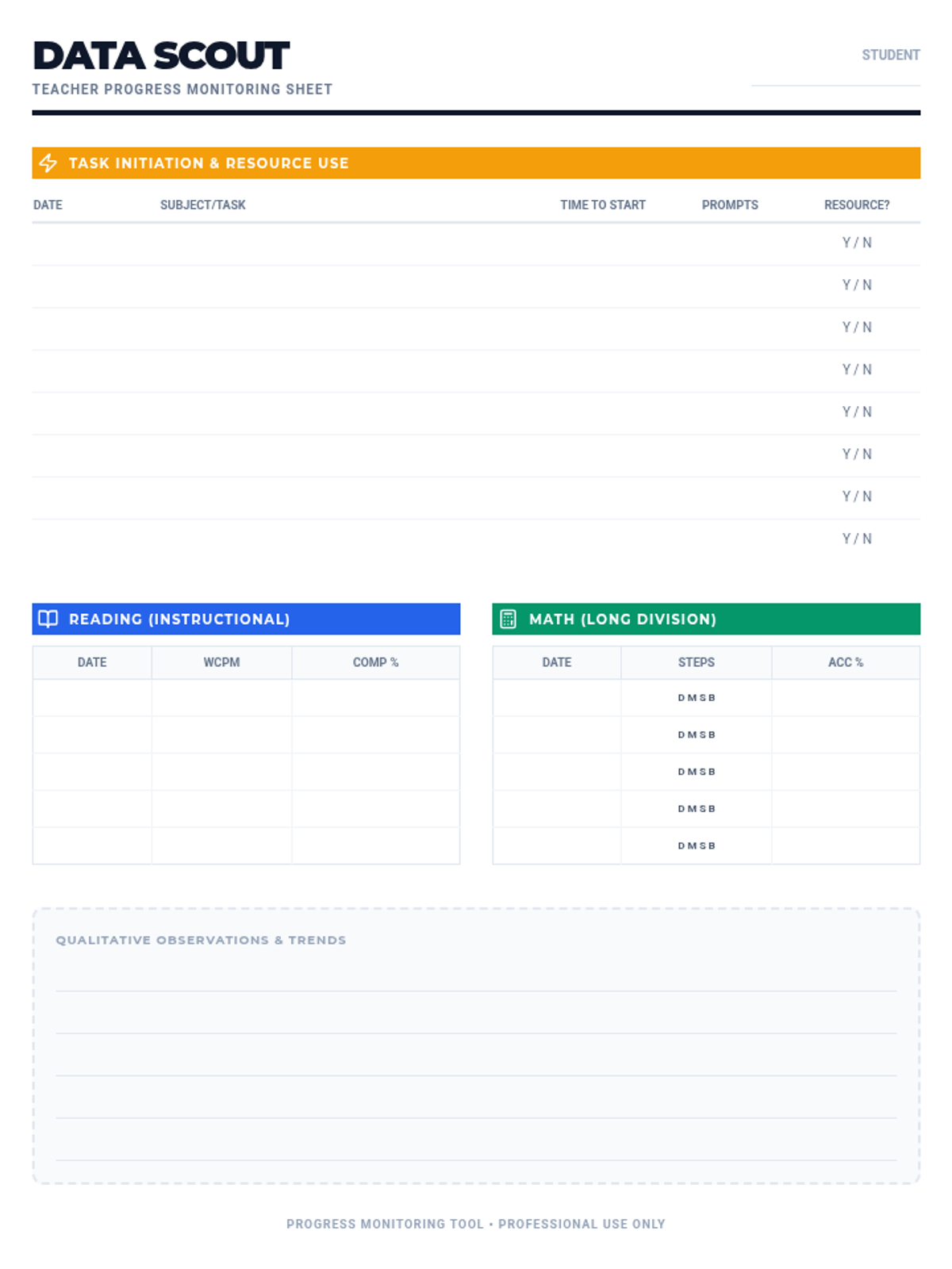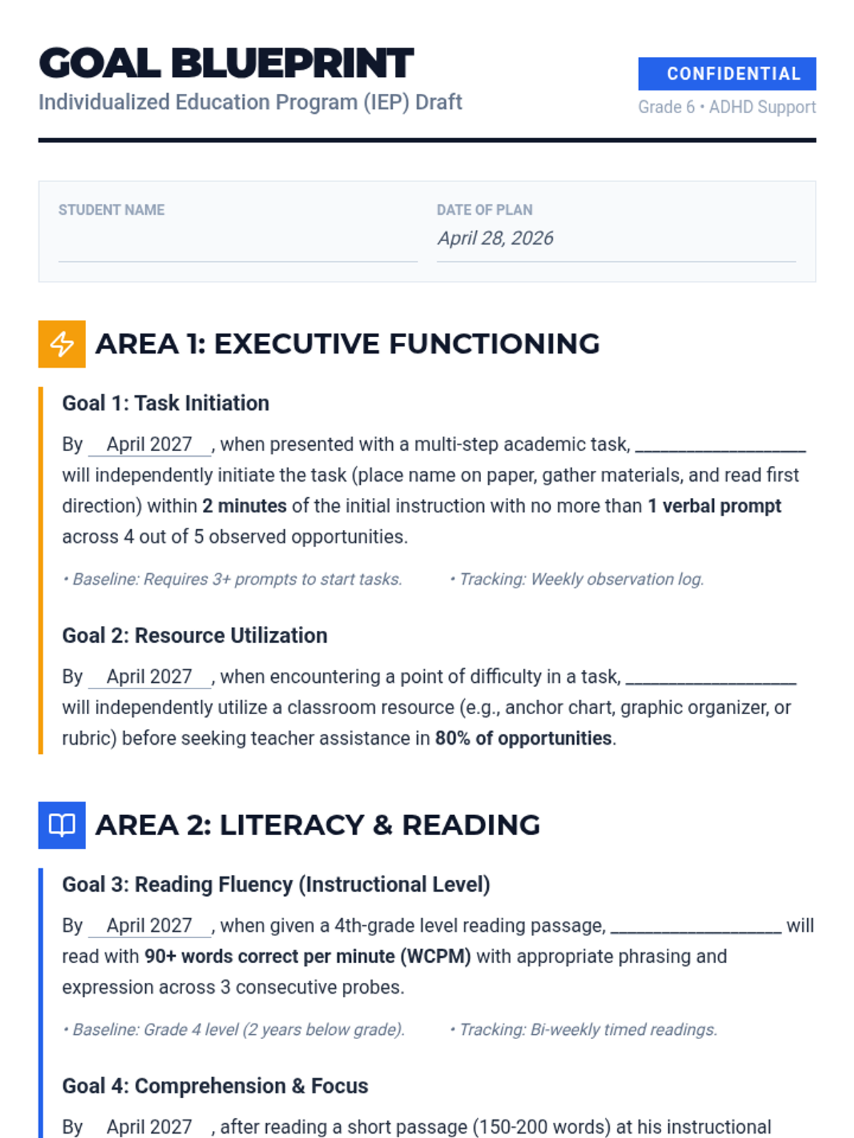 Focused resources to implement and track IEP goals for reading, math, and executive functioning for a 6th-grade student with ADHD.
