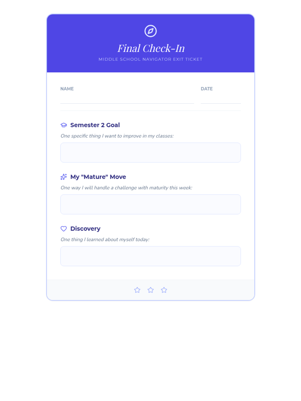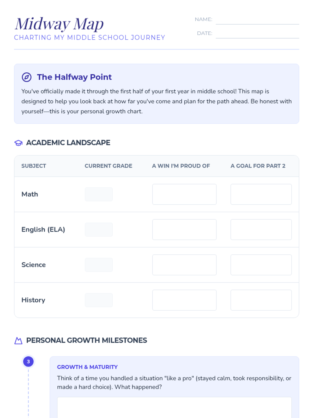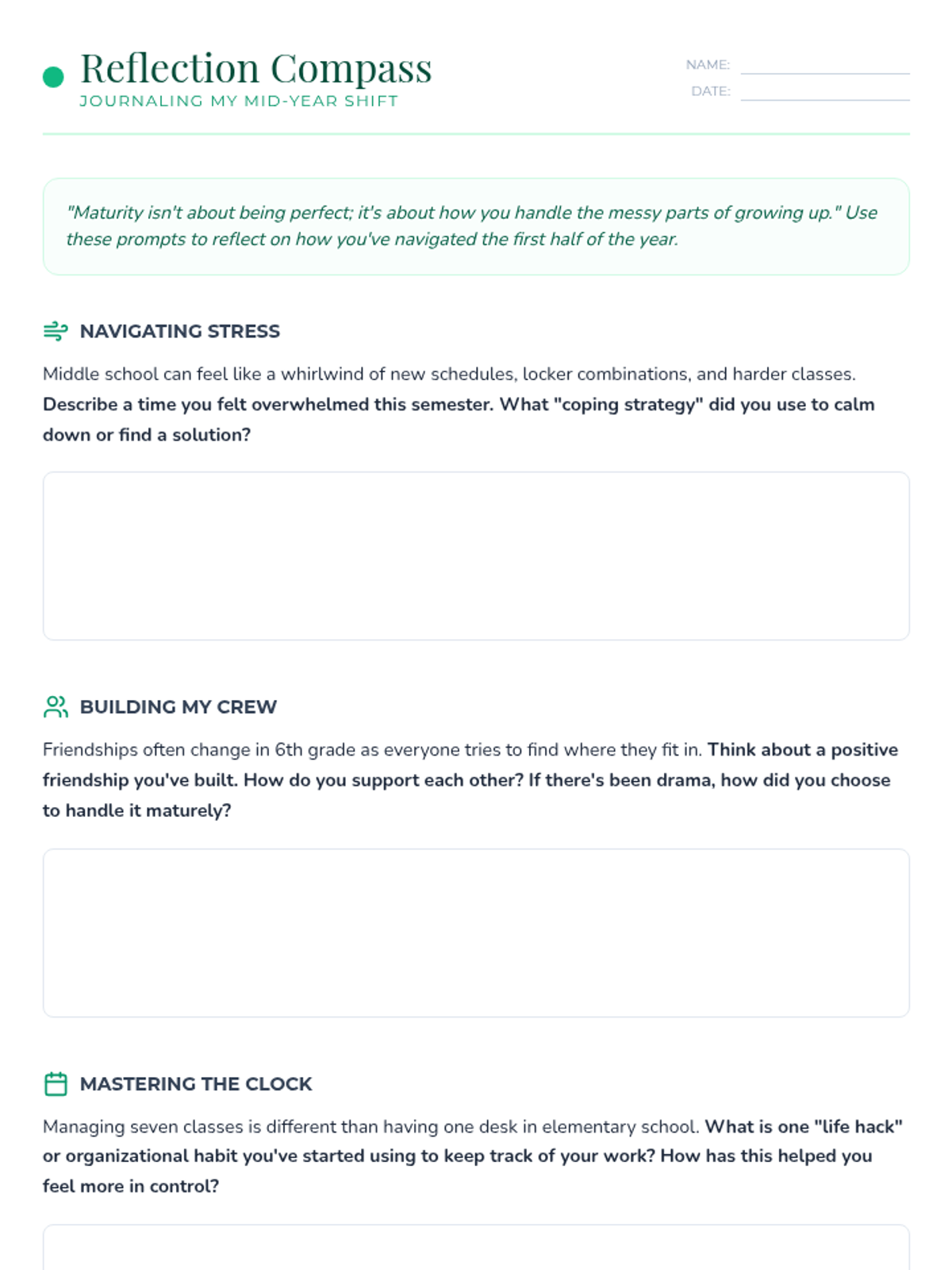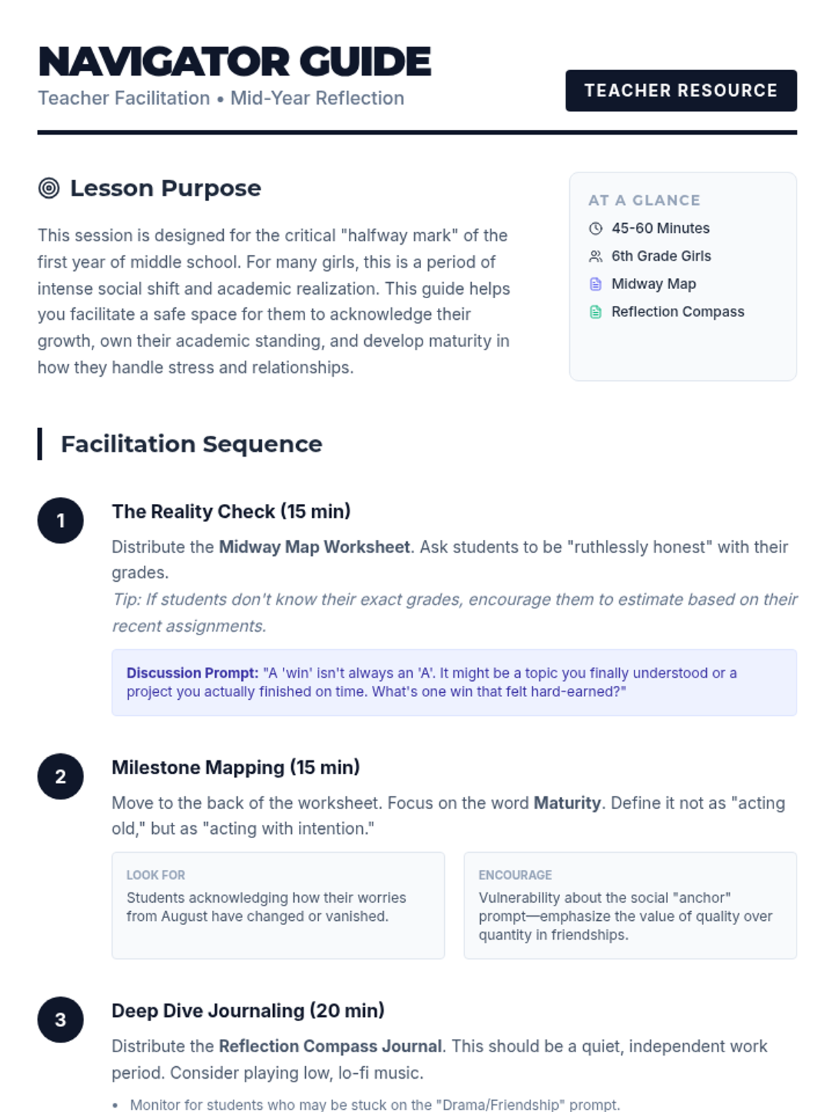 A reflective lesson designed for first-year middle school girls to assess their academic progress and social-emotional growth at the halfway point of the school year. Focuses on grades, maturity, stress management, and peer relationships.
