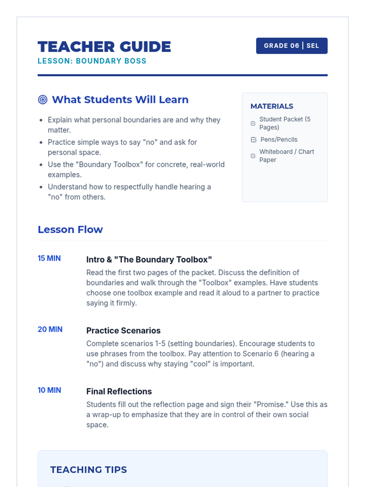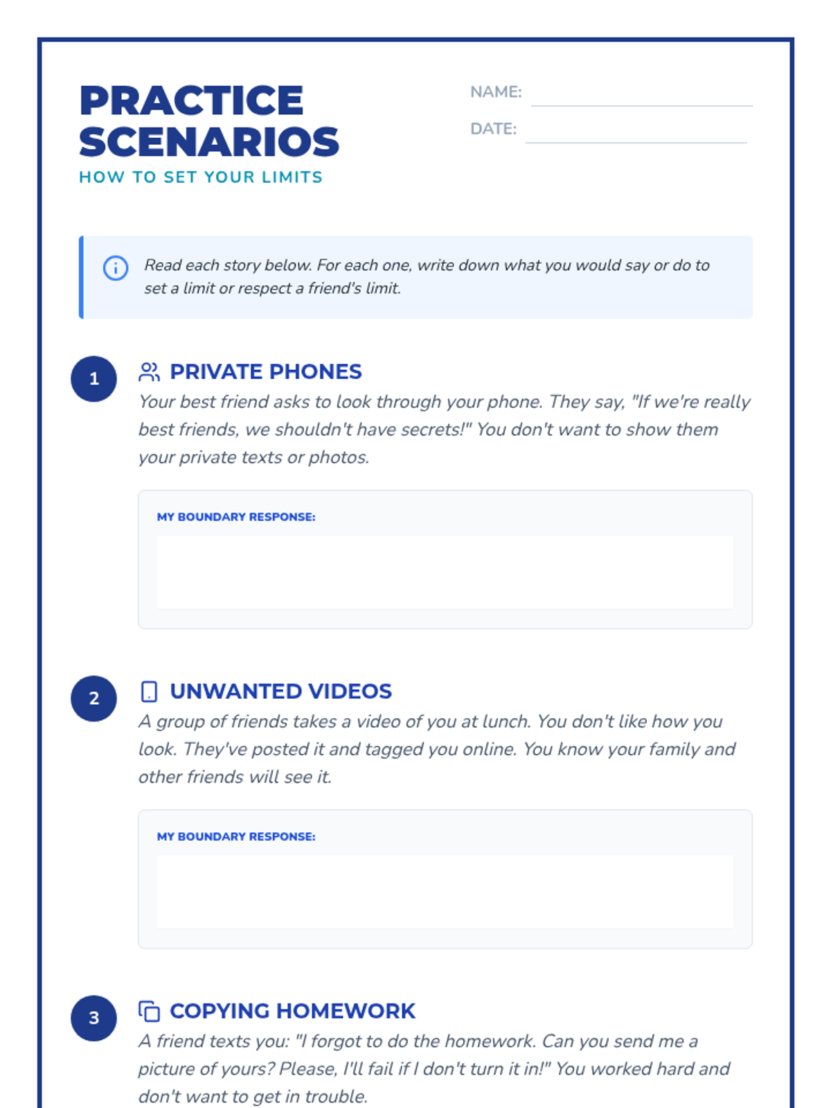 A comprehensive set of worksheets for 6th graders to understand, practice, and reflect on personal boundaries in friendships and digital spaces.