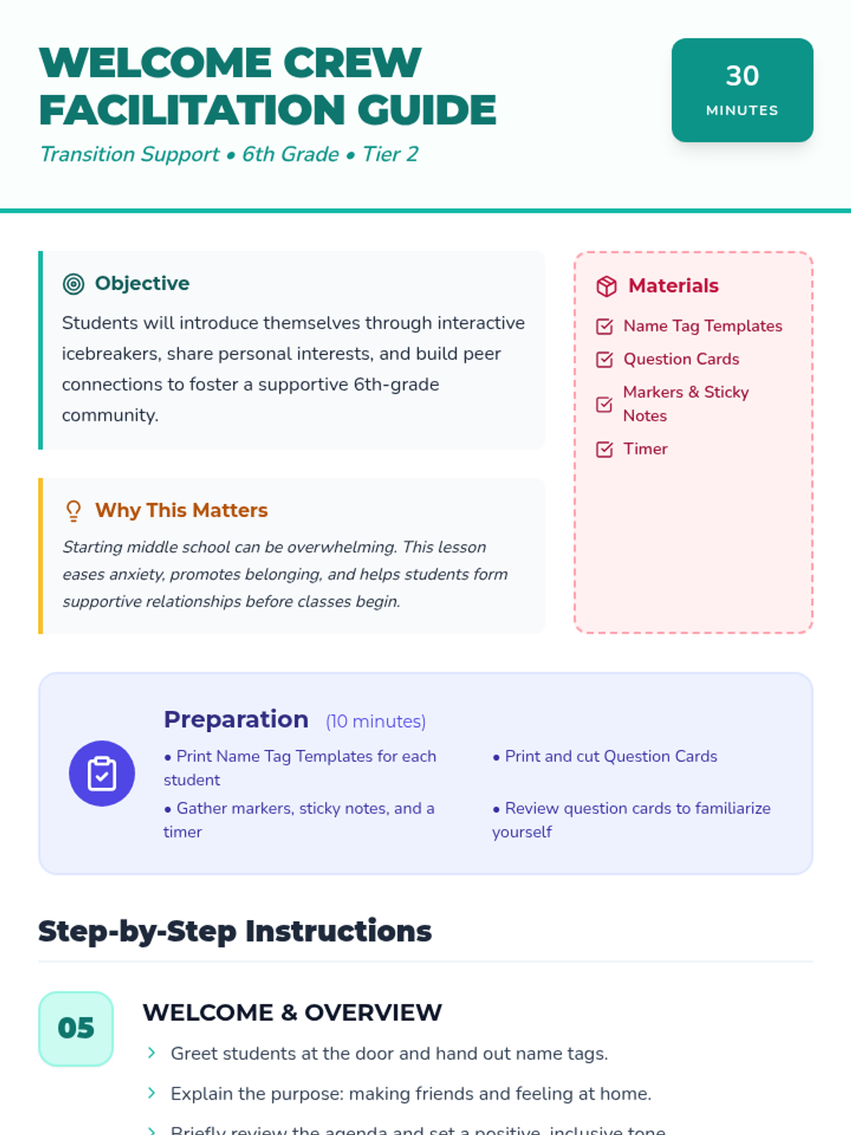 A fun, interactive 30-minute Tier 2 welcome-back session for 6th graders to build connections, ease transitions, and foster belonging in their new middle school environment.