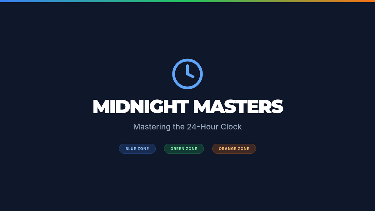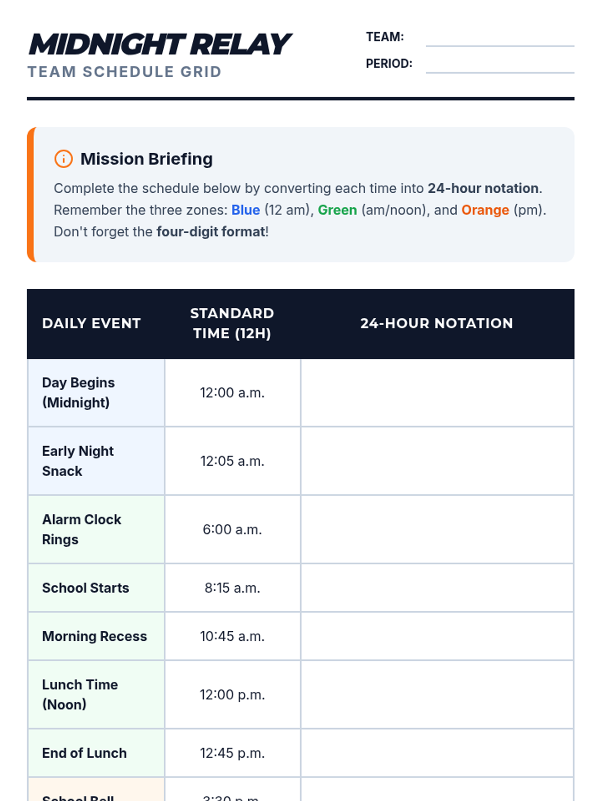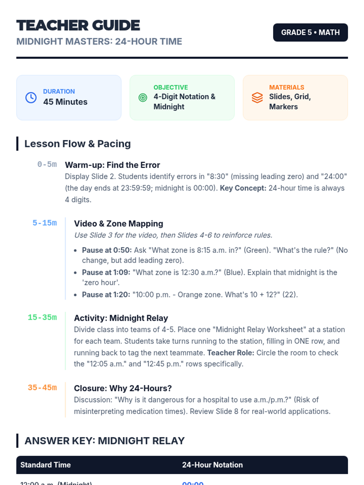A comprehensive lesson on 24-hour time notation for 5th graders, focusing on the four-digit format, leading zeros, and the 'midnight case' (00:00). Includes a video-based presentation, a team relay activity, and detailed teacher instructions.