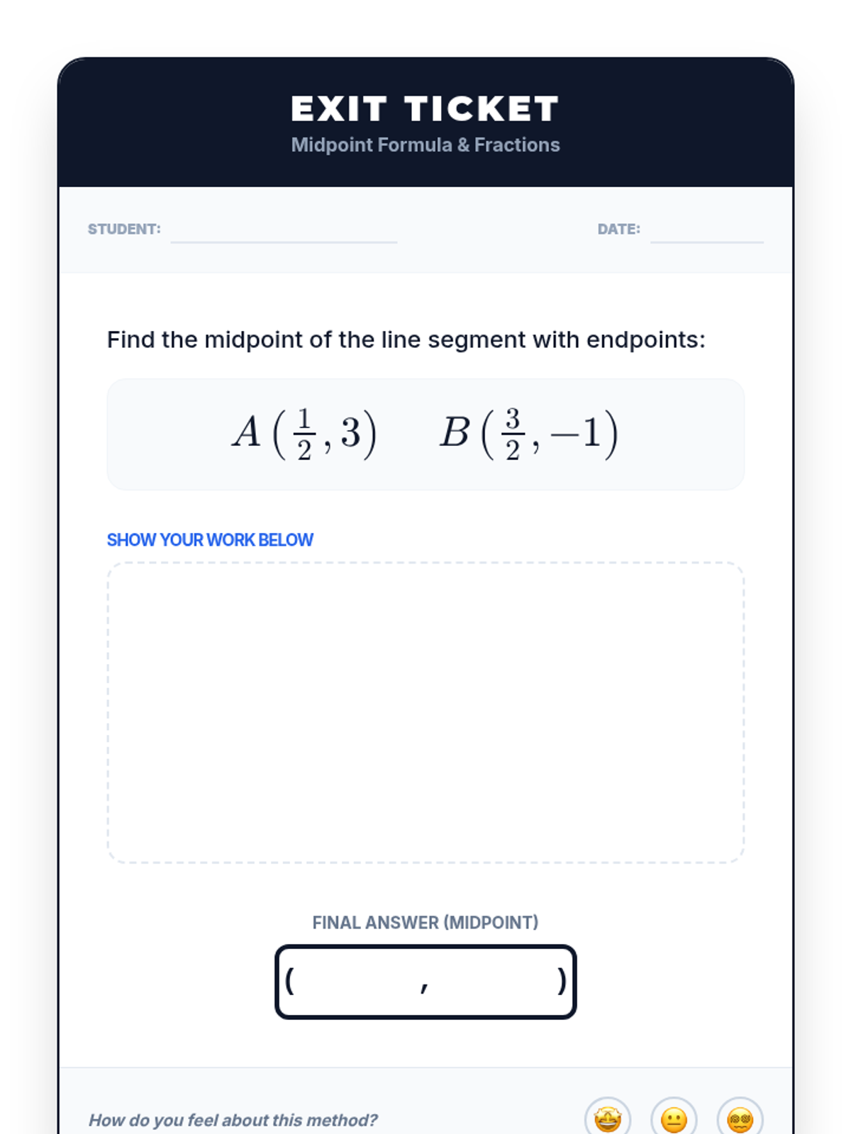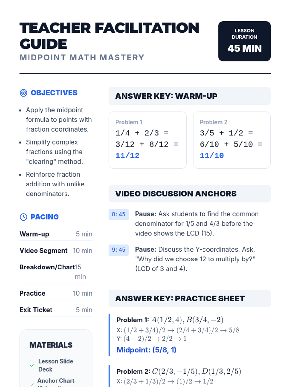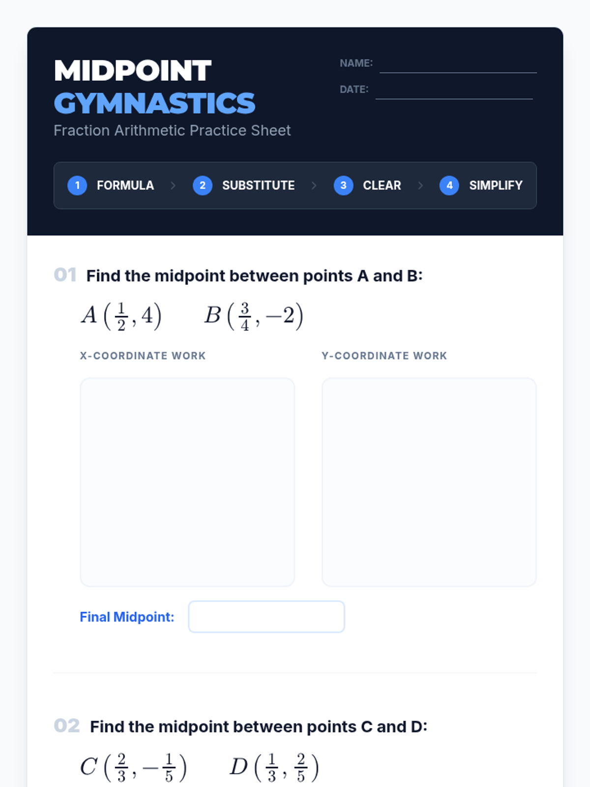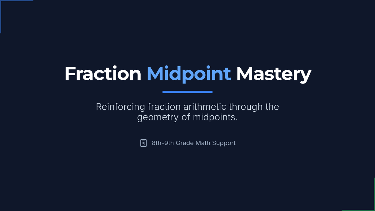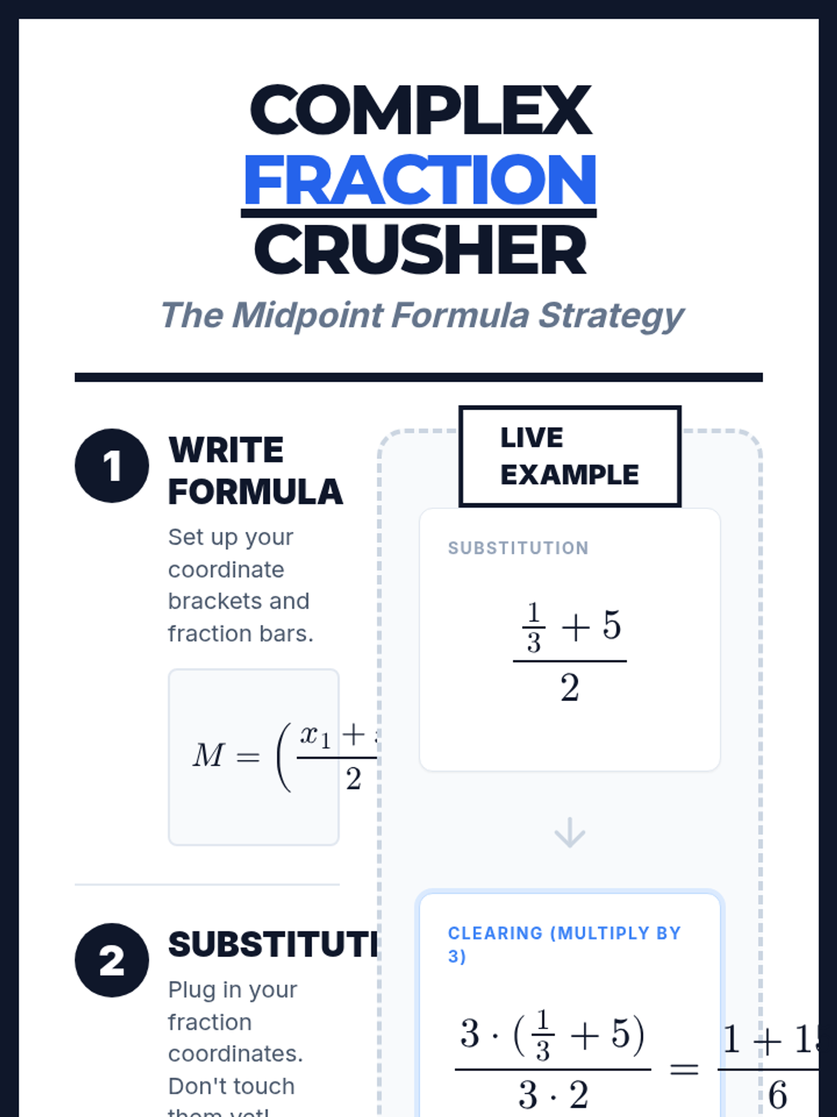 A specialized math support lesson that uses the Midpoint Formula to reinforce fraction arithmetic, specifically finding common denominators and simplifying complex fractions.