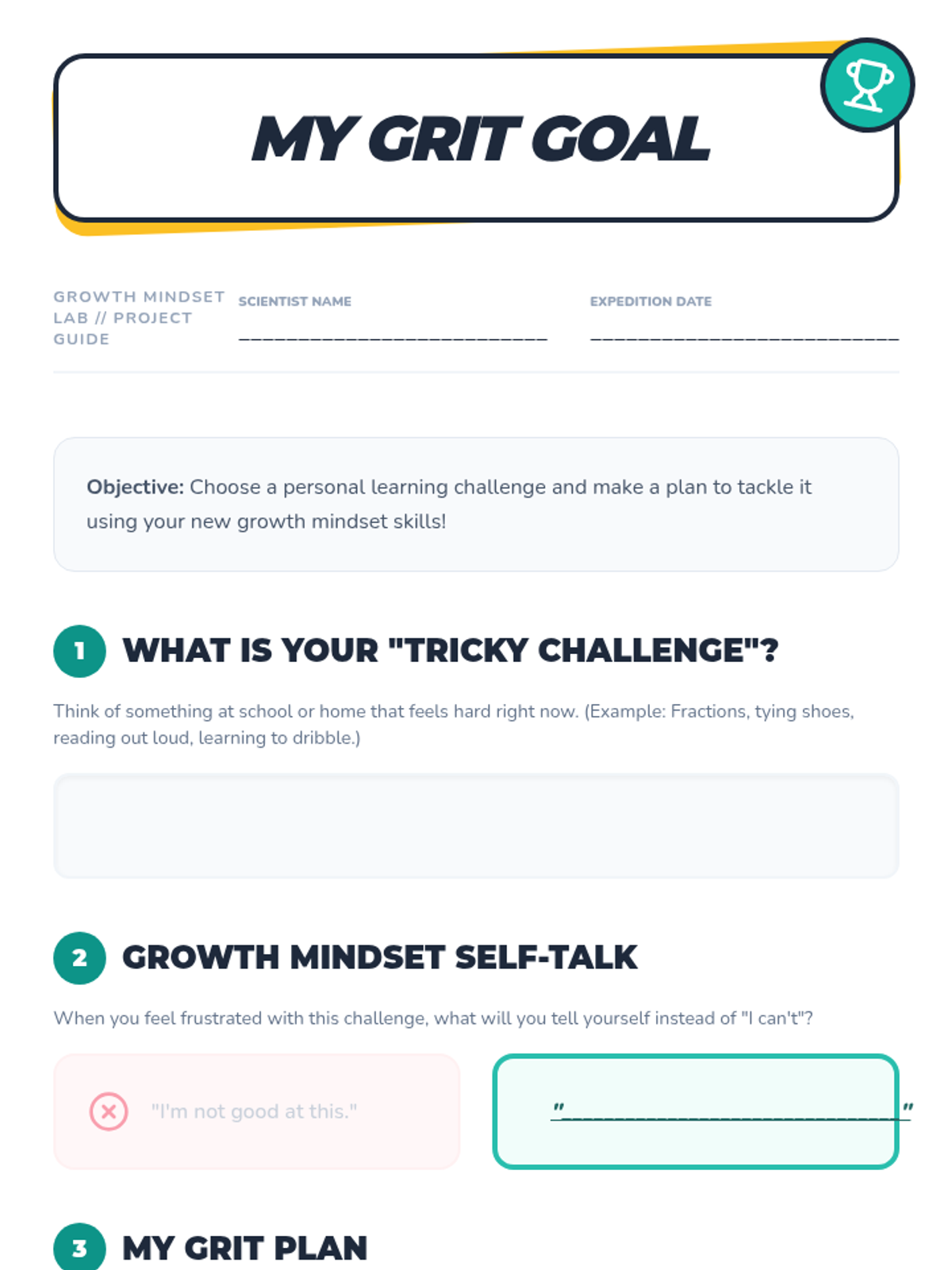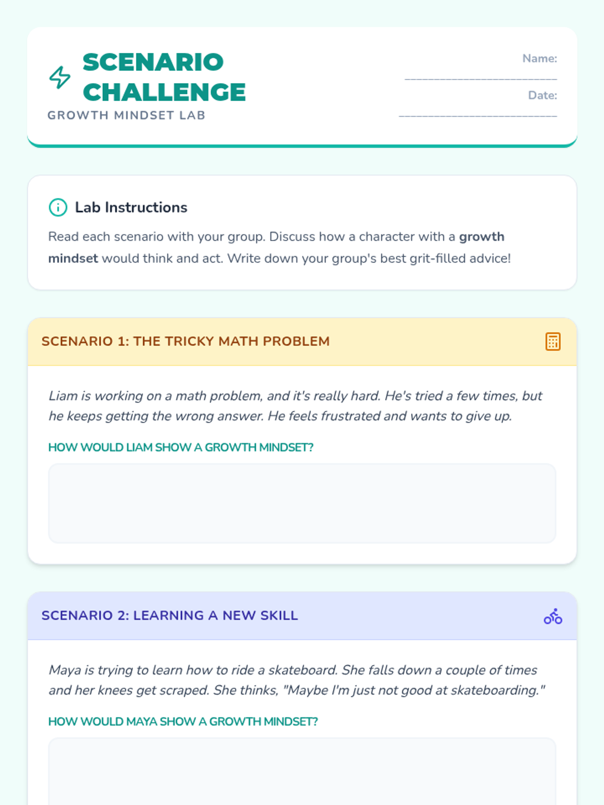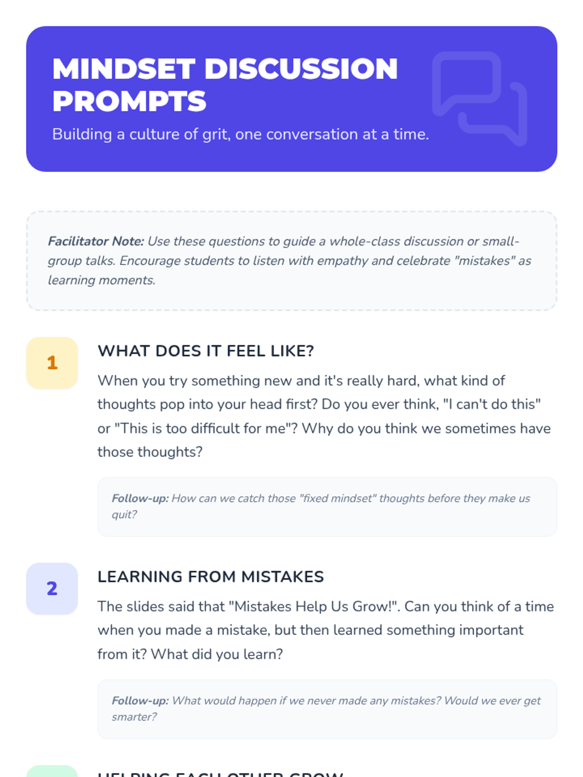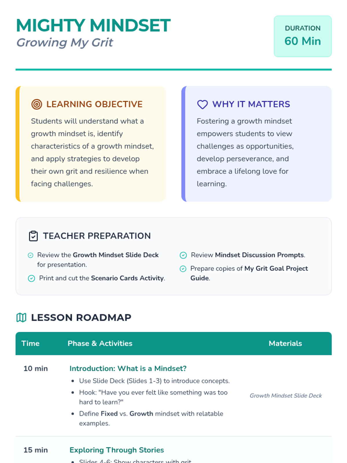 A 60-minute lesson for 3rd graders on developing a growth mindset, using stories, scenarios, and goal-setting to build resilience.