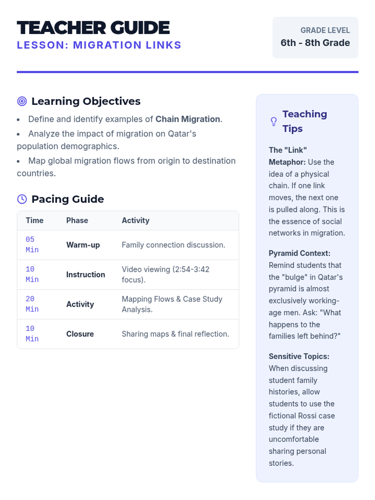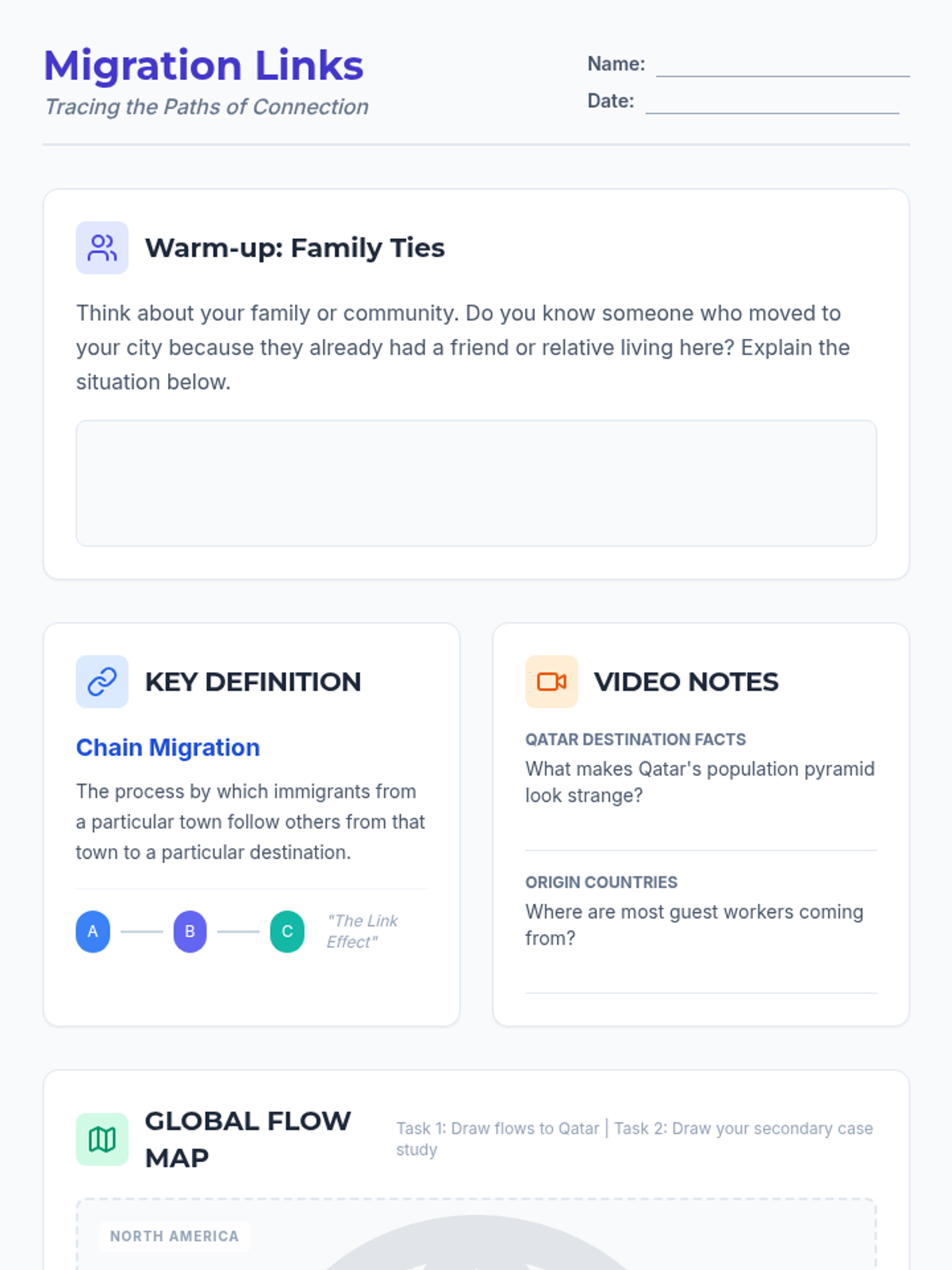 This lesson explores the concept of chain migration, focusing on how personal connections shape global movement patterns, using Qatar as a primary case study. Students will analyze population pyramids, watch a video on migration types, and map global connections through case studies and peer interviews.