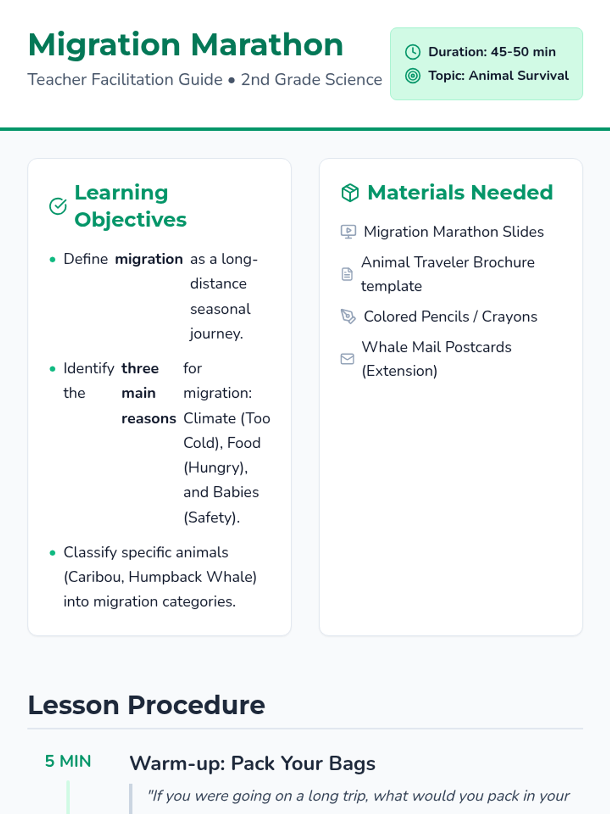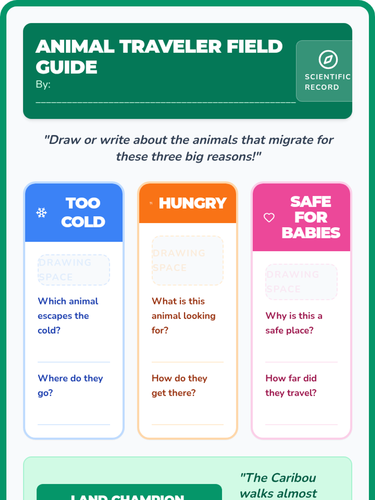 Students explore the concept of animal migration, identifying the three primary reasons animals travel long distances (climate, food, and safety for babies) through a SciShow Kids video and a creative brochure activity.