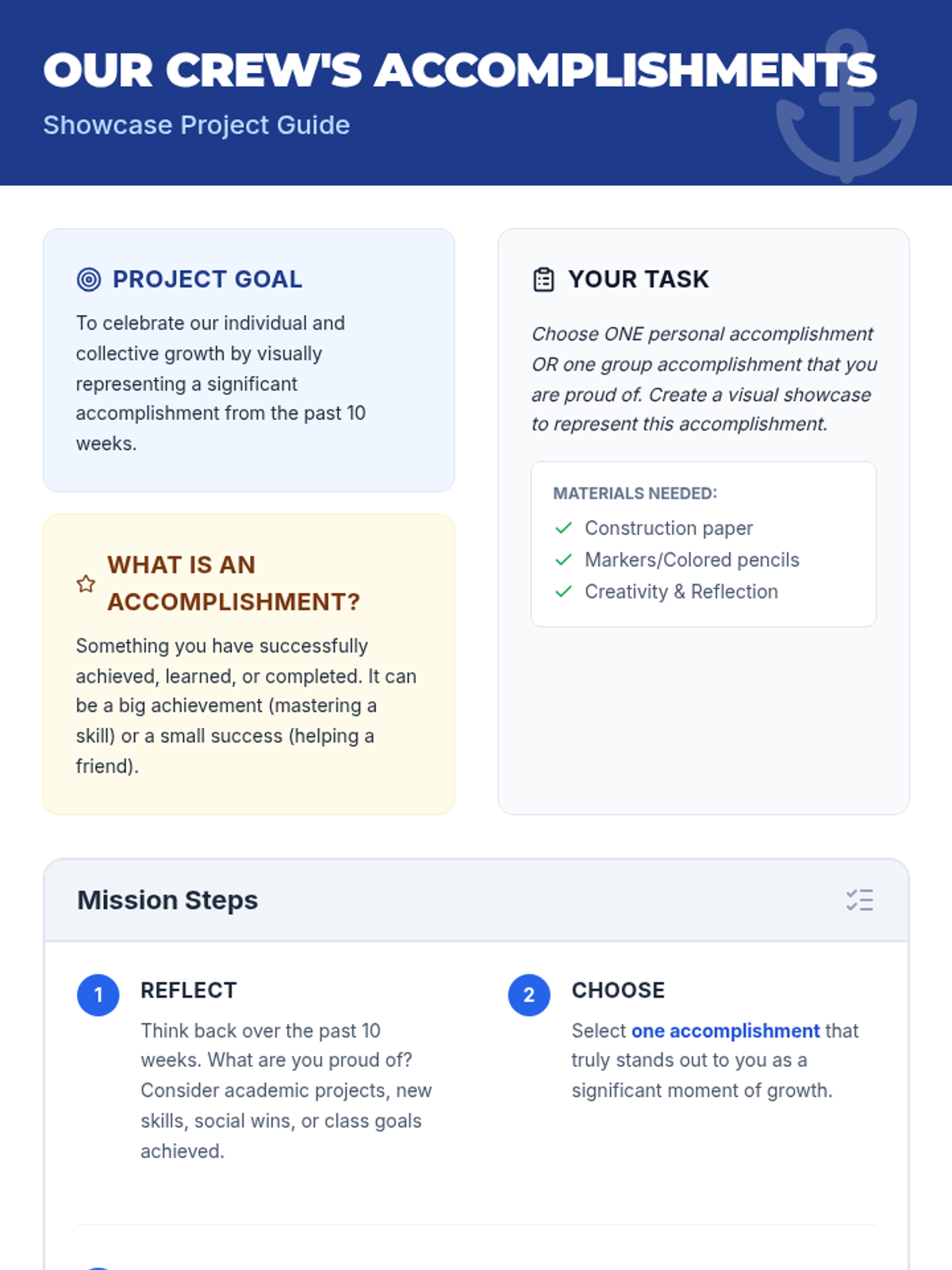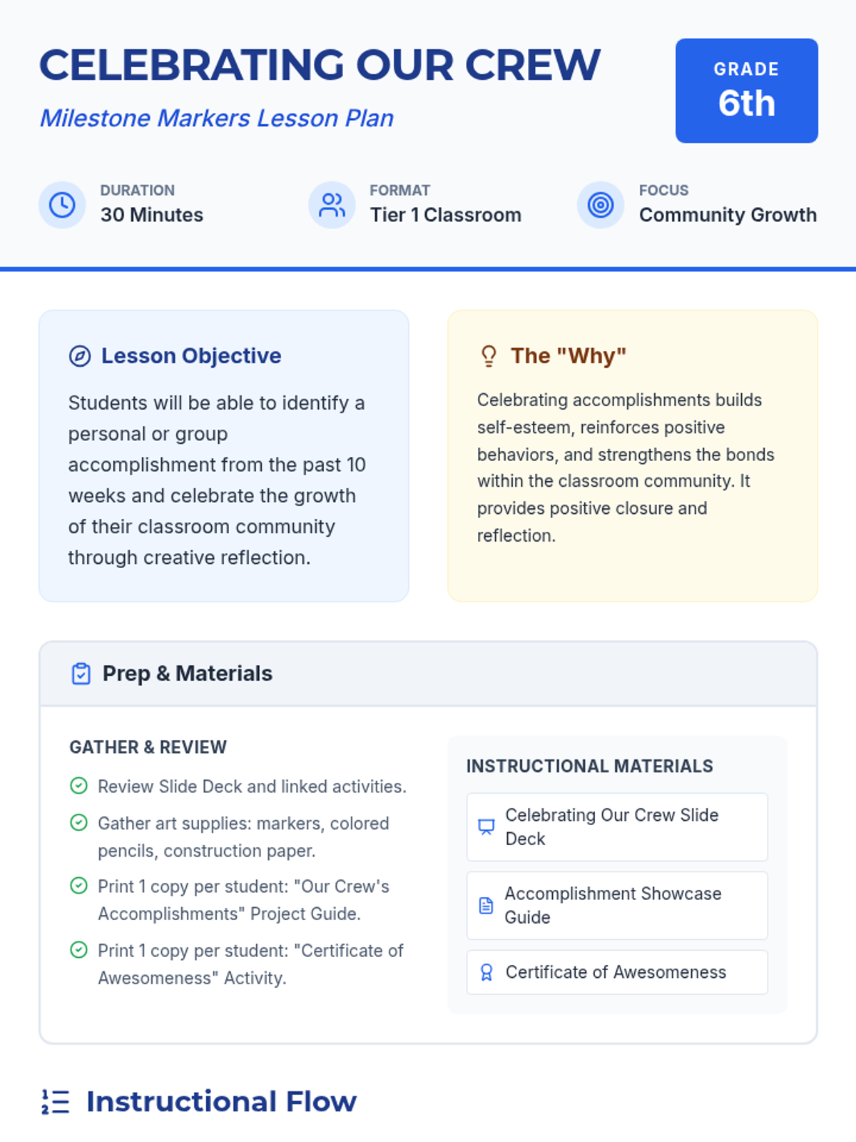 This lesson empowers 6th-grade students to reflect on and celebrate individual and collective accomplishments from the past 10 weeks, fostering a stronger classroom community. Through reflection and creative expression, students will acknowledge personal growth and contribute to a positive shared experience.