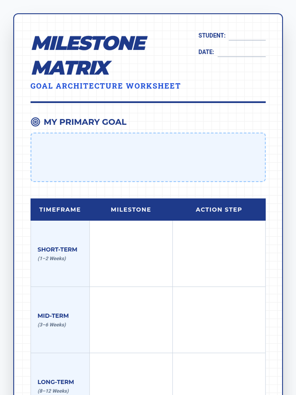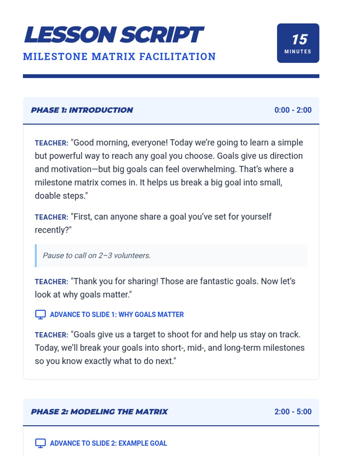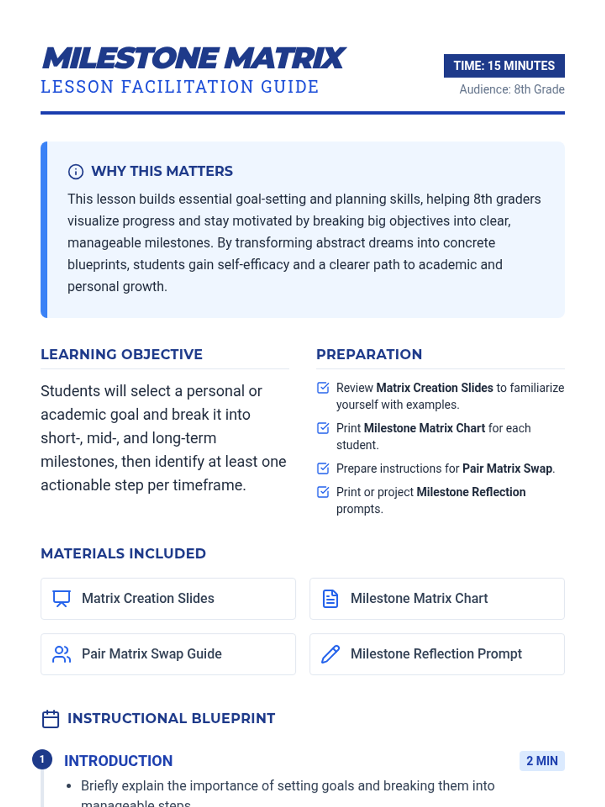 This 15-minute lesson equips 8th graders with goal-setting skills by teaching them how to break large objectives into short-, mid-, and long-term milestones. Students create a structured matrix and receive peer feedback to ensure their action steps are clear and achievable.